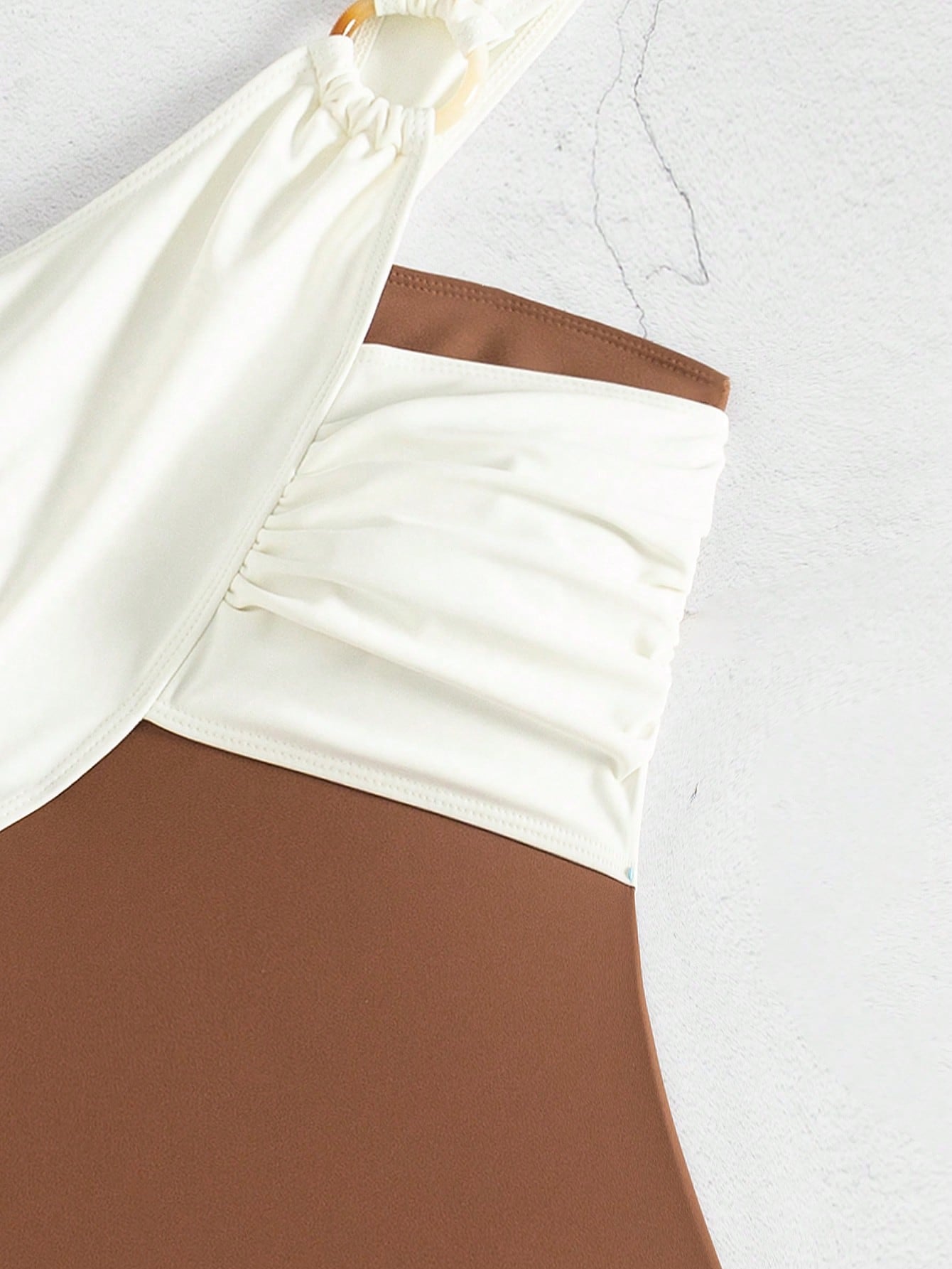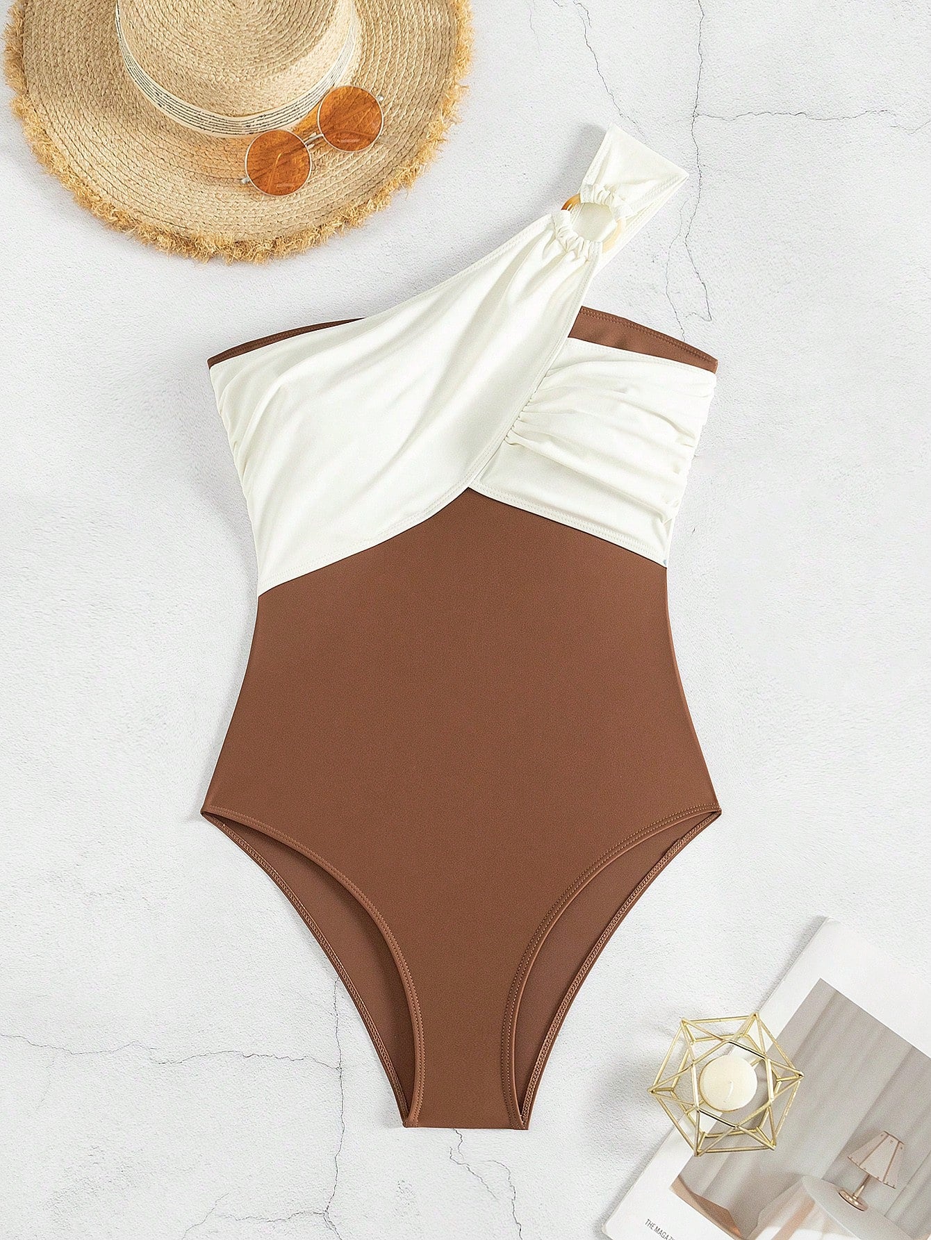 Swim Summer Beach Women's Color Block One Shoulder Sleeveless One-Piece Swimsuit