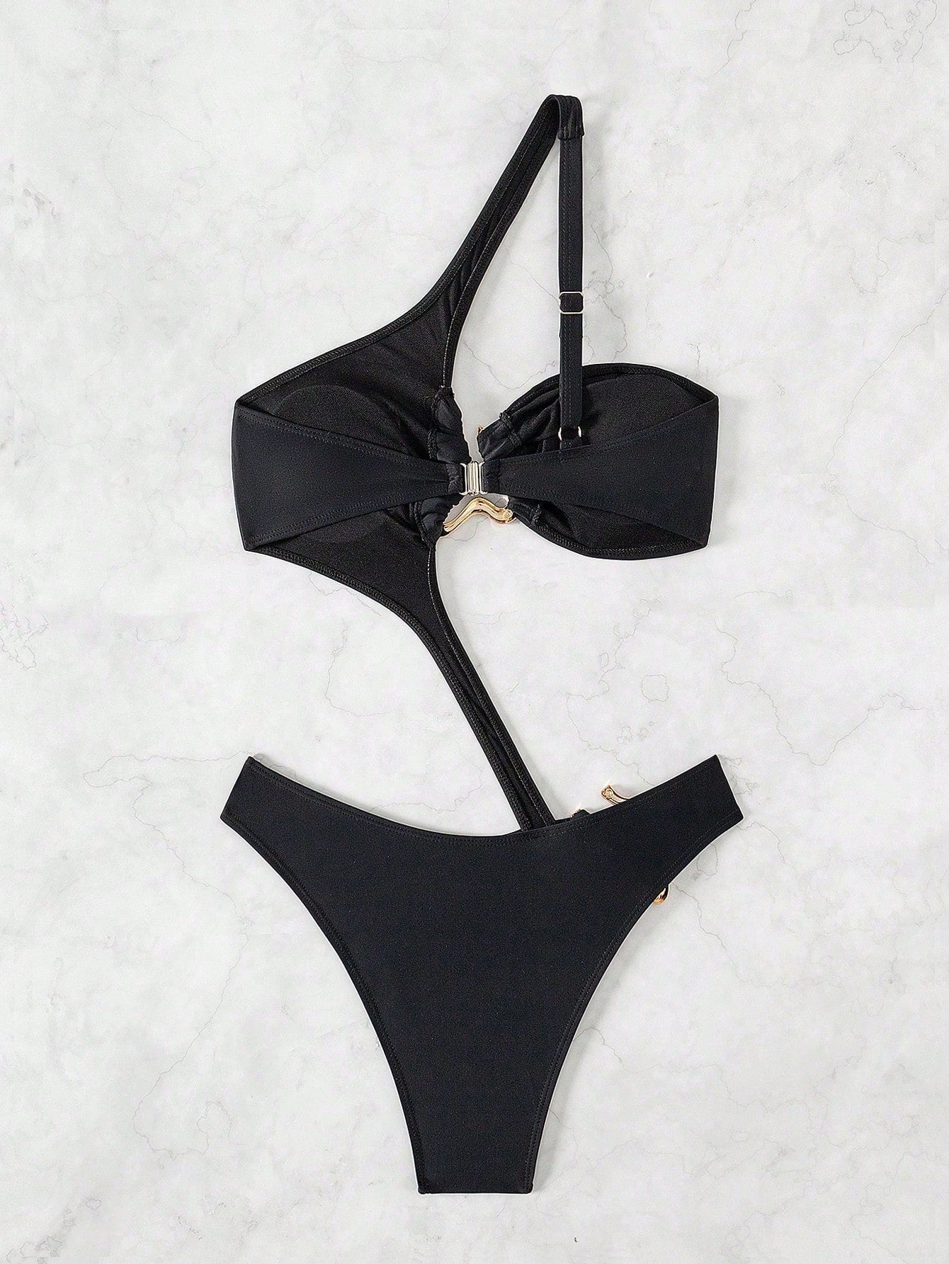 Swim SXY 1pc Women's Solid Metal Accent Asymmetrical Hollow-Out Sexy One-Piece Swimsuit Summer