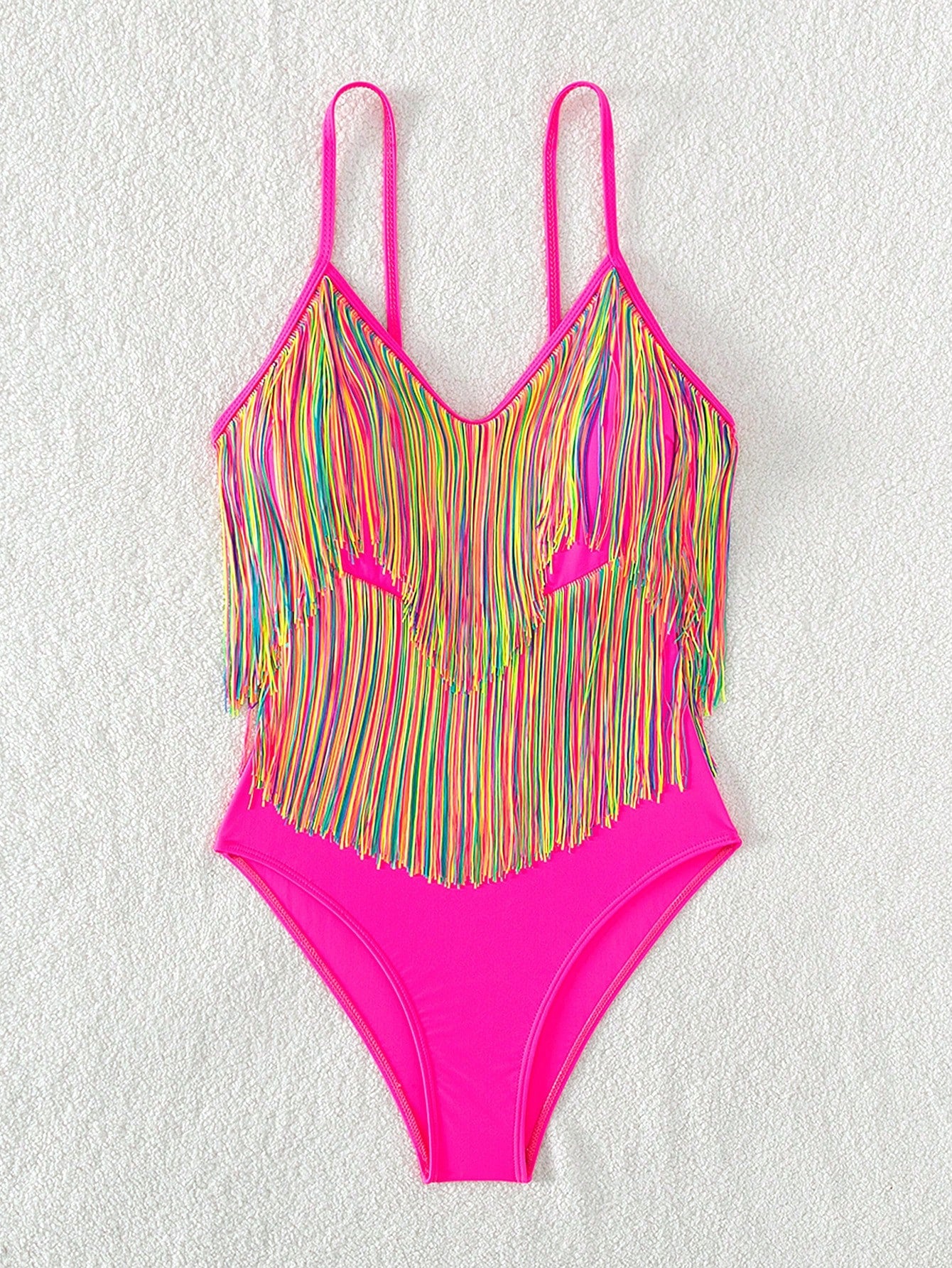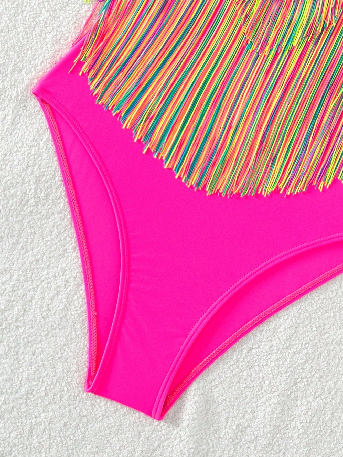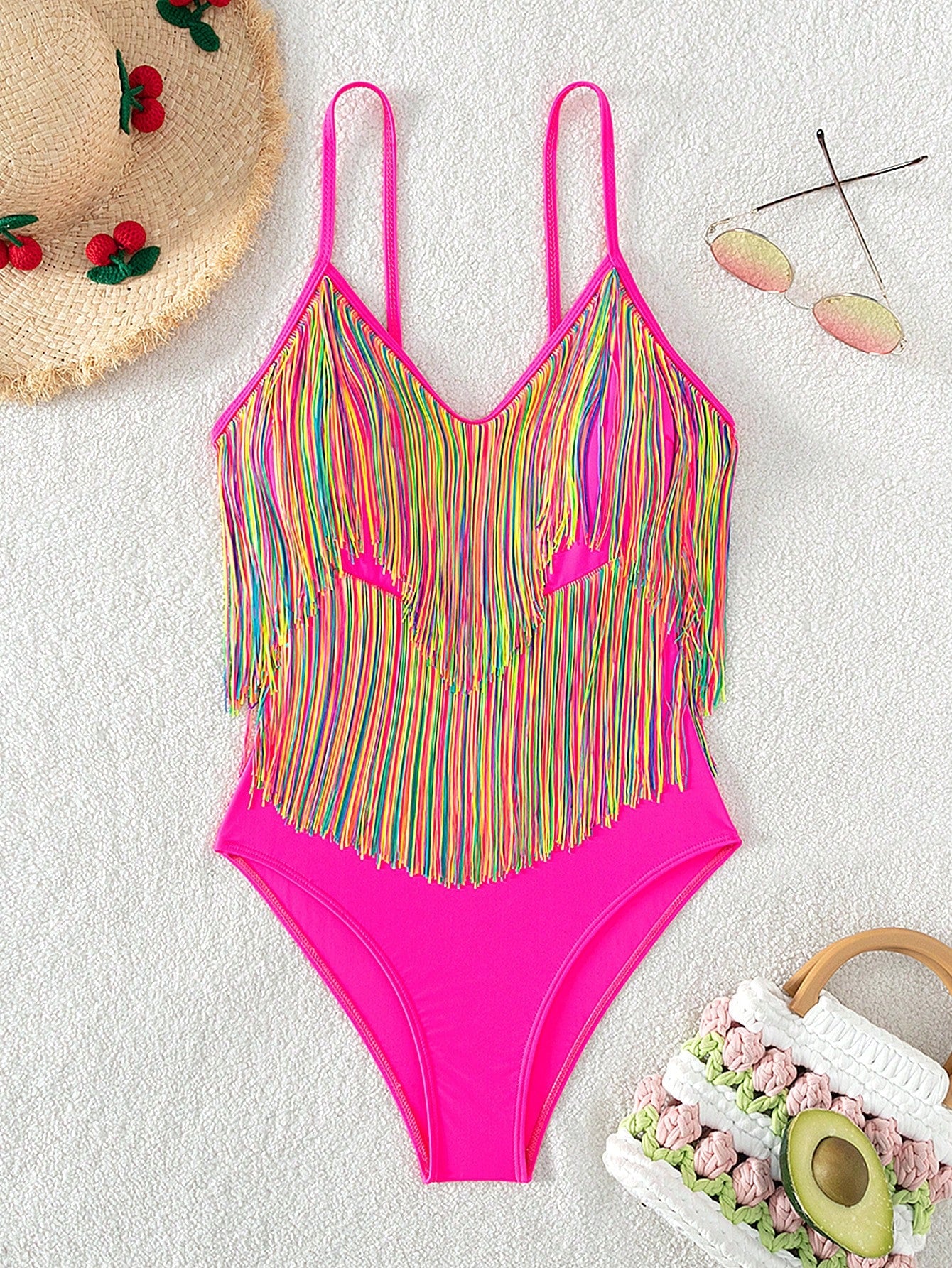 Swim Vcay Summer Beach Striped Fringe Hem One Piece Swimsuit
