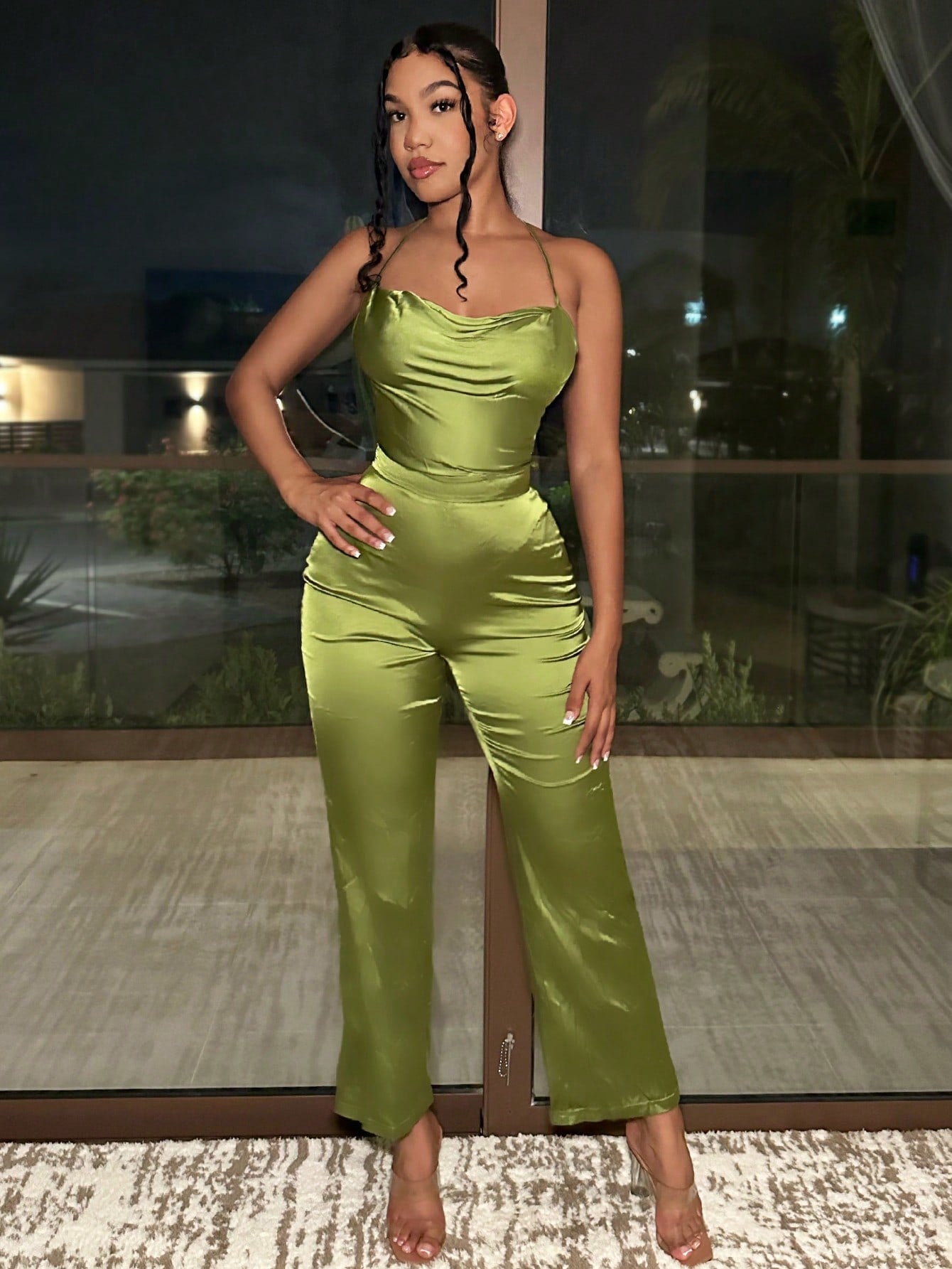 SXY Summer;Draped Collar Lace Up Backless Cami Jumpsuit