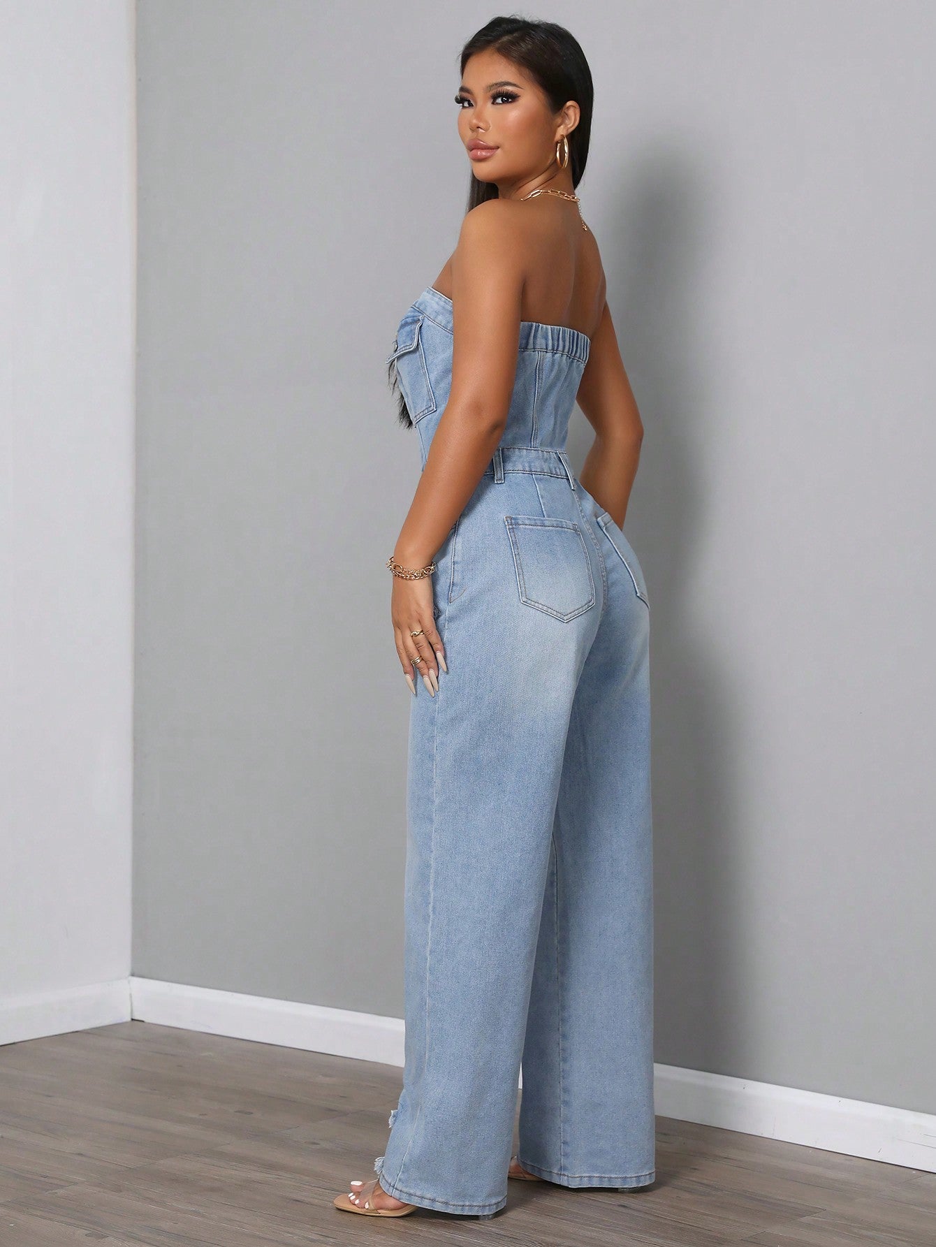 SXY Women Casual Washed Denim Jumpsuit With Frayed Hem