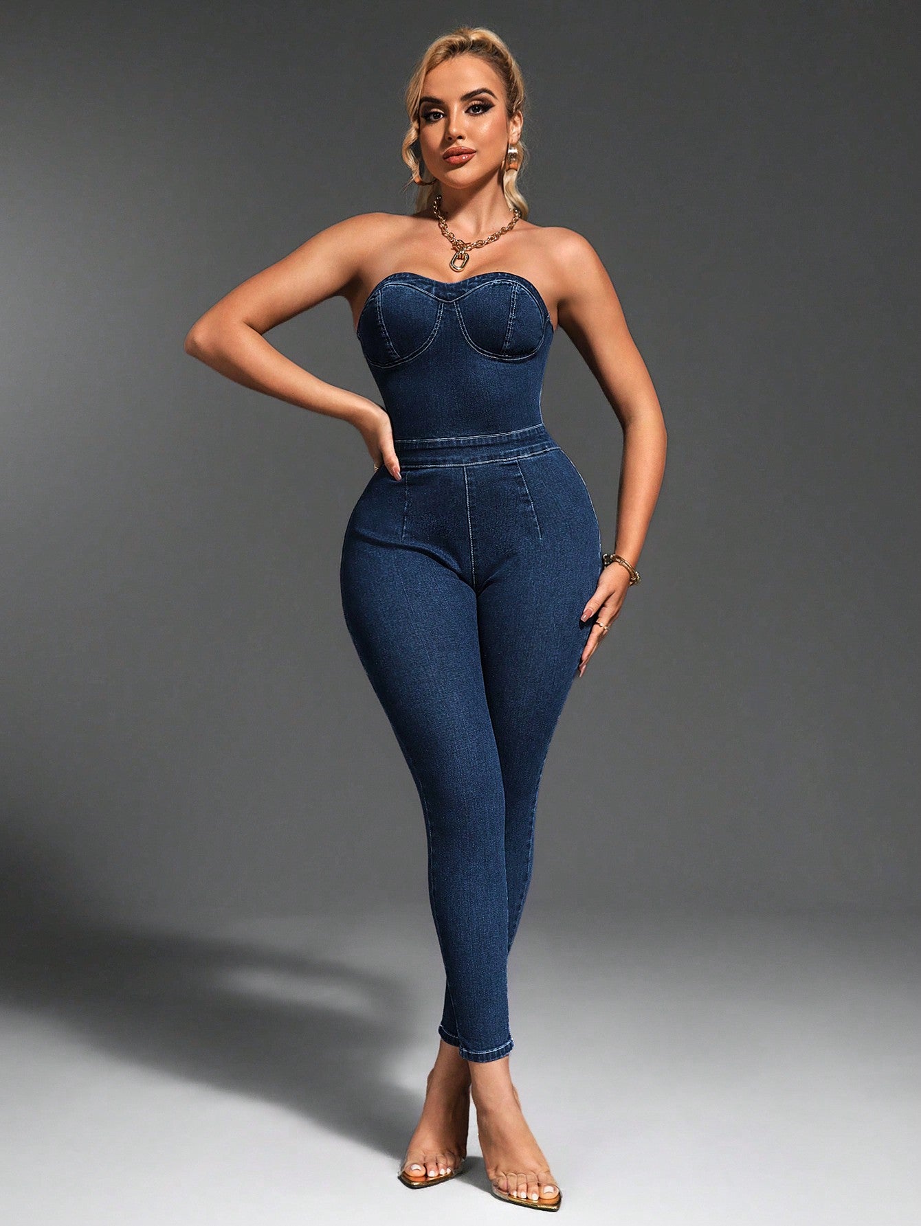 SXY Women's Solid Color Simple Backless Denim Jumpsuit