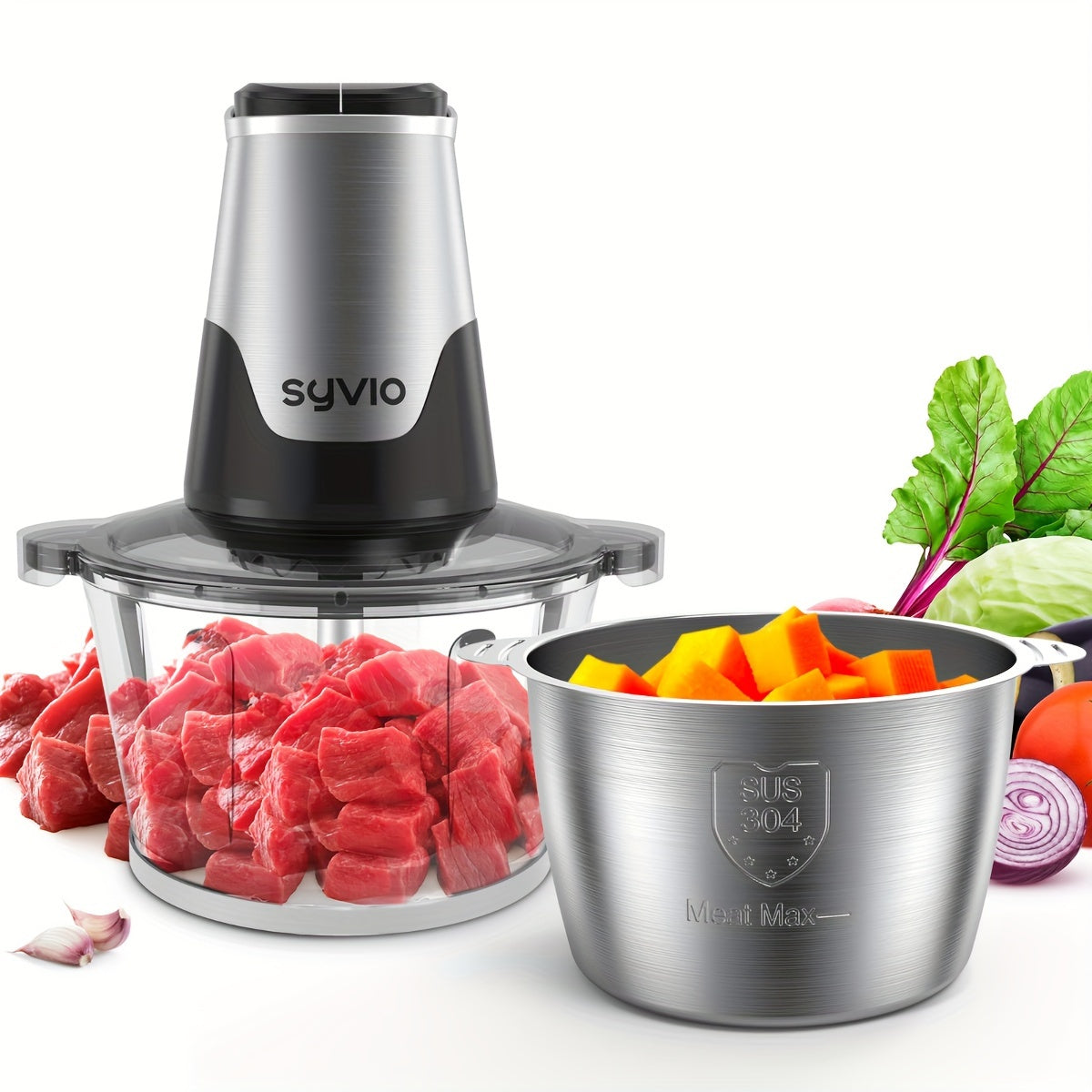 Syvio Food Processors With 2 Bowls, Meat Grinder 4 Bi-Level Blades, Mini Electric Food Chopper 400W, For Baby Food, Meat, Onion, Vegetables, 2 Speed, 8 Cup And 8 Cup