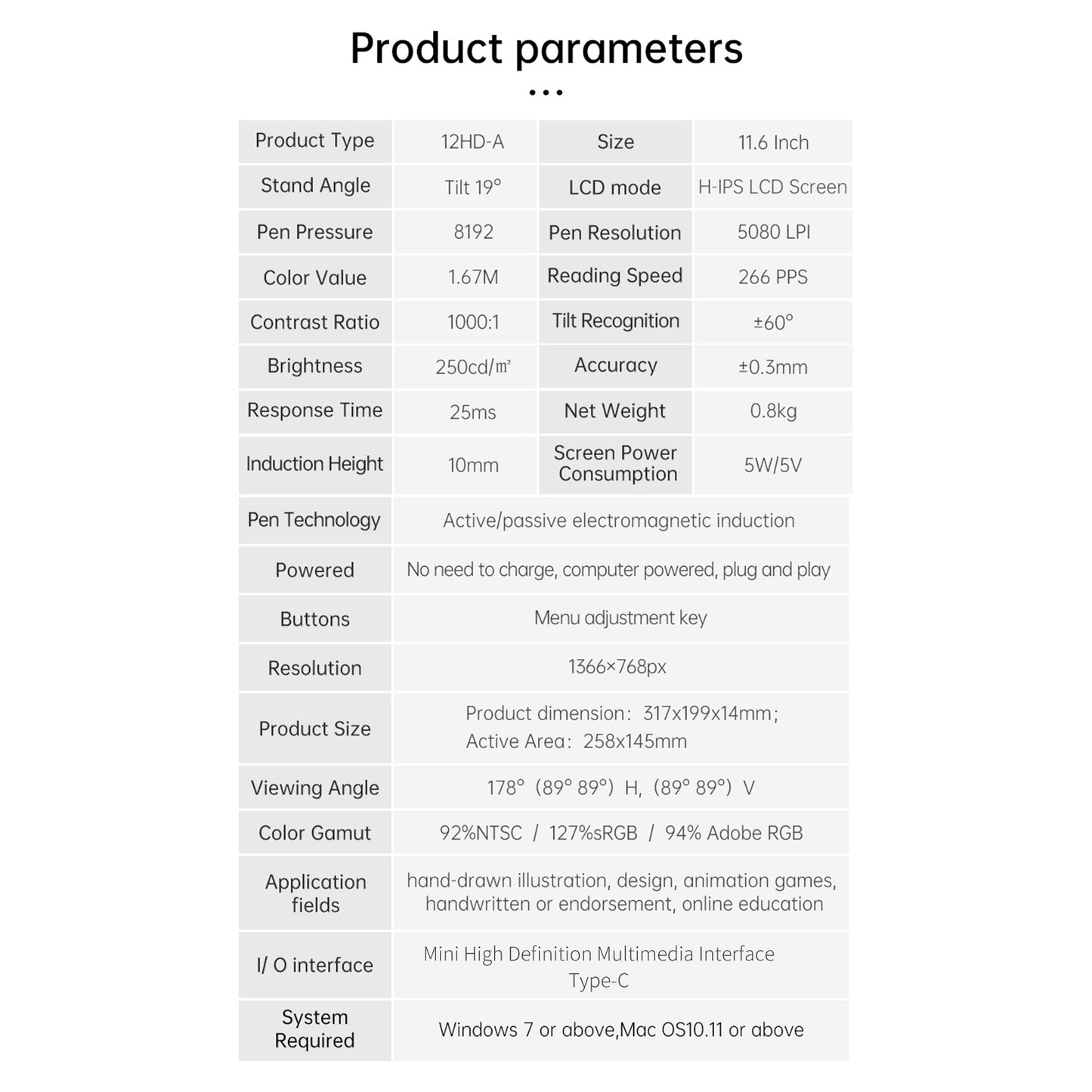 Tablette graphique 12HD A H IPS LCD Moniteur de tablette graphique de dessin 11,6 pouces Taille 1366X768 Affichage 8192 Niveaux de pression Technologie passive avec fonction d'inclinaison Prise en charge Windows Macos Alimentation USB Faible consommation