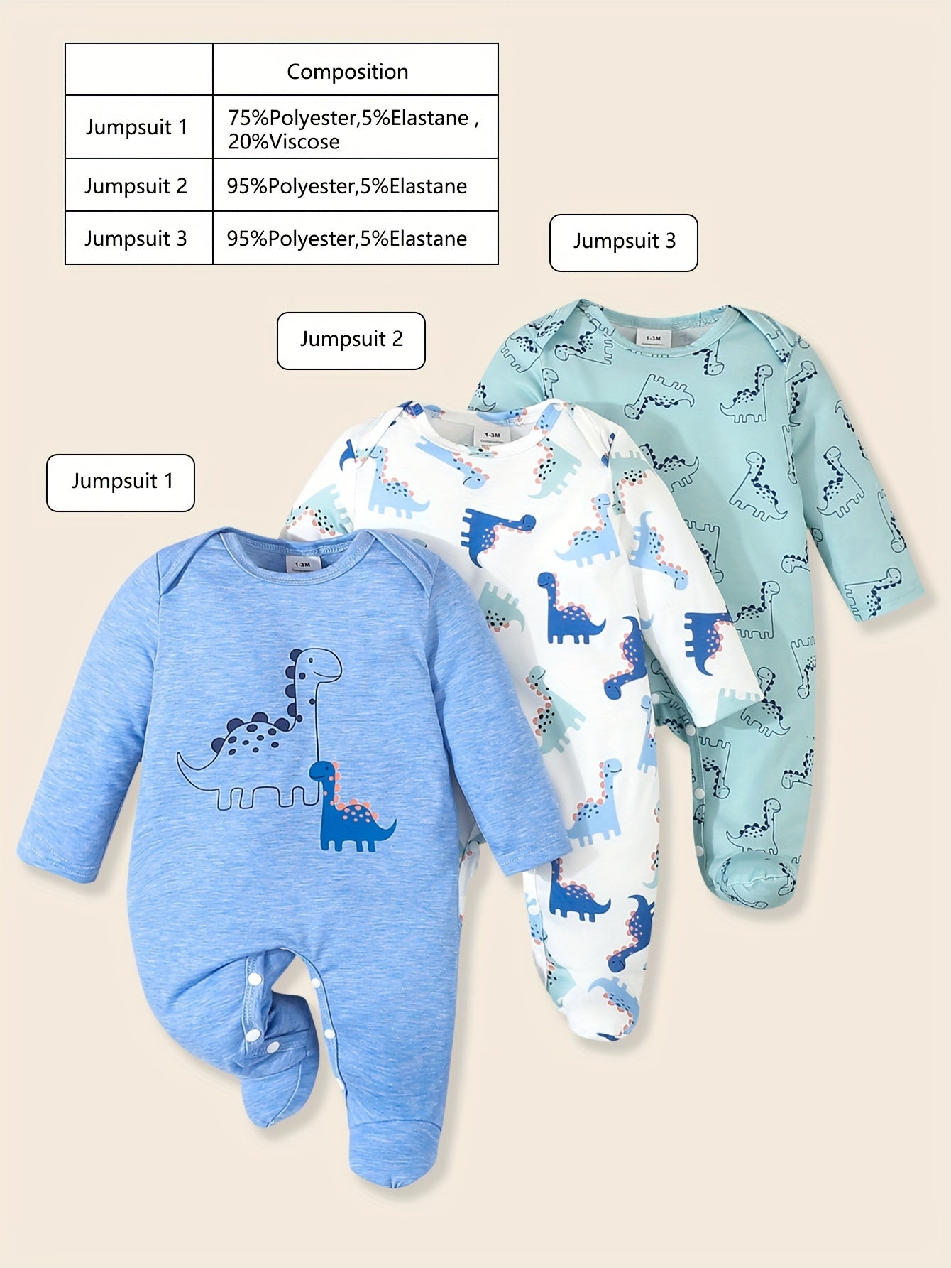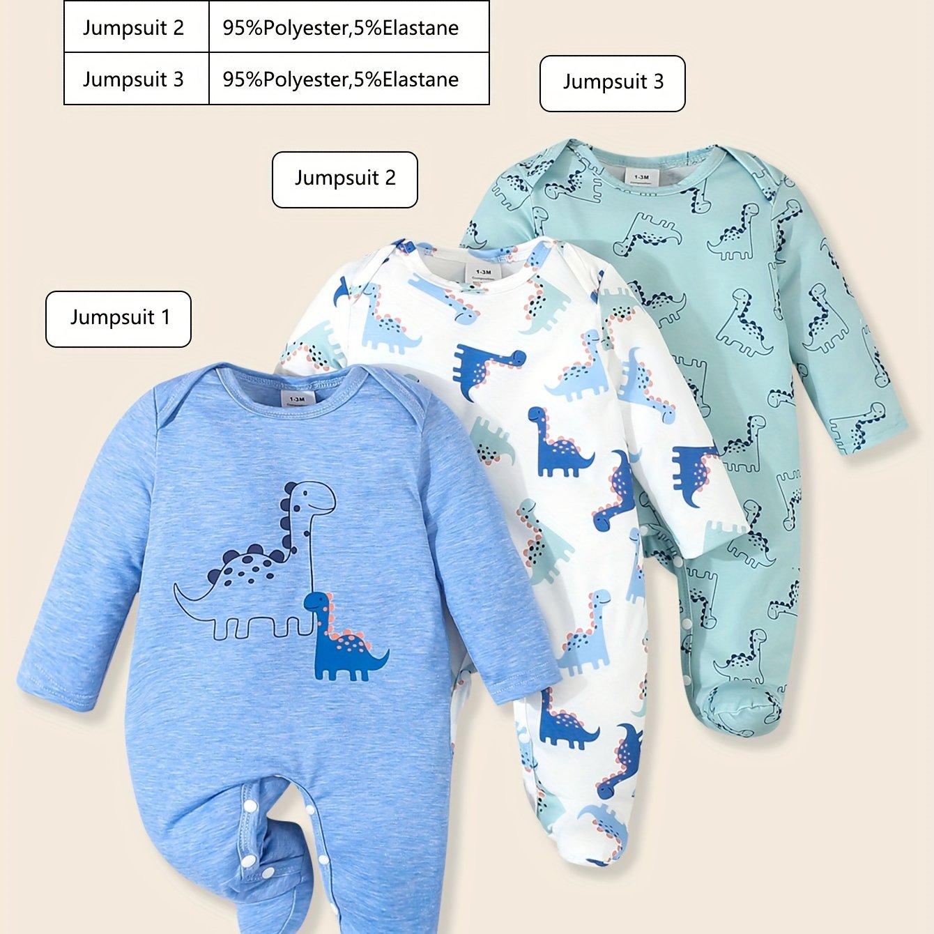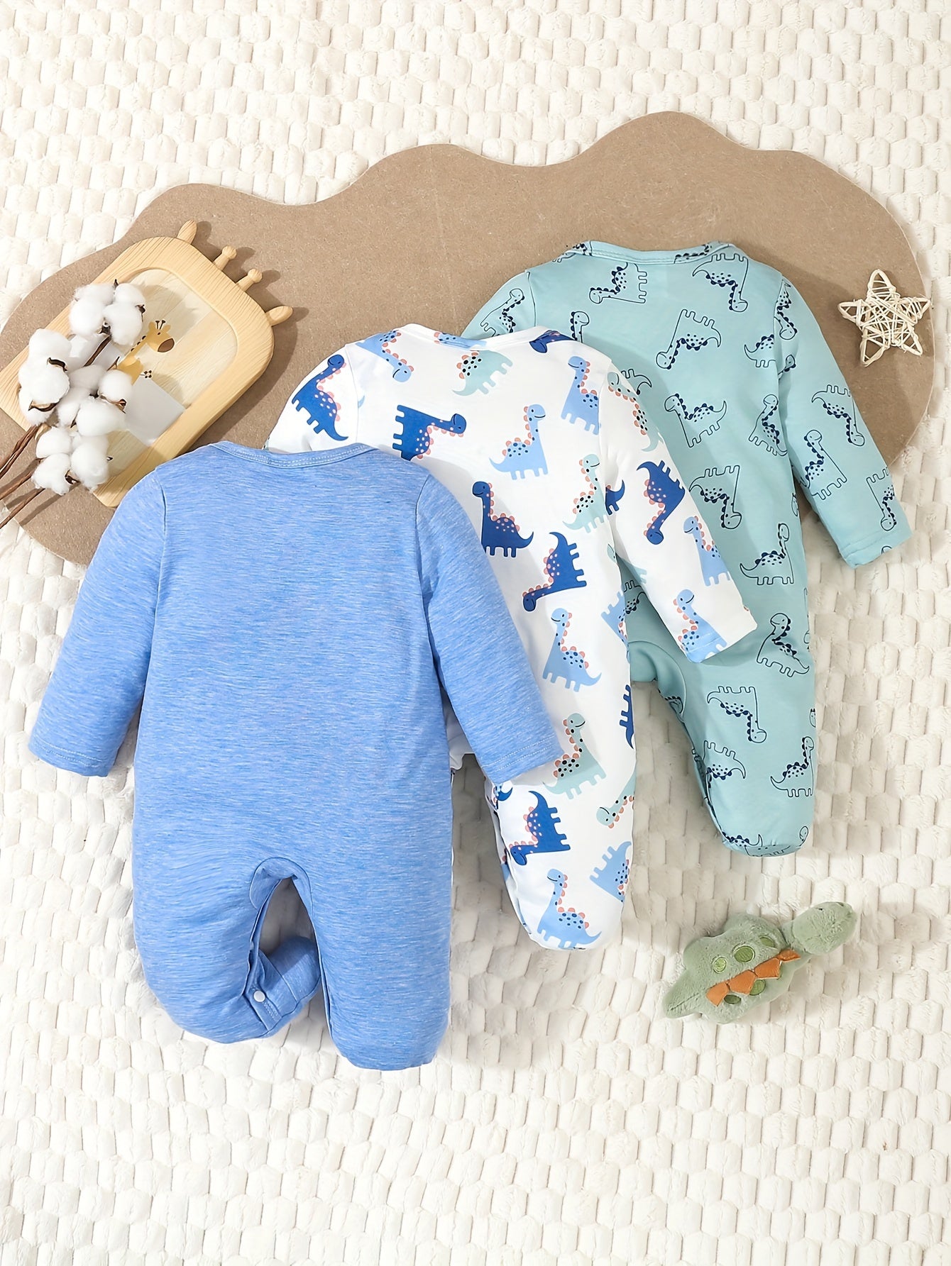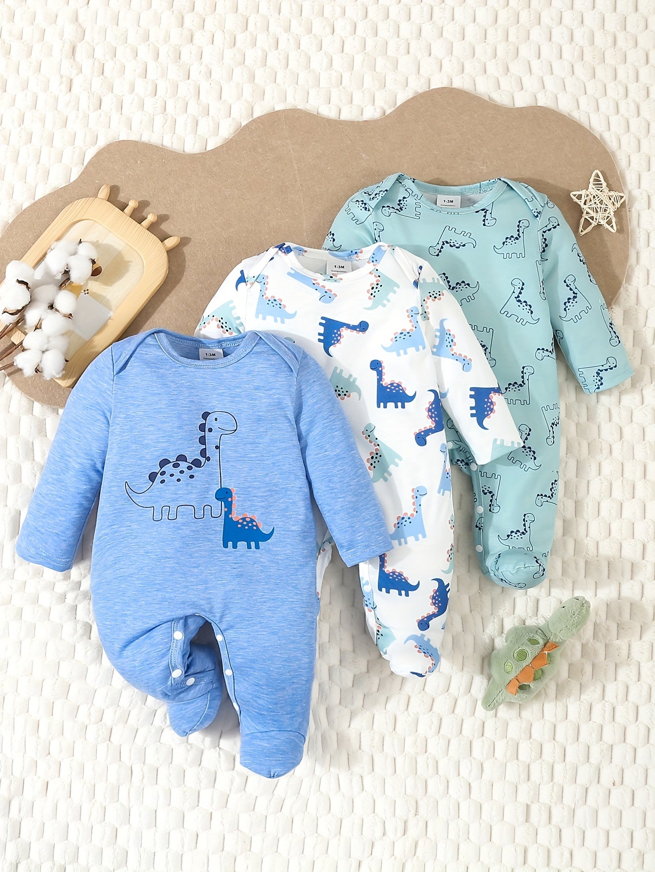 Three-Piece Set Gift Box for Baby Boys, Trendy and Cute Dinosaur Cartoon Print Romper Jumpsuits with Footed Overalls, for Outdoor