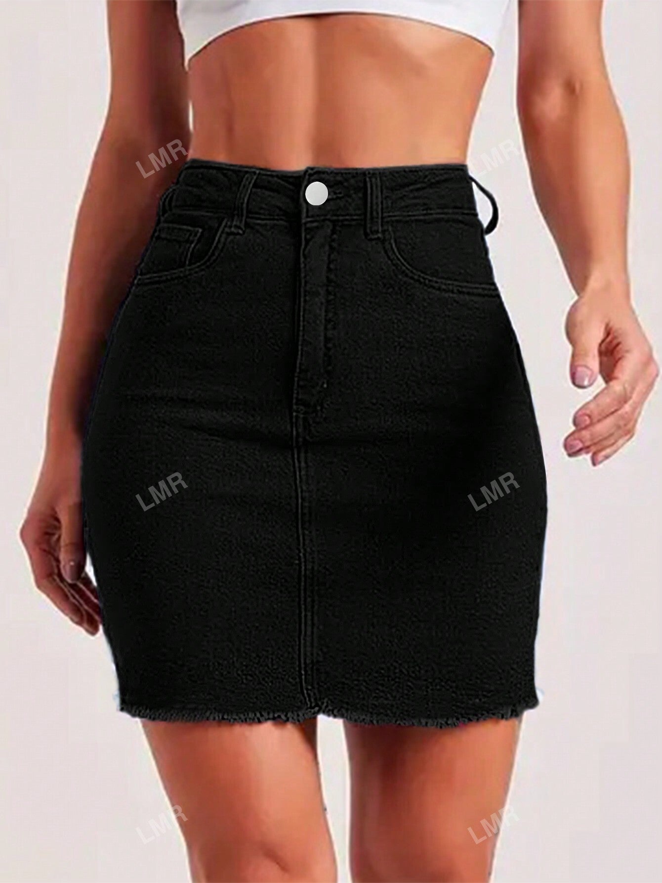 Tight-Fitting Pencil Denim Skirt With Frayed Hem