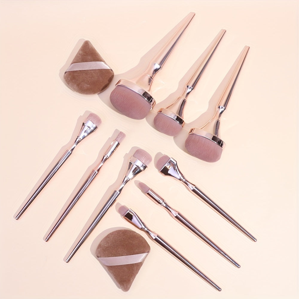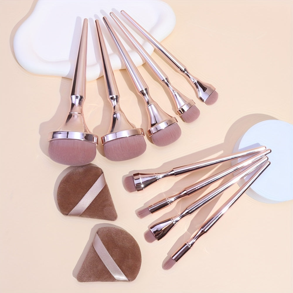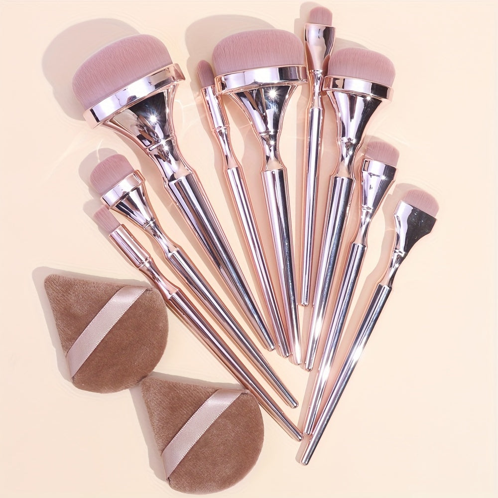 [Toothbrush Type Makeup Brush Set] 9pcs Toothbrush Type Makeup Brush Set - High-end Electroplated Handle Beauty Tools - Complete Makeup Brush Loose Powder Brush Blush Brush Eyeshadow Brush + 2 Powder Puffs