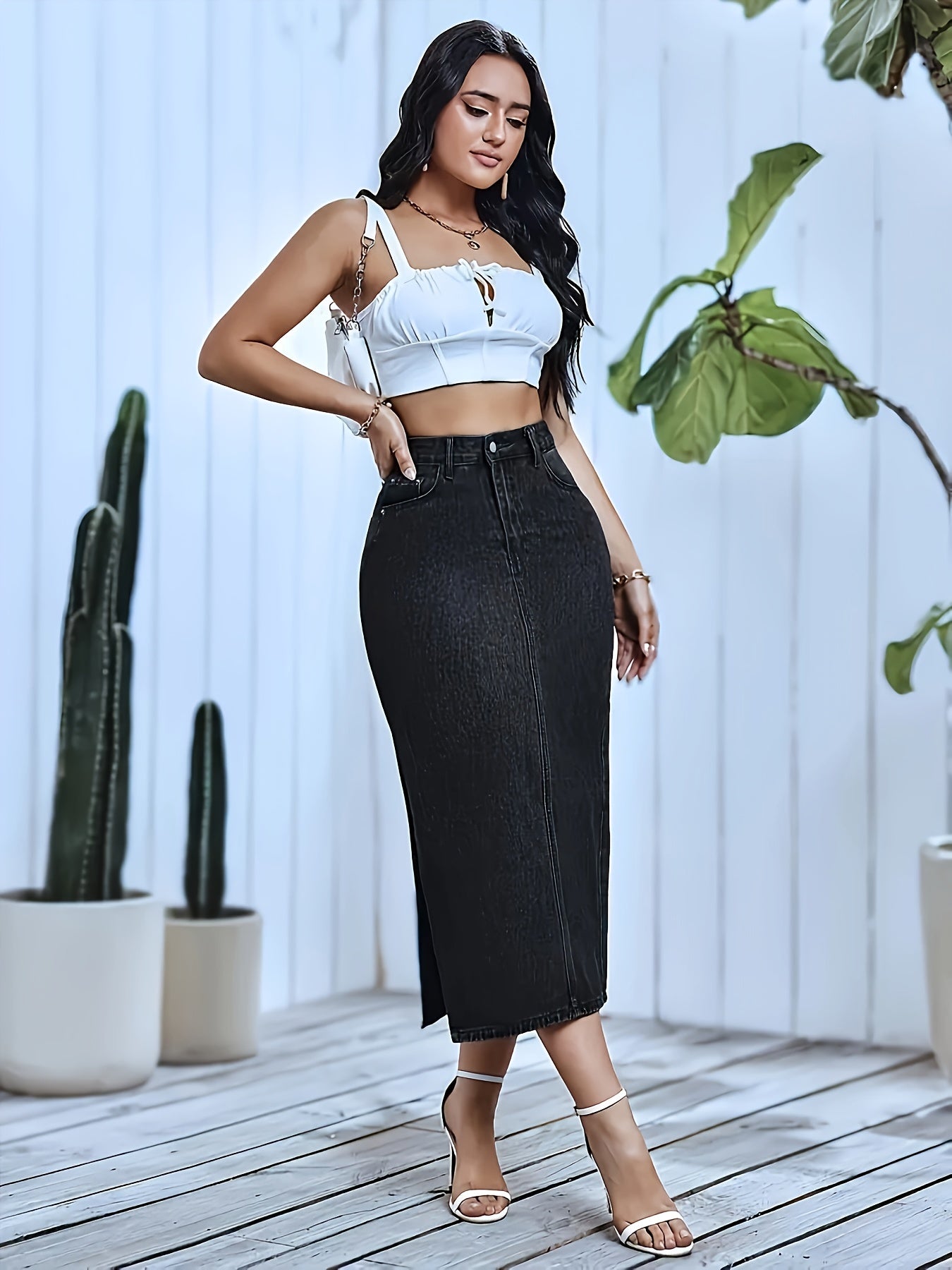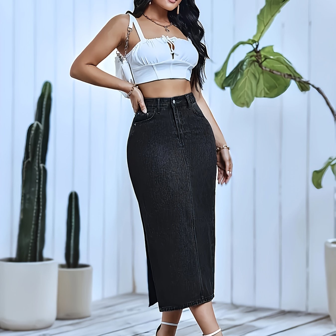 [Trendy Look] Women's High-Waisted Black Denim Midi Skirt with Side Slit - Street Style, Non-Stretch, Machine Washable, Ideal for Spring/Summer/Fall Fashion