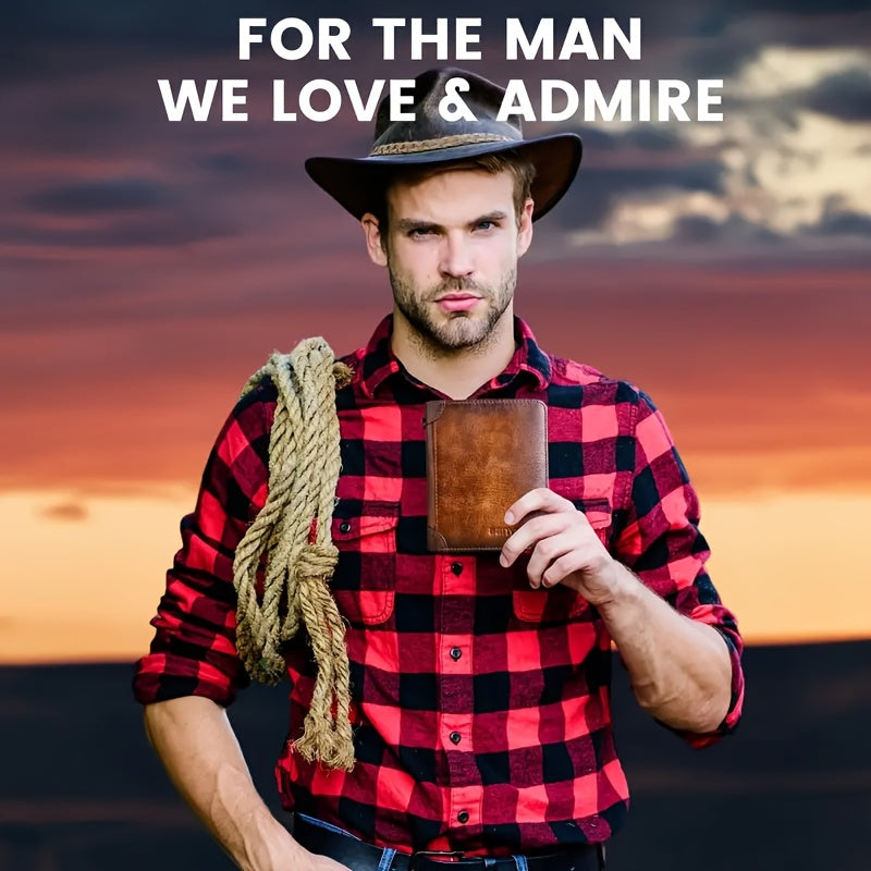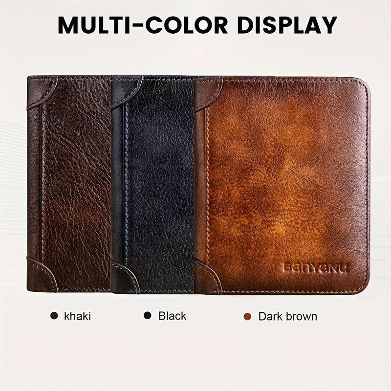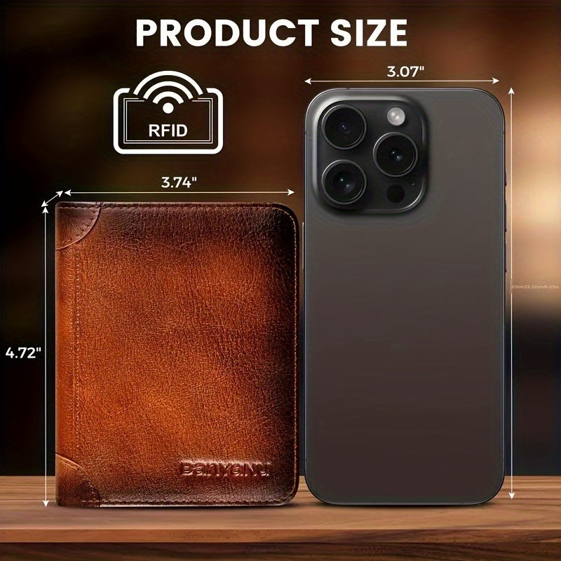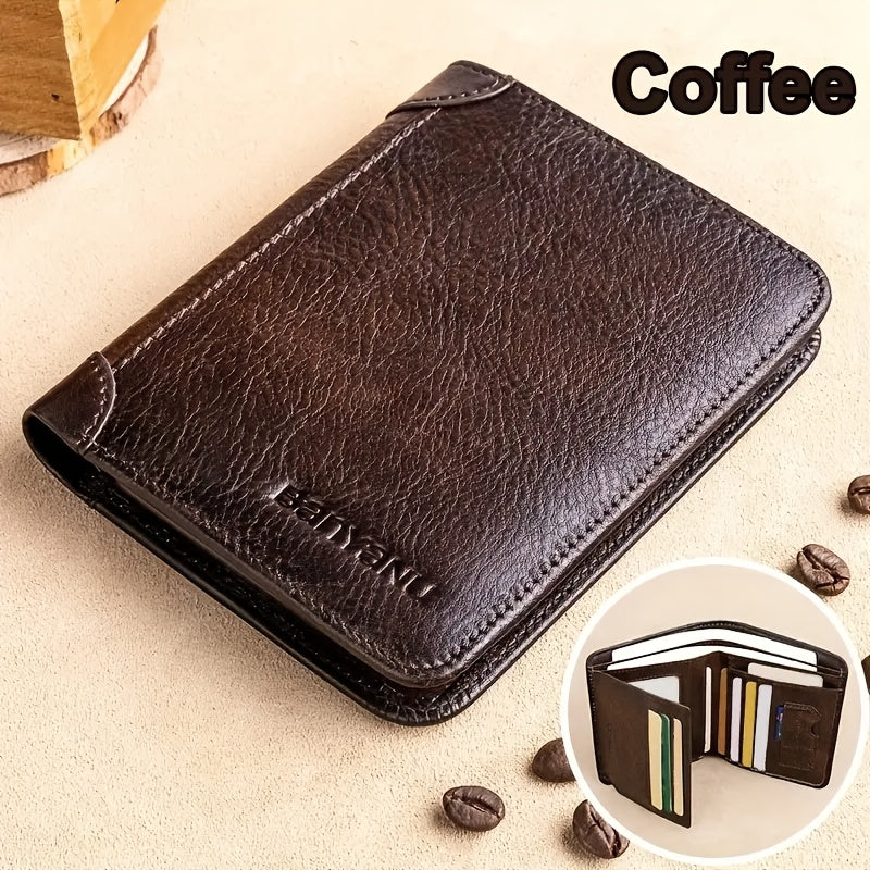 Tri-Fold Leather Men's Wallet, RFID Blocked, Top Layer Cowhide Vintage, 2 ID Windows, Multifunctional Credit Card Holder, Can Be Used as a Gift for Men