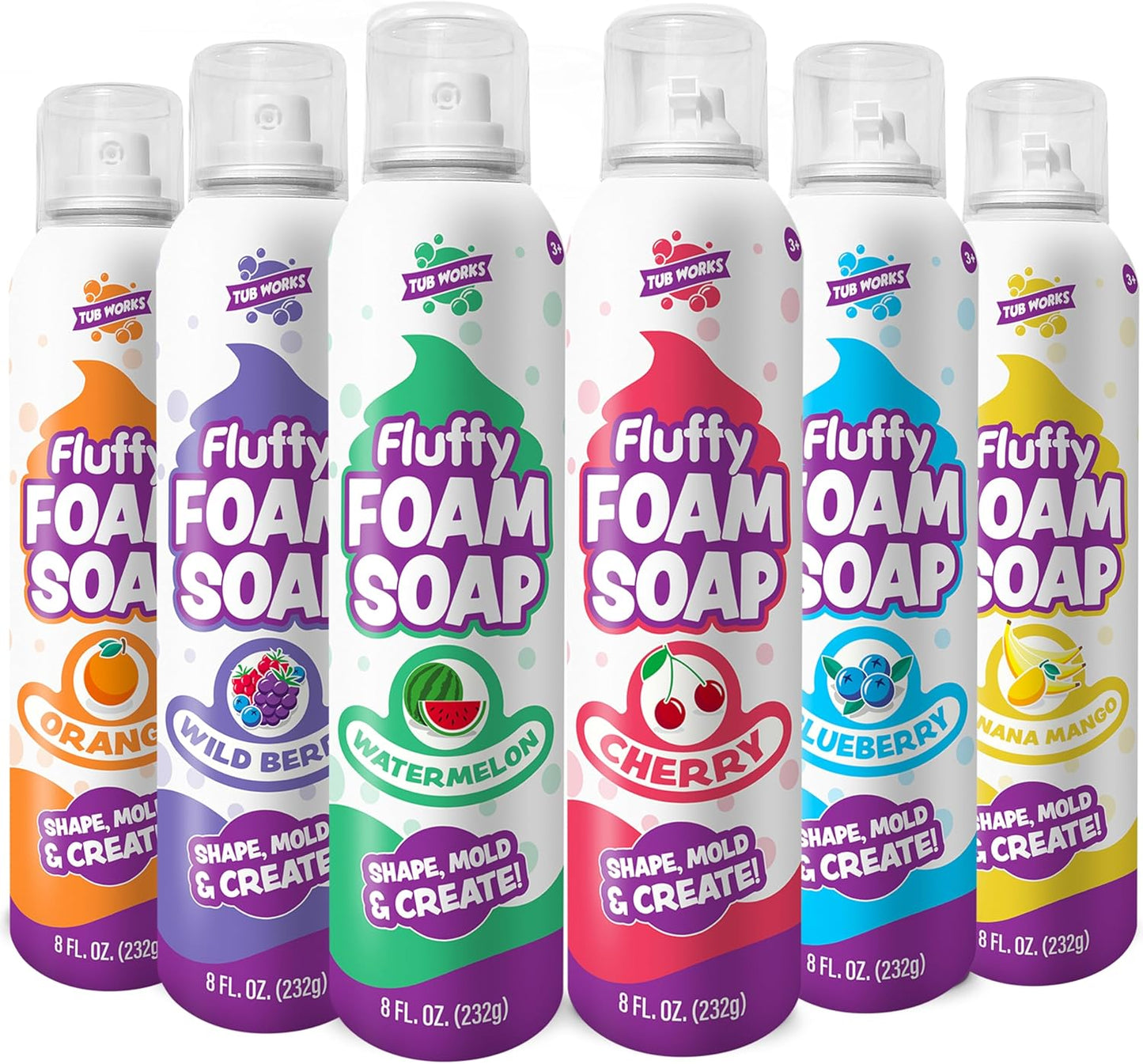 Tub Works® Fluffy Foam Soap, Variety 6 Pack | Shape, Mold & Create Bath Art with Soft Bath Foam for Kids | Gentle, Cleansing Kids Bath Soap | Easy-to-Use Spray Nozzles | Fruity, Fun Bath Colors