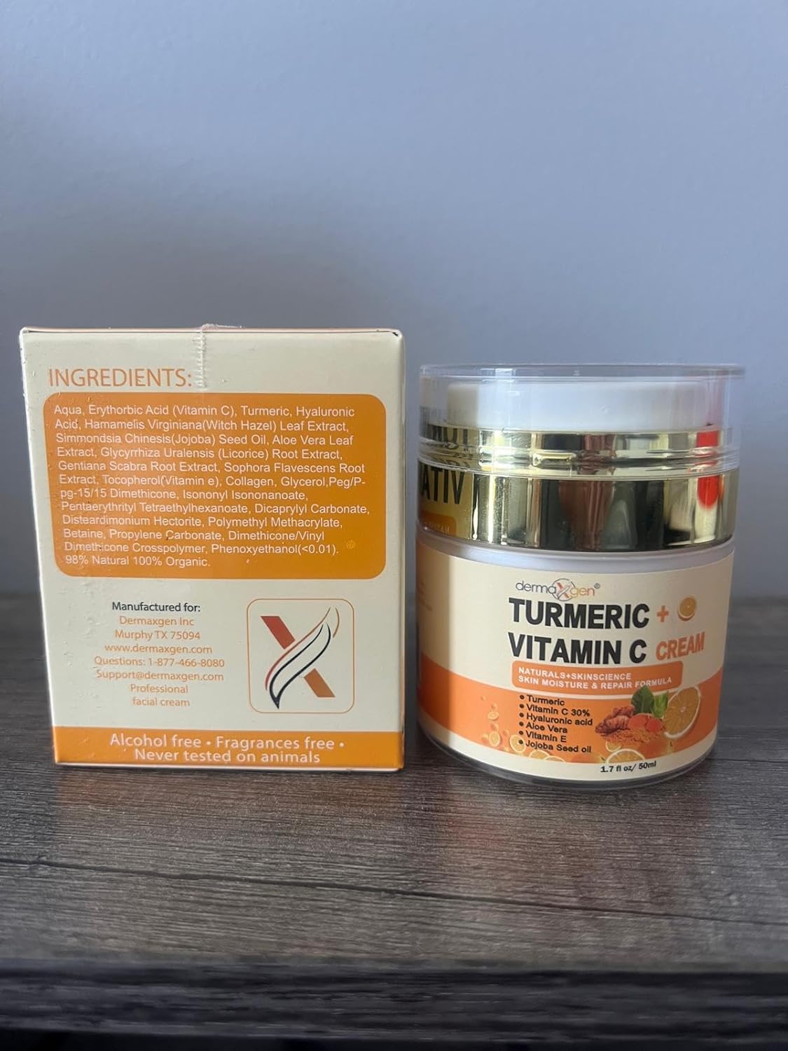 Nature-Powered Skincare: Experience the perfect fusion of science and nature with Dermaxgen’s Vitamin C and Turmeric Face Cream. Crafted with carefully selected botanical ingredients, this formula enhances your skincare routine with a refreshing and nourishing touch. Perfect for those looking to incorporate nature-inspired elements into their daily regimen.
