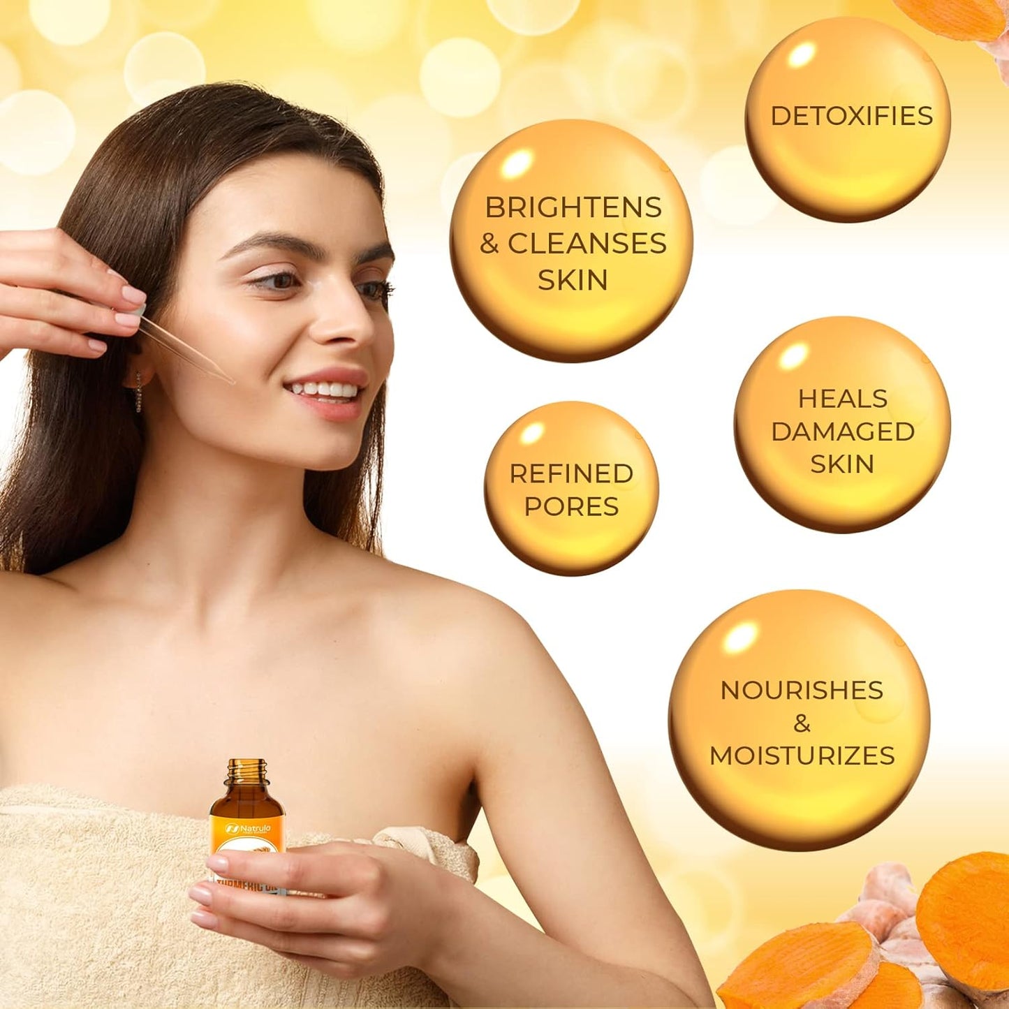 PORE-REFINING TURMERIC OIL: Our turmeric facial serum detoxifies deeply, acting like a magnet to draw out impurities from pores. Witness a refined finish as it prevents bacteria buildup and reduces pore size, giving your skin a flawless appearance.