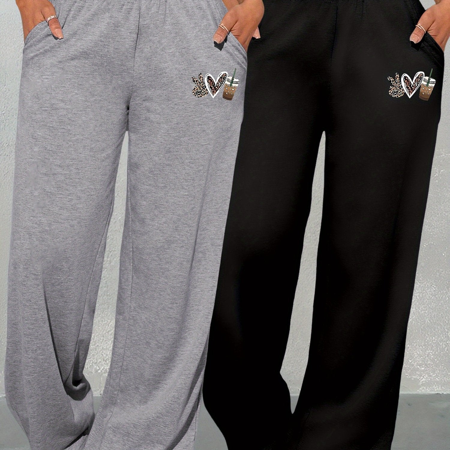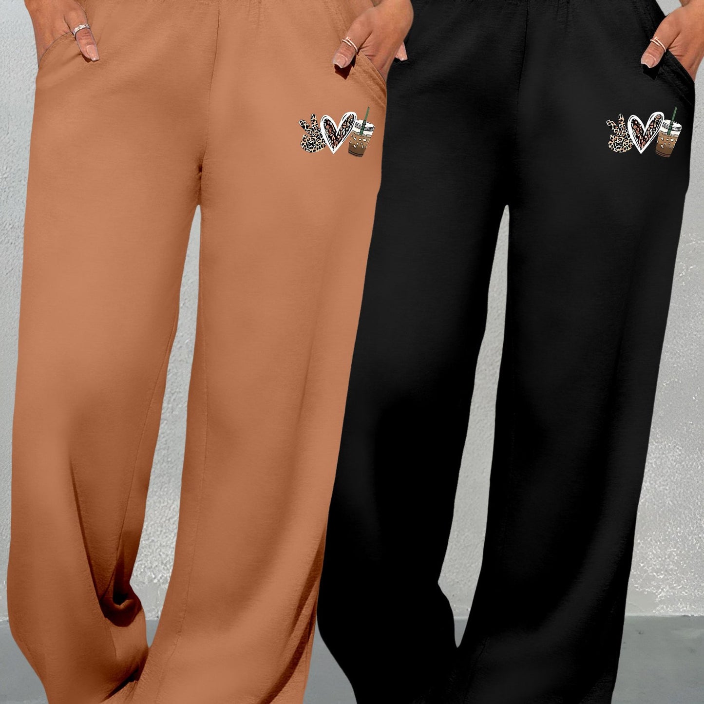 Two-piece Set K6 Women's Gesture & Love & Milk Tea Print Loose Wide Leg Pants Pocket Sweatpants Versatile High Waist Casual Trousers
