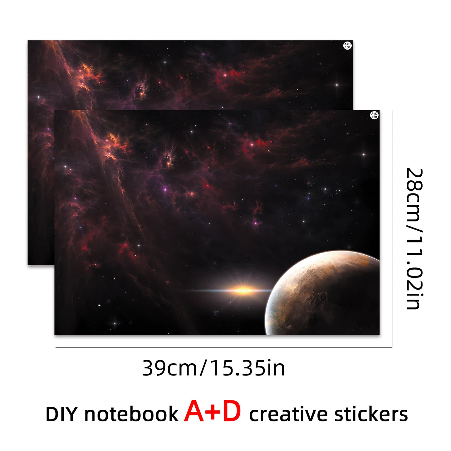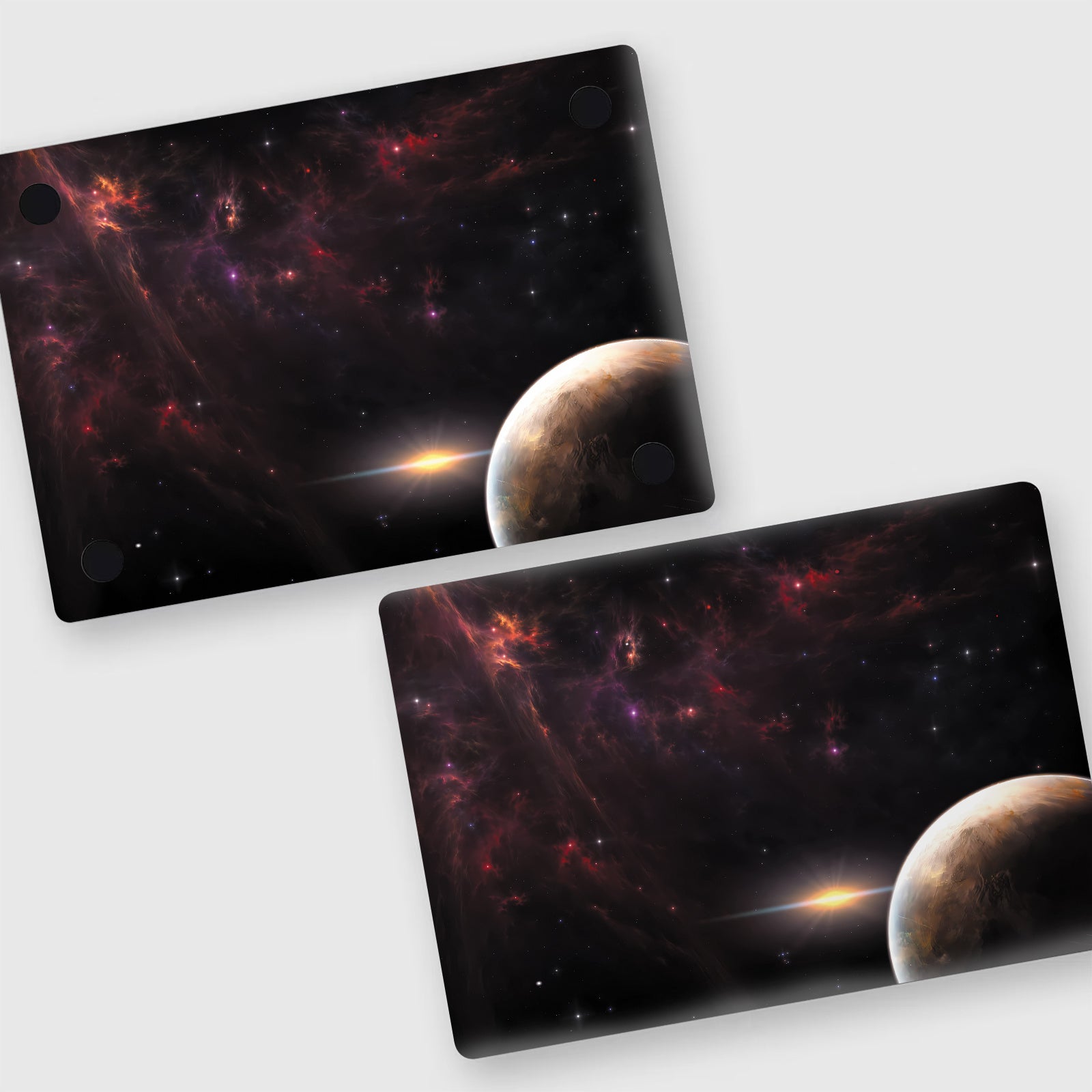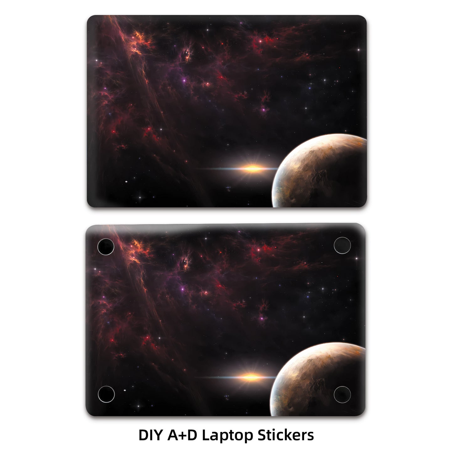 Un ensemble de 2 films de protection de surface A+D pour ordinateurs portables, avec un thème d'espace cosmique. Ces autocollants vibrants, auto-adhésifs et amovibles sont conçus pour décorer l'extérieur de votre ordinateur portable.