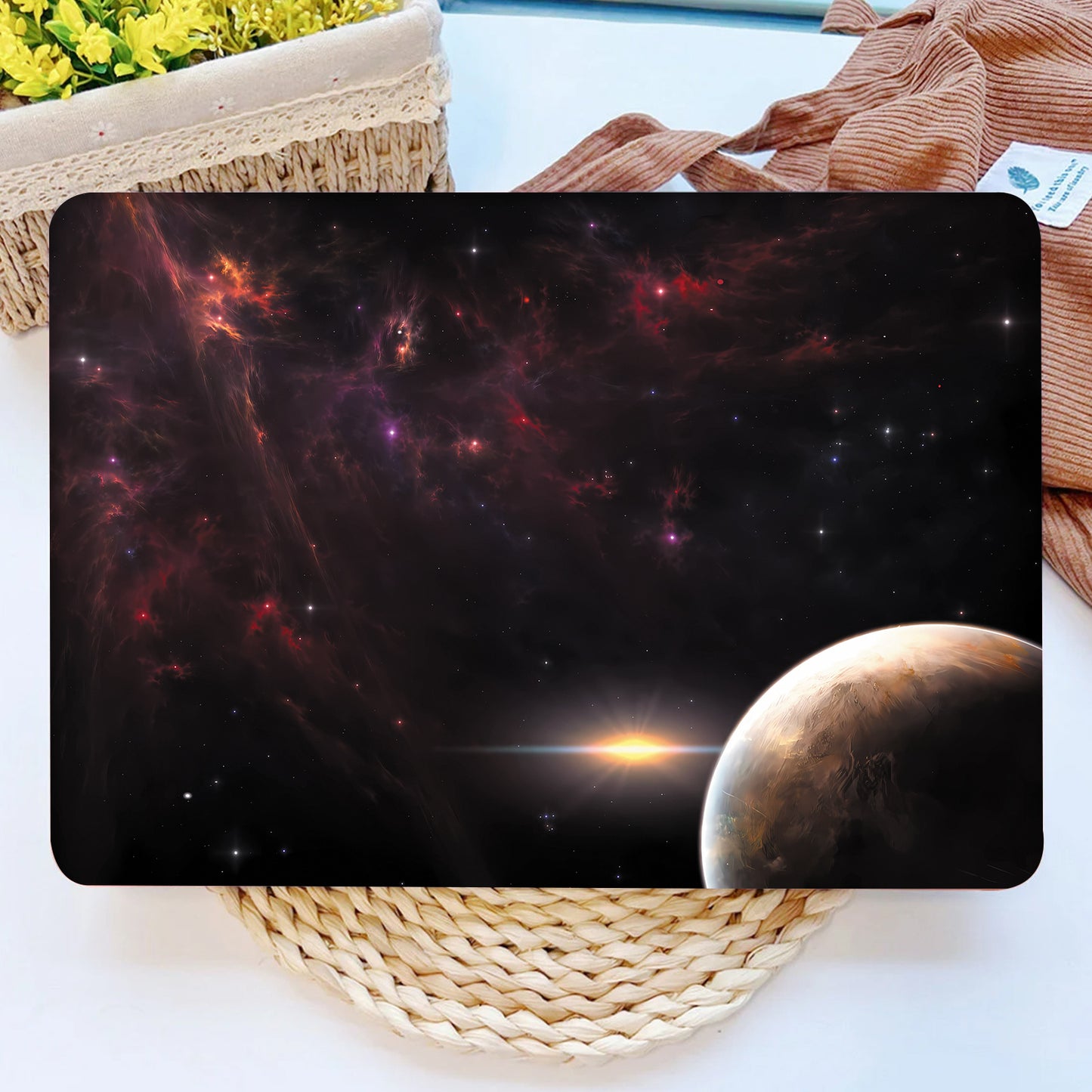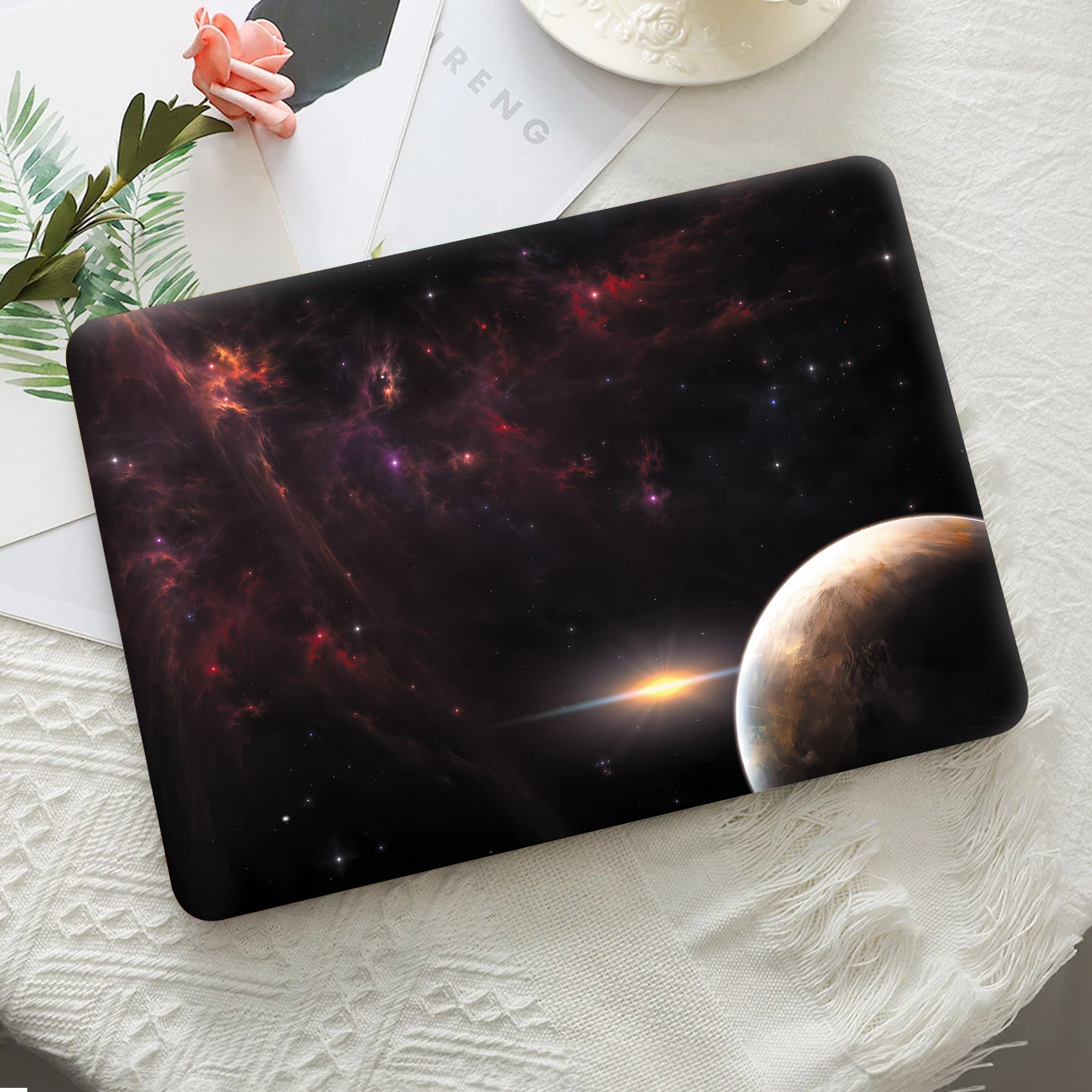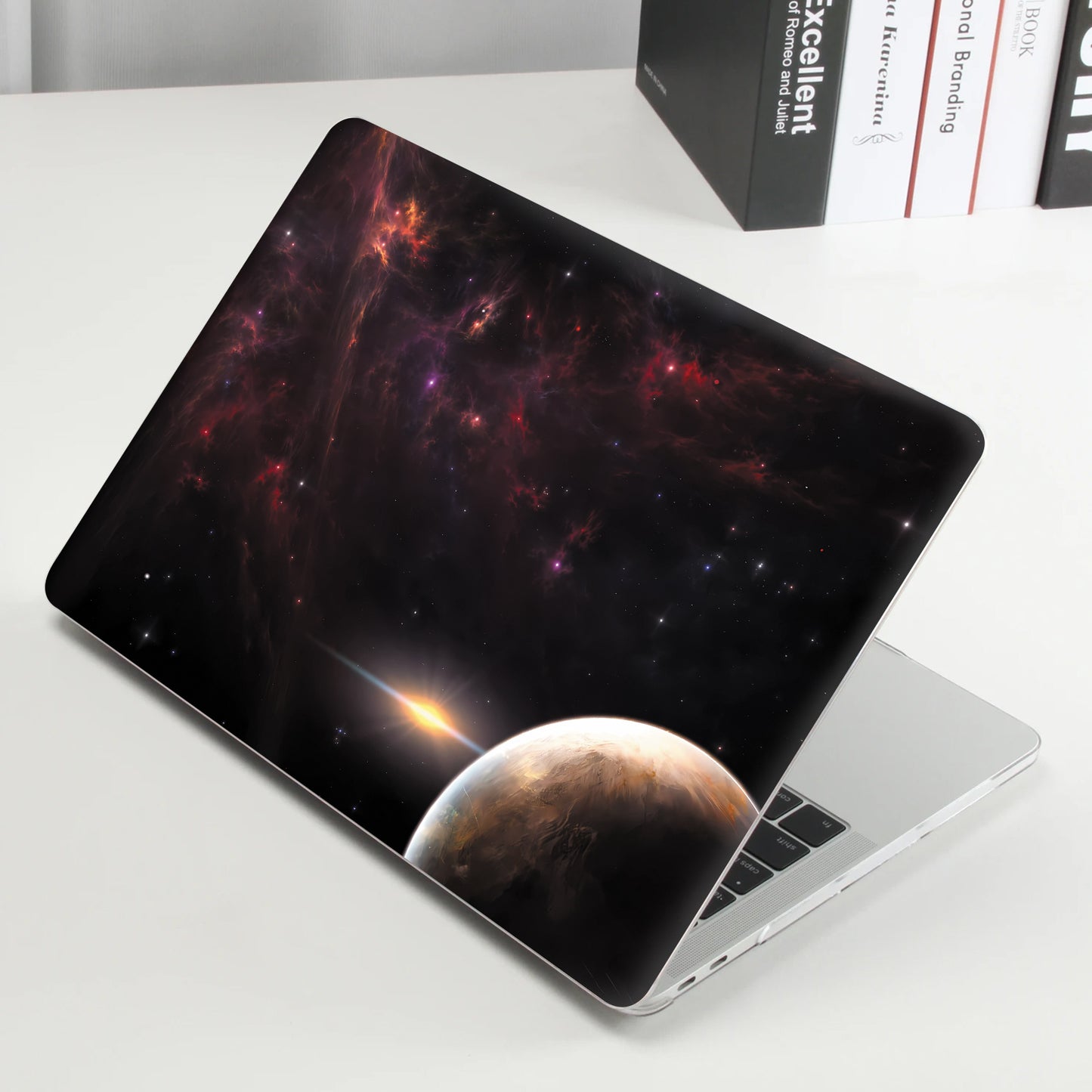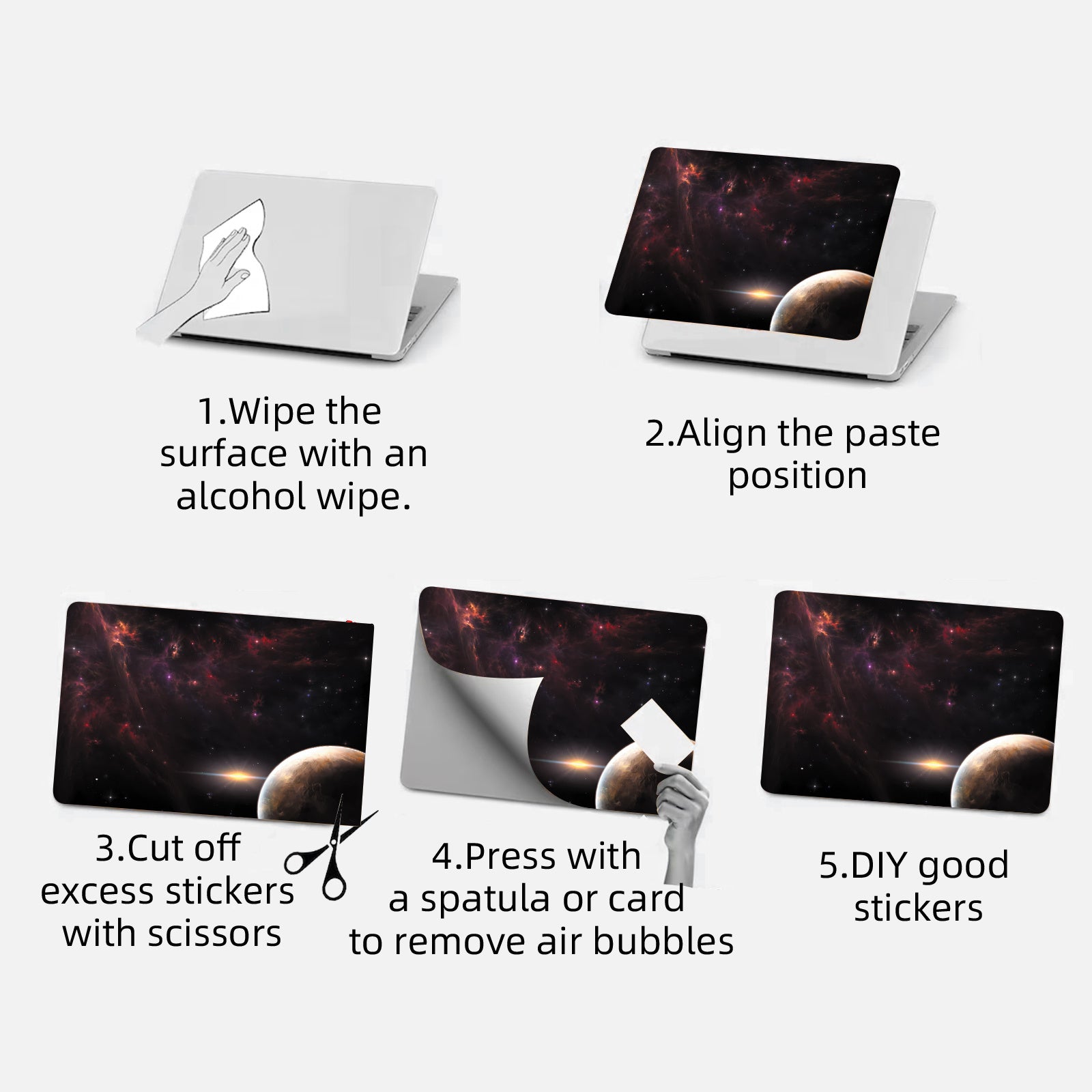 Un ensemble de 2 films de protection de surface A+D pour ordinateurs portables, avec un thème d'espace cosmique. Ces autocollants vibrants, auto-adhésifs et amovibles sont conçus pour décorer l'extérieur de votre ordinateur portable.