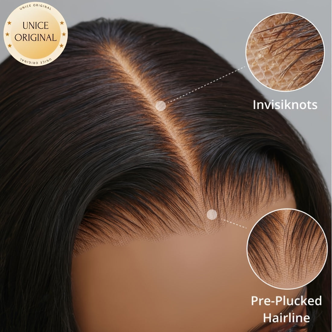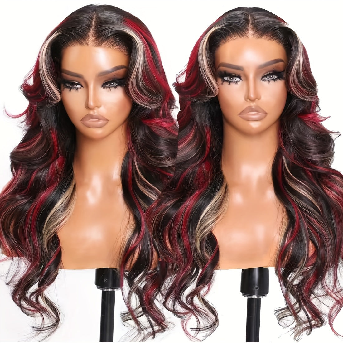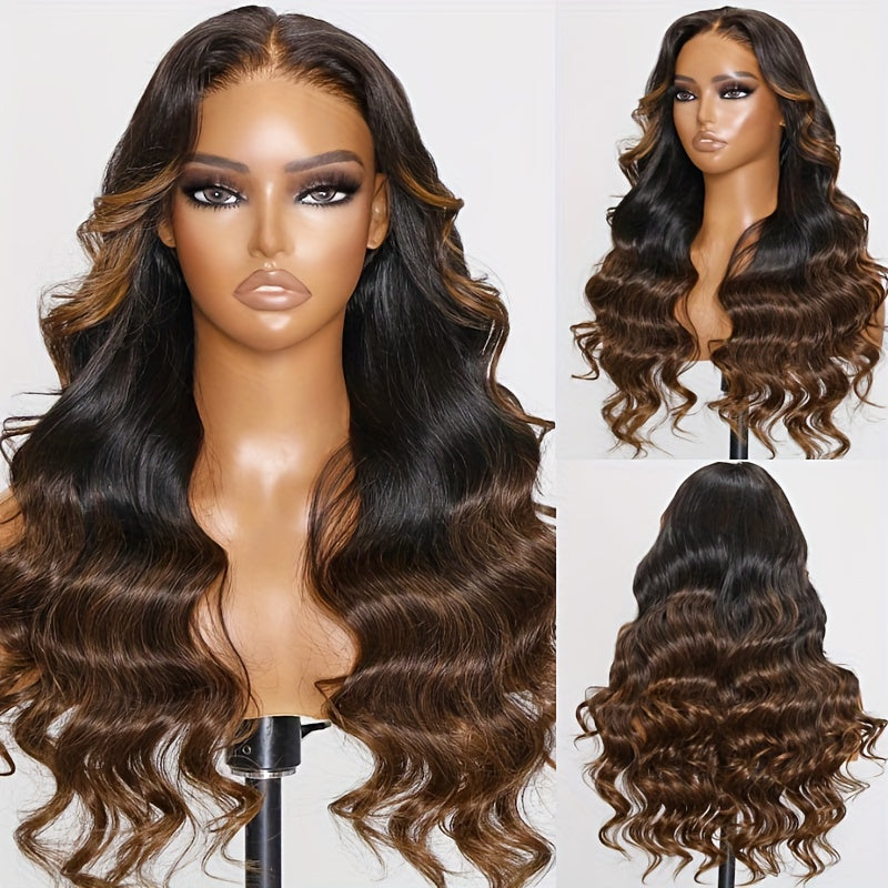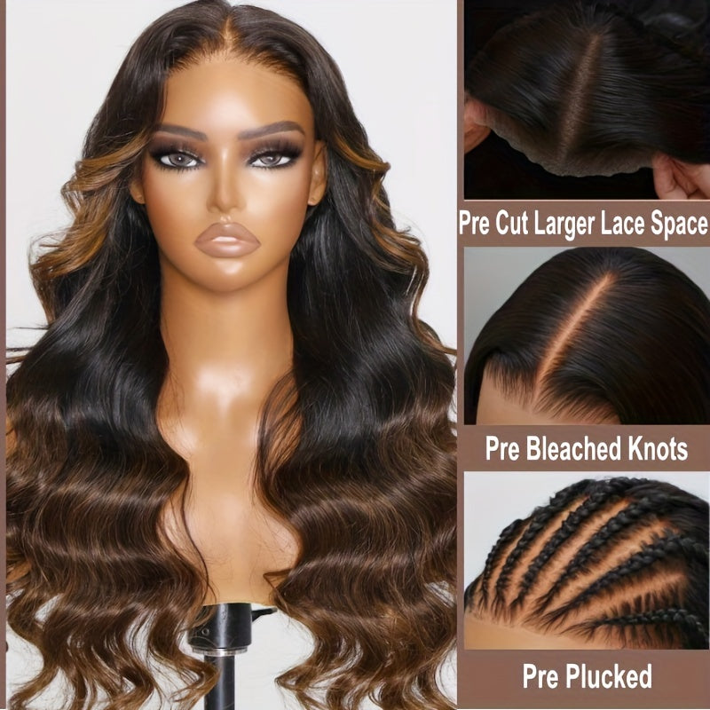 UNice Bye Bye Knots Wig 7x5 Pre Cut Glueless Lace Skunk Stripe Black to Chestnut Brown Ombre Loose Wave Wig Pre Bleached Invisible Knots Black Red Blonde Highlights Lace Front Wigs Human Hair Glueless Wig Pre Plucked 16inch Wig