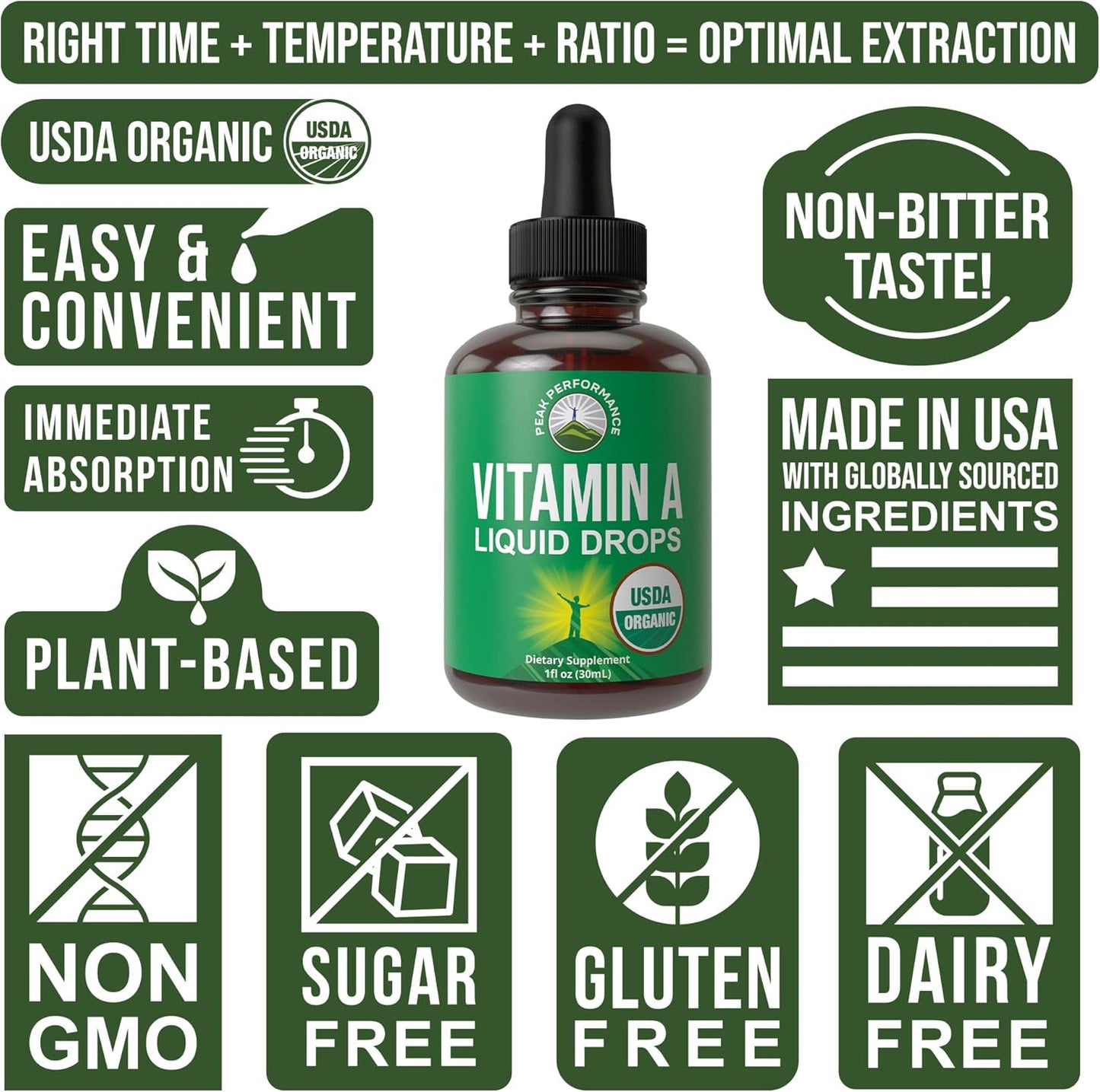 USDA Organic Vitamin A Liquid Drops Supplement. Vegan High Bioavailability For Eye, Skin, and Bone Health. For Adults, Men, Women, Kids. Organic Vit A Oil Retinyl Palmitate. Gluten Free, Zero Sugar