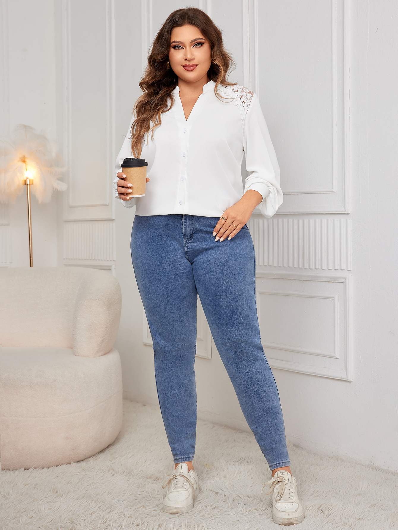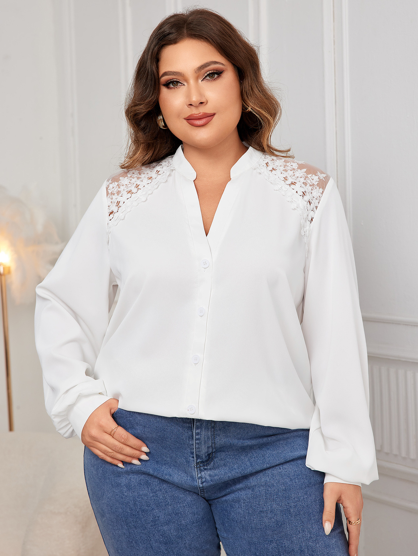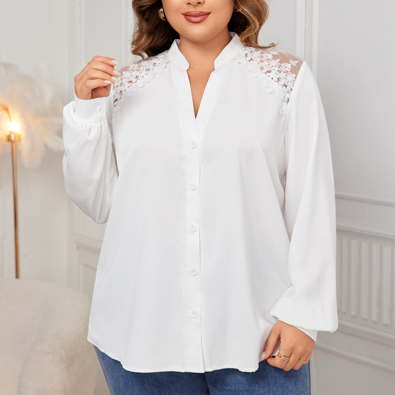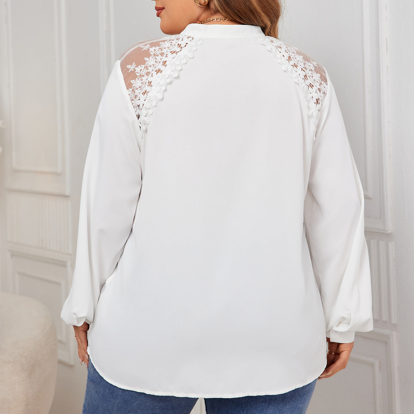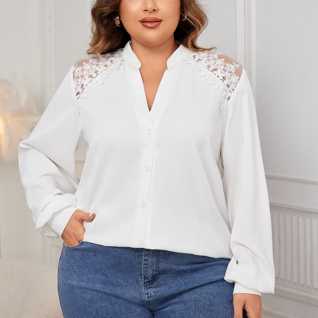 V Neck Lace Stitching Shirt Autumn Long Sleeve White Top