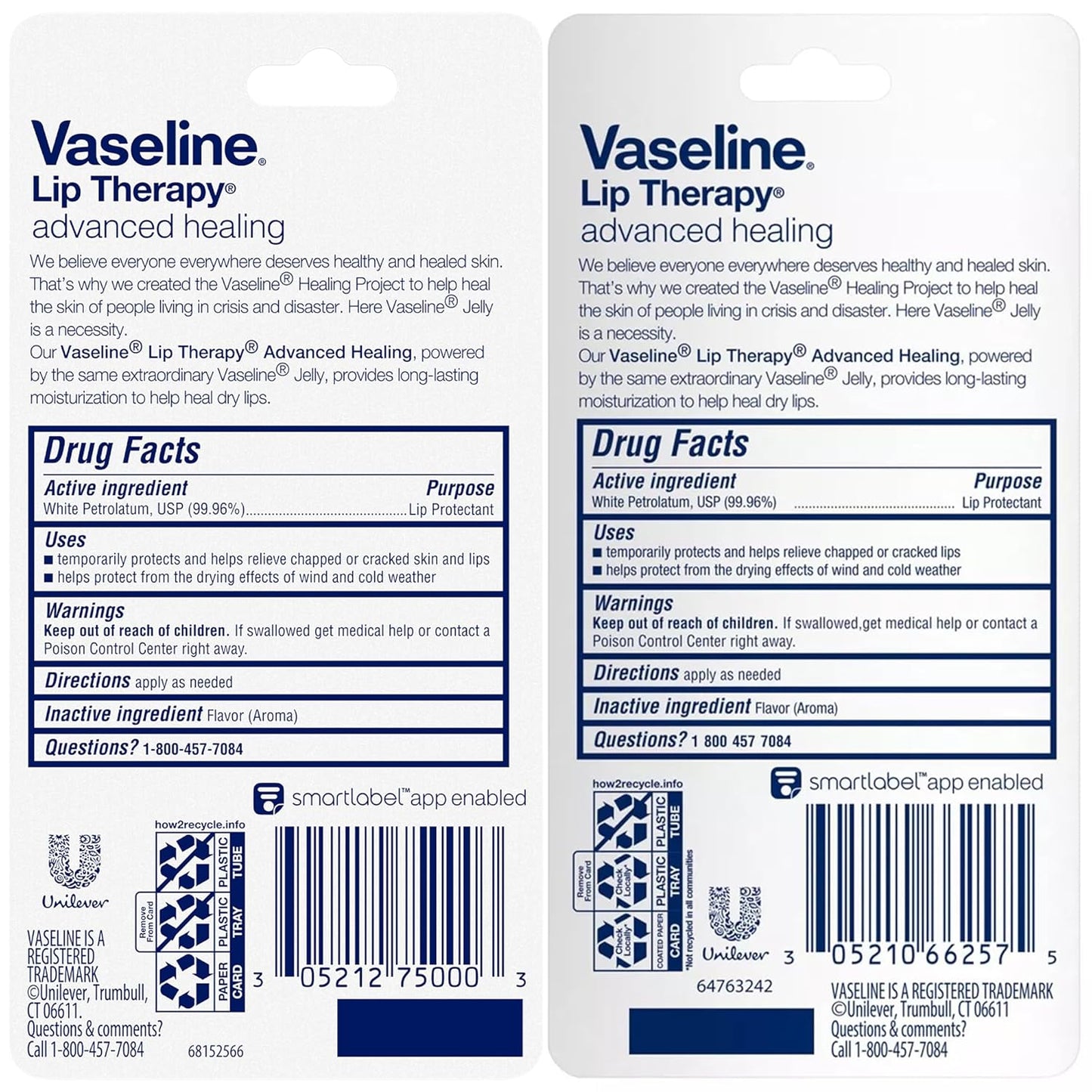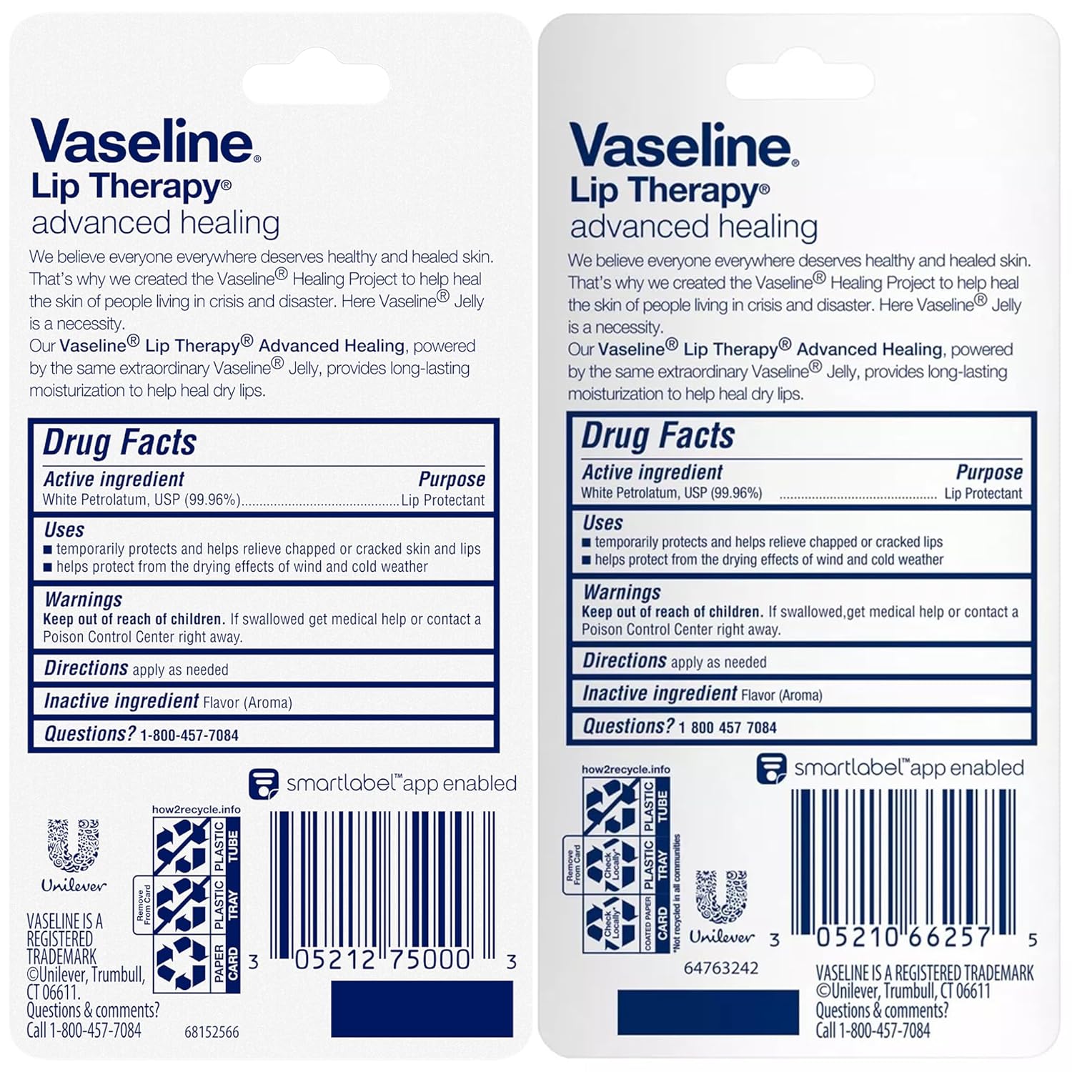 VASELINE LIP CARE: Vaseline Lip Therapy Advanced Therapy features triple-purified petroleum jelly in a convenient 0.35-ounce lip balm tube that makes the application mess-free.