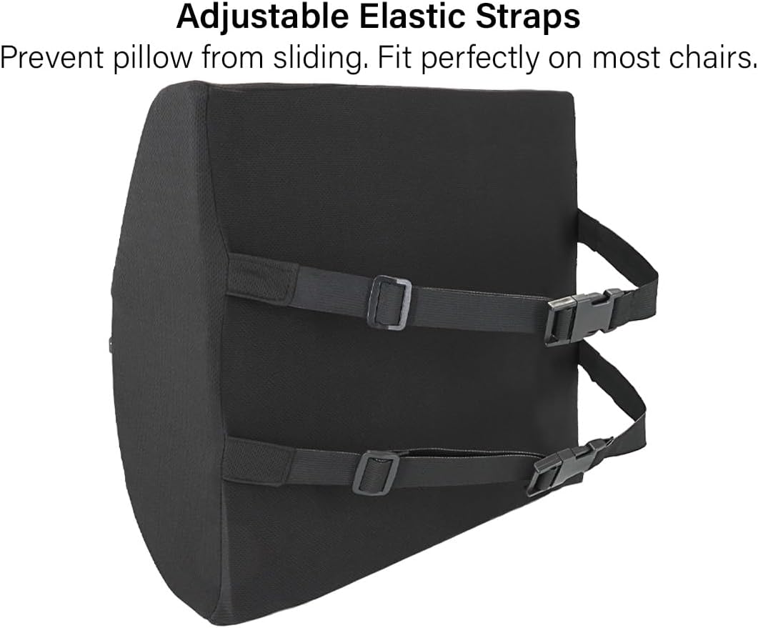 PERFECT FOR HOME, OFFICE, TRAVEL OR CAR – Made to last with premium quality molded foam and fabric. Includes elastic strap to anchor back support pillow to your chair.