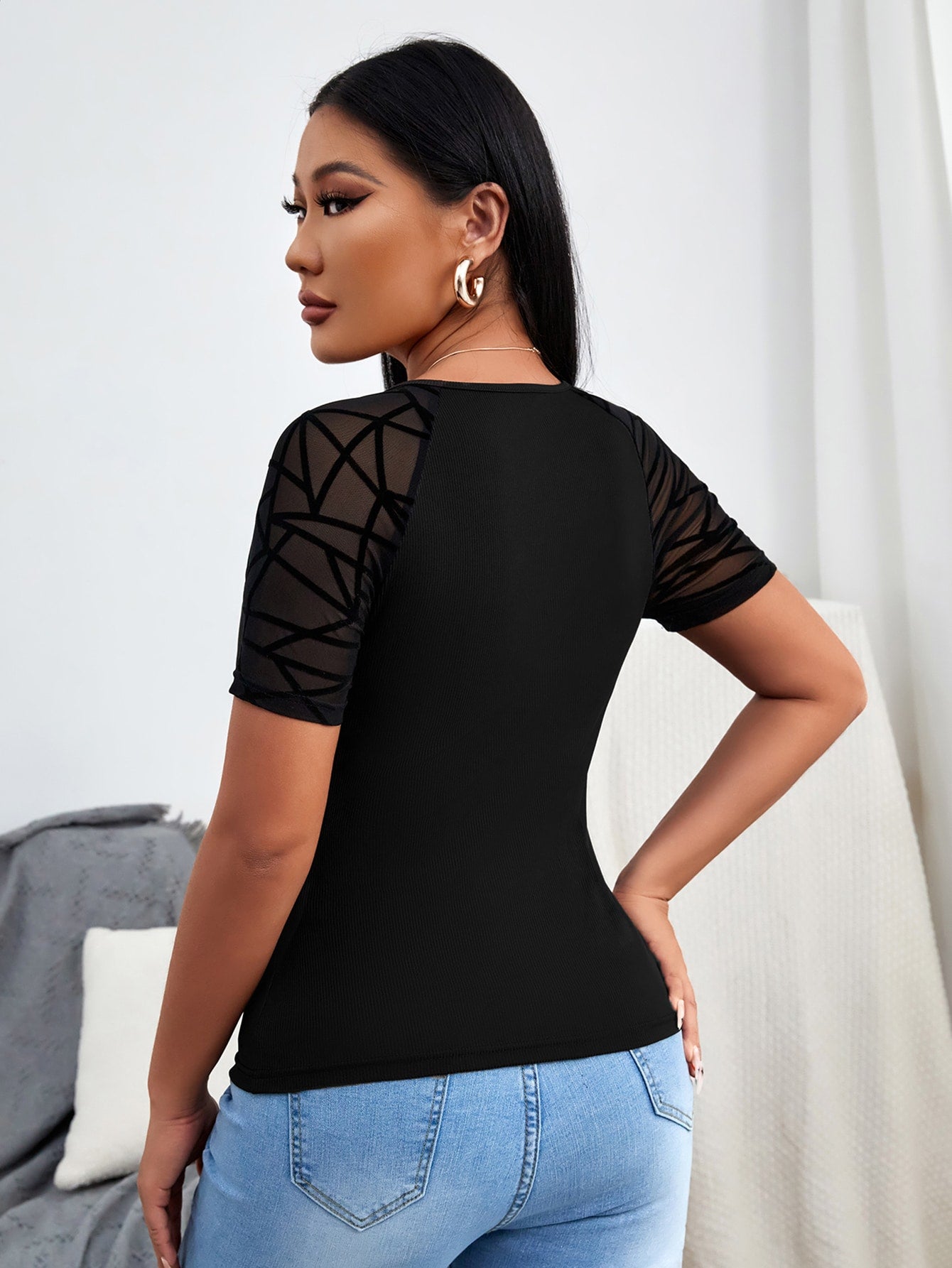 VaVaLuxe Contrast Geo Mesh Raglan Sleeve Tee Graphic Tees Women Tops