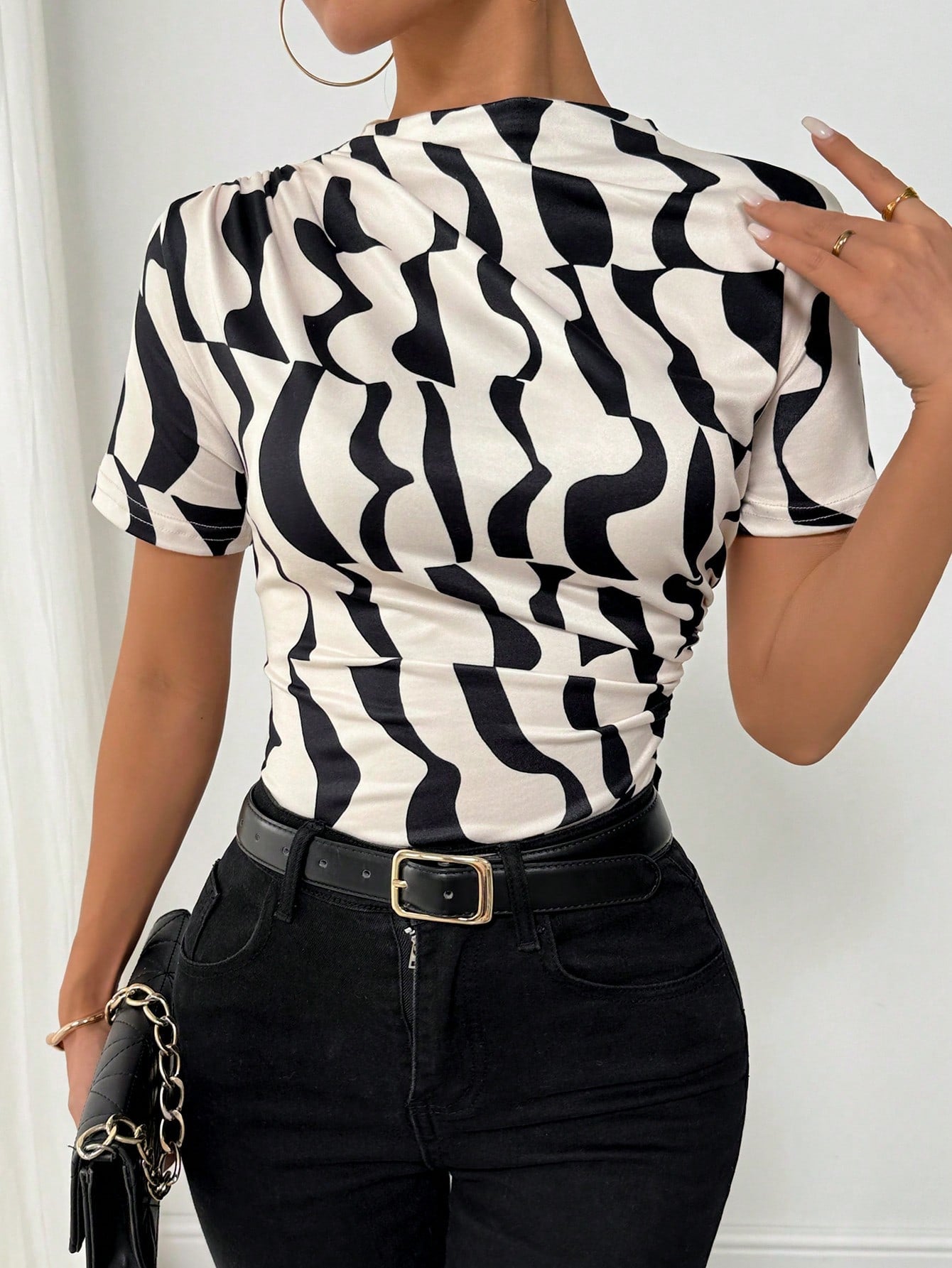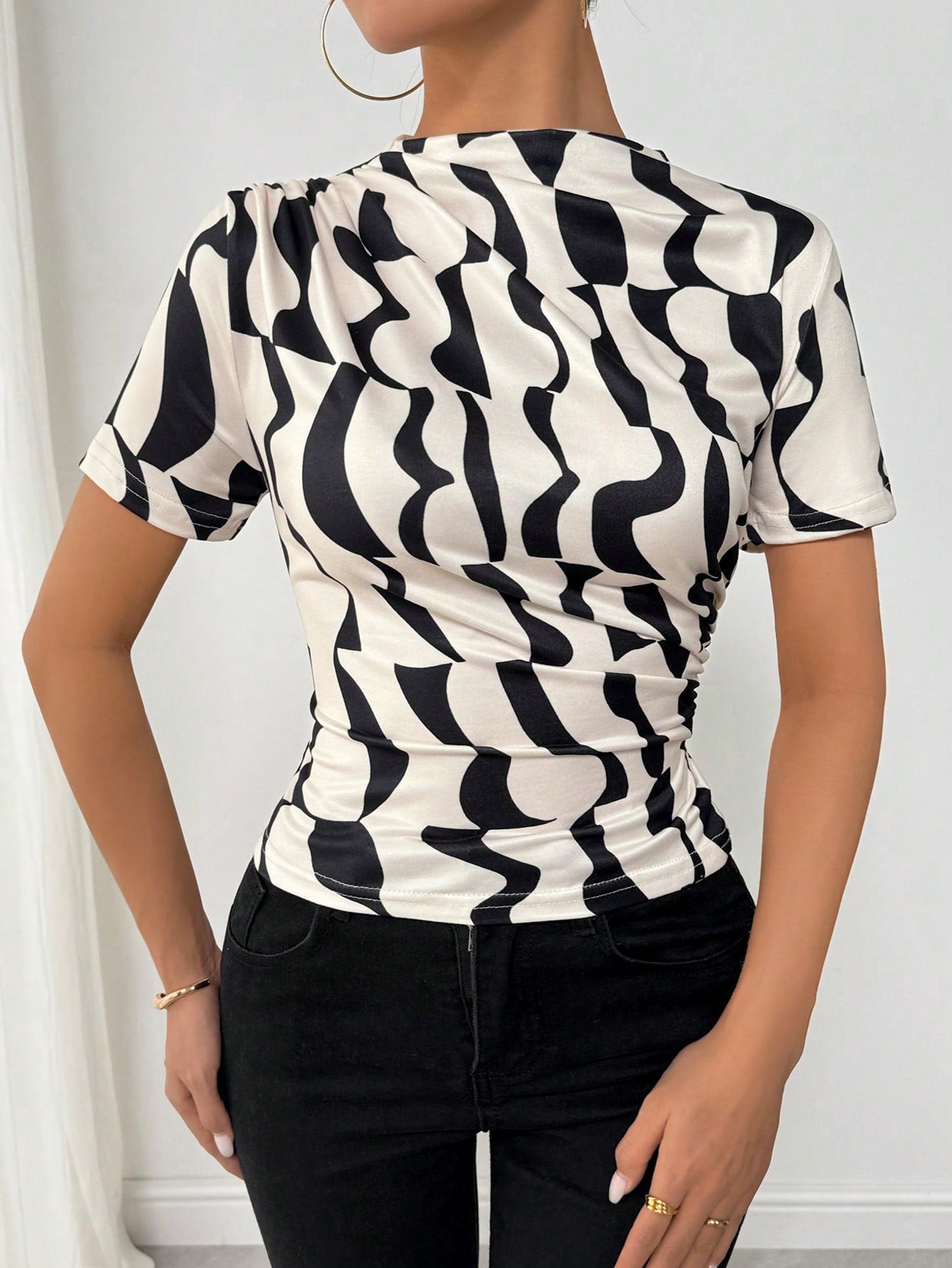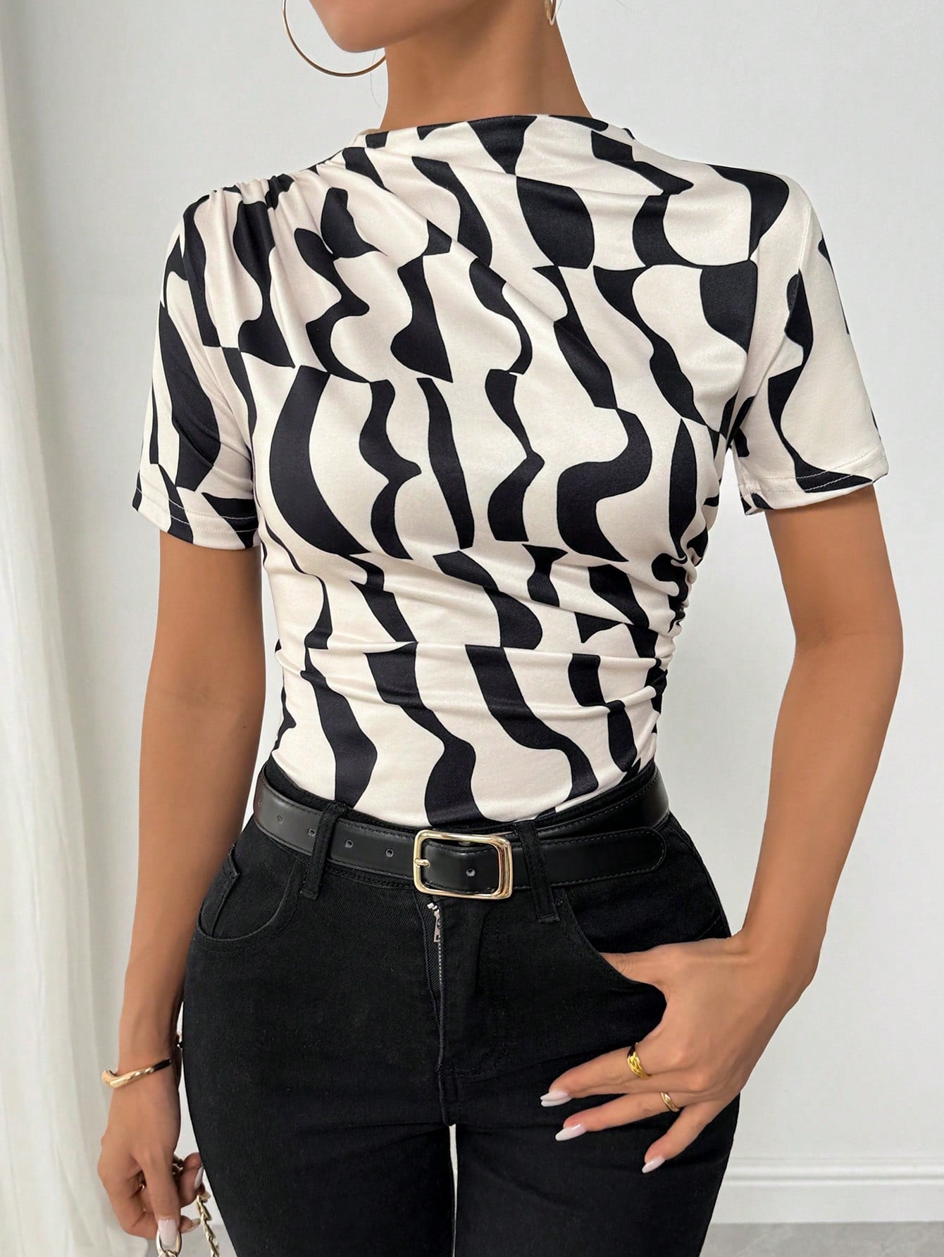 VaVaLuxe Women Asymmetrical Geometric Print Pleated Turtleneck T-Shirt Graphic Tees Women Tops