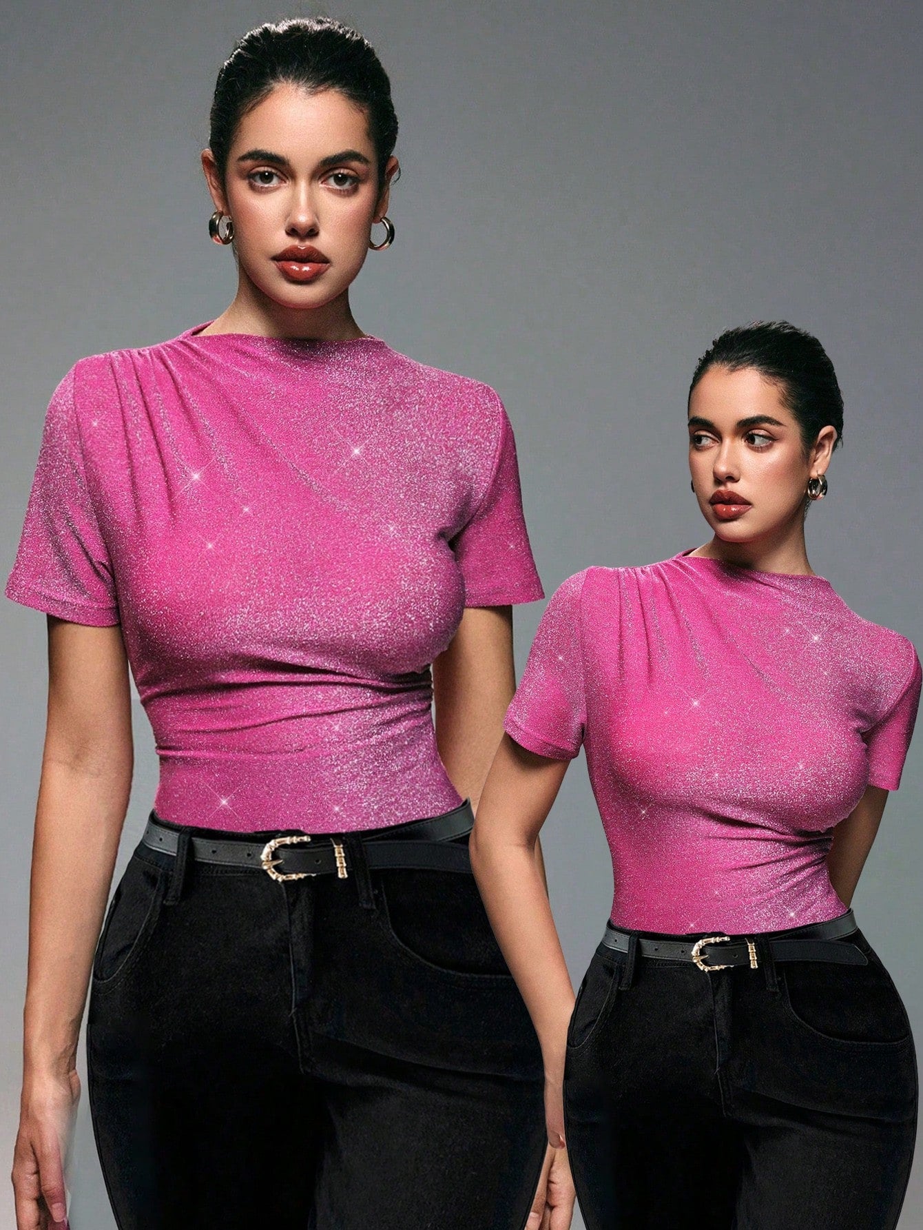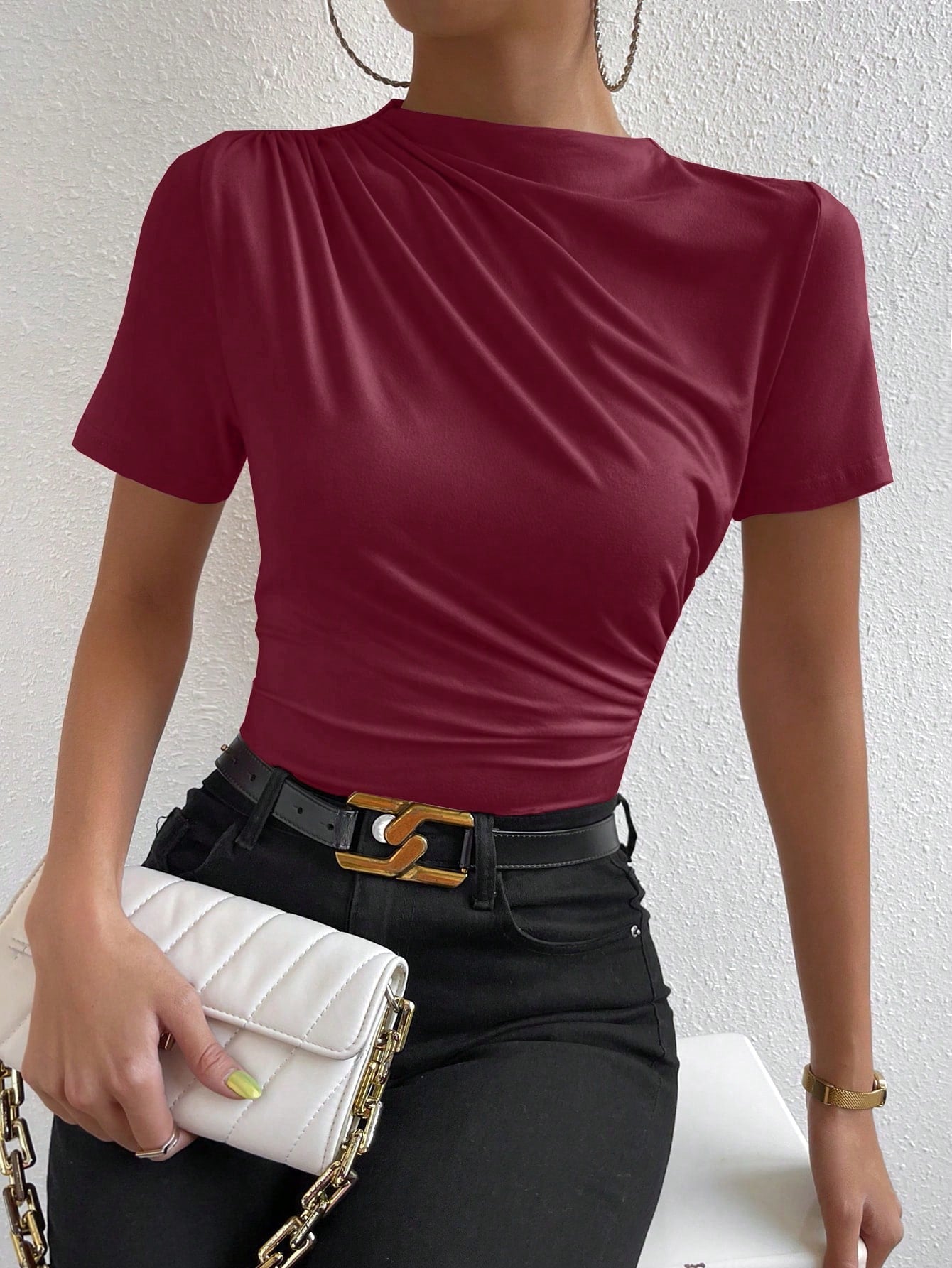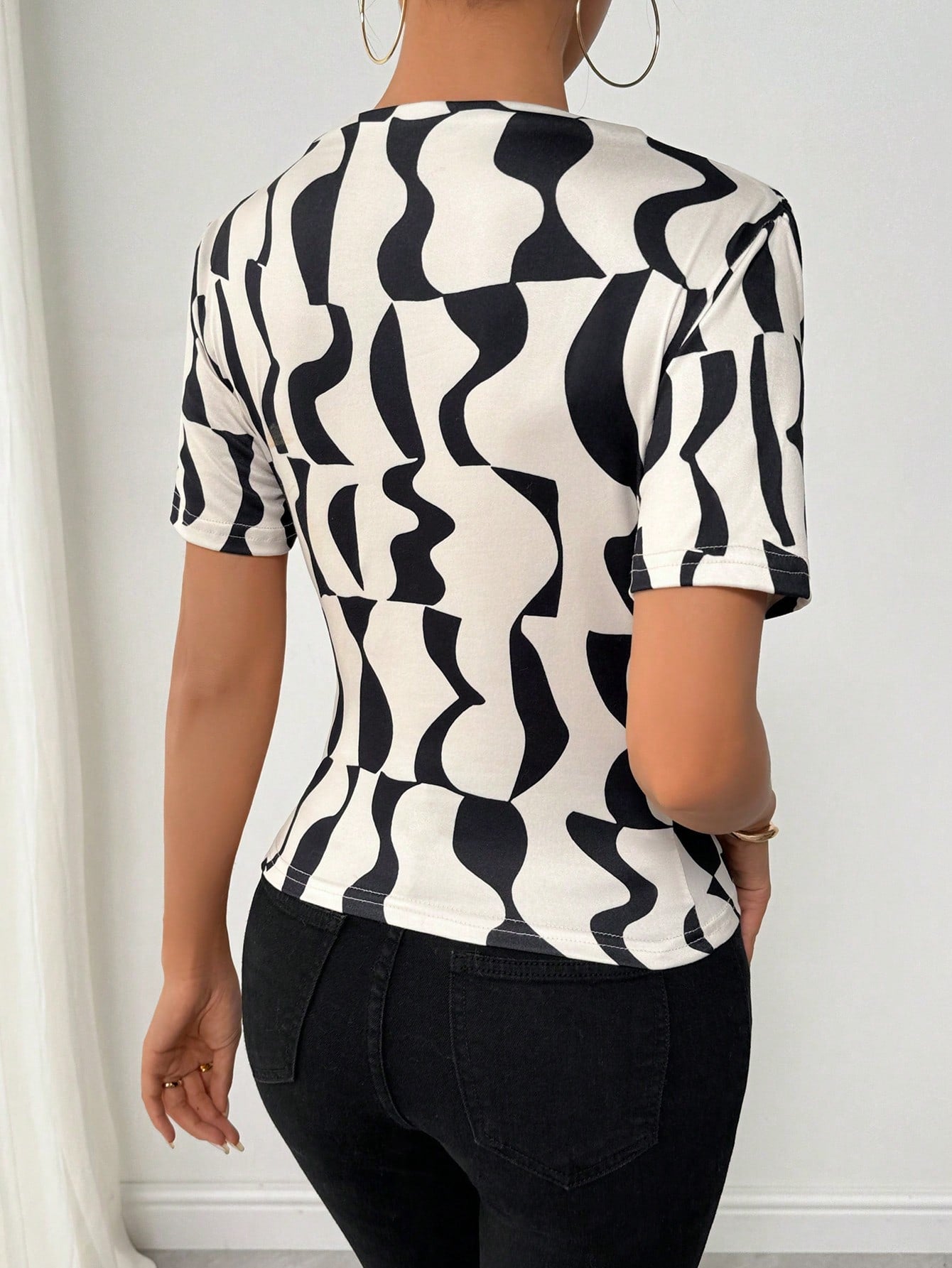 VaVaLuxe Women Asymmetrical Geometric Print Pleated Turtleneck T-Shirt Graphic Tees Women Tops