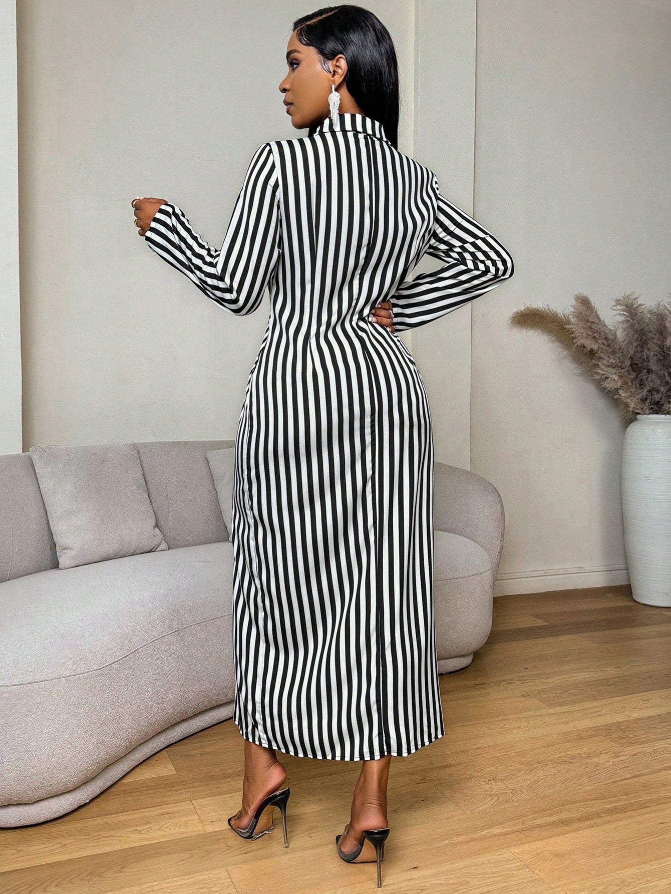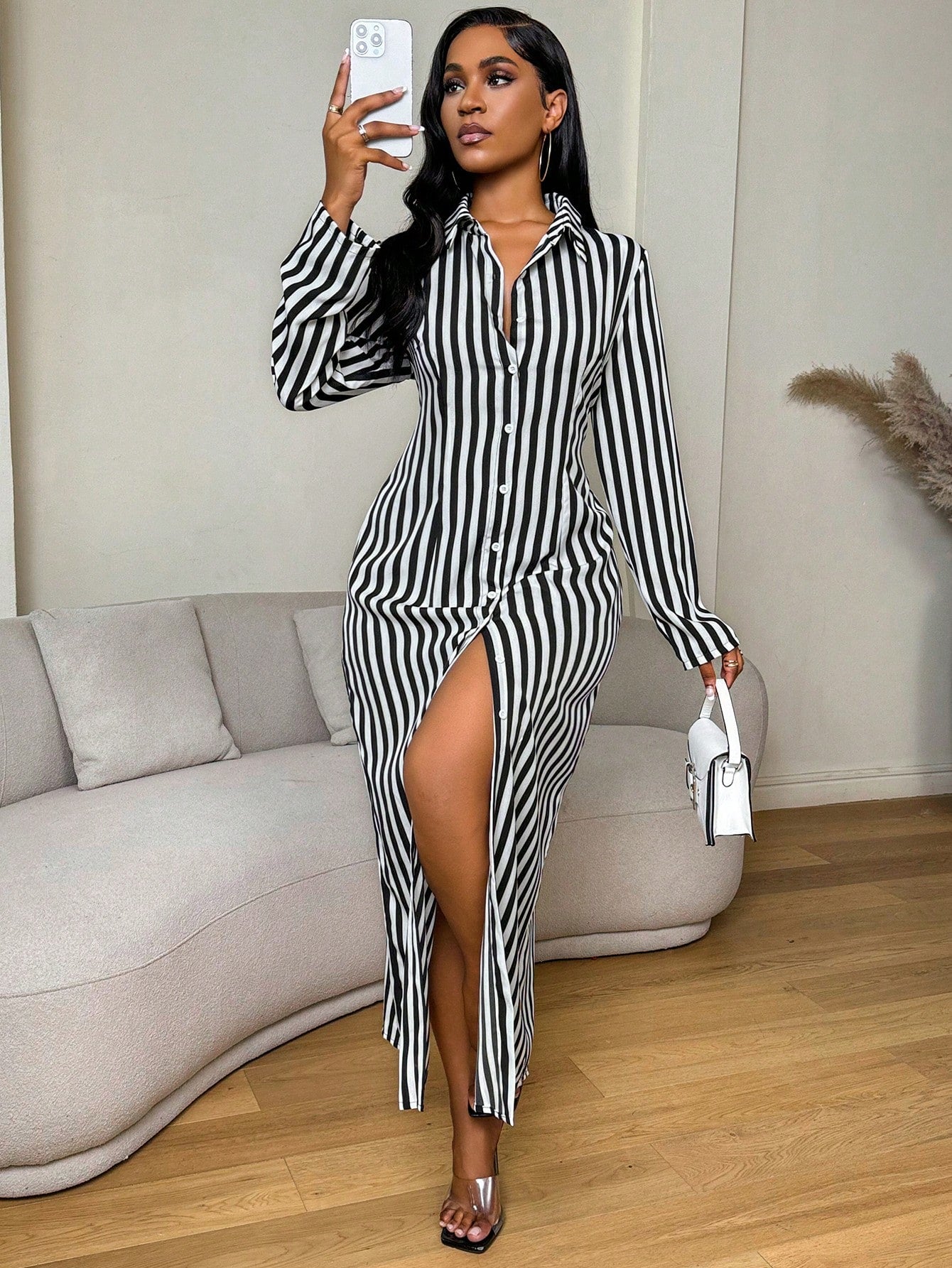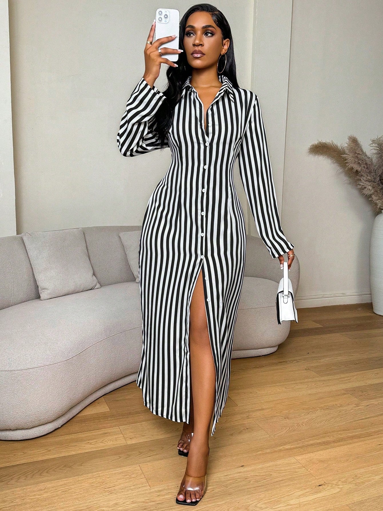 VaVaLuxe Women's Black & White Striped Button Front Long Sleeve Shirt Dress, Fall, Teacher, Back To Work, Elegant Lady Maxi Women Outfit
