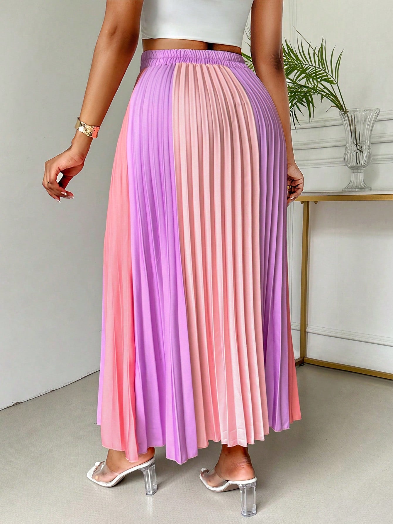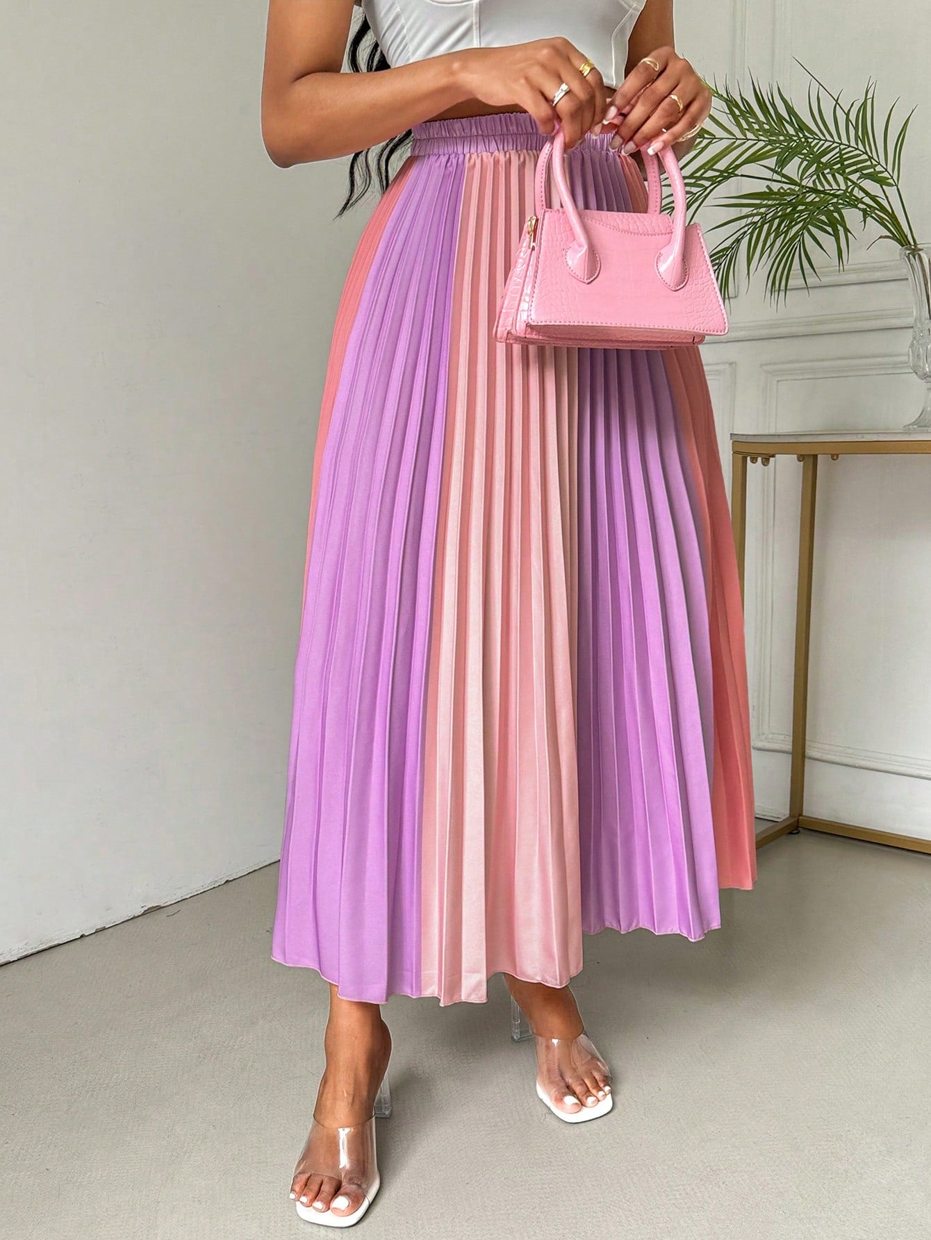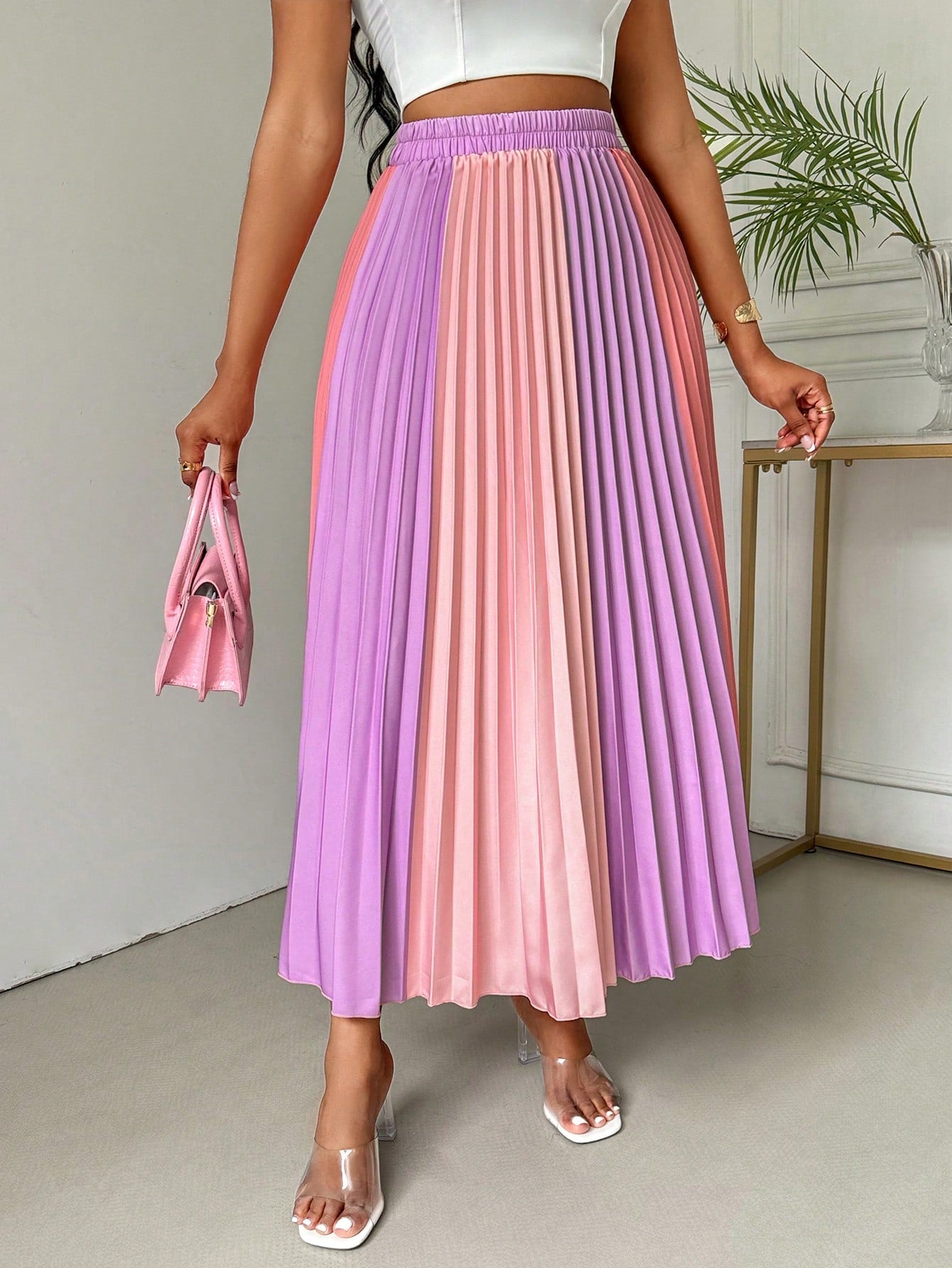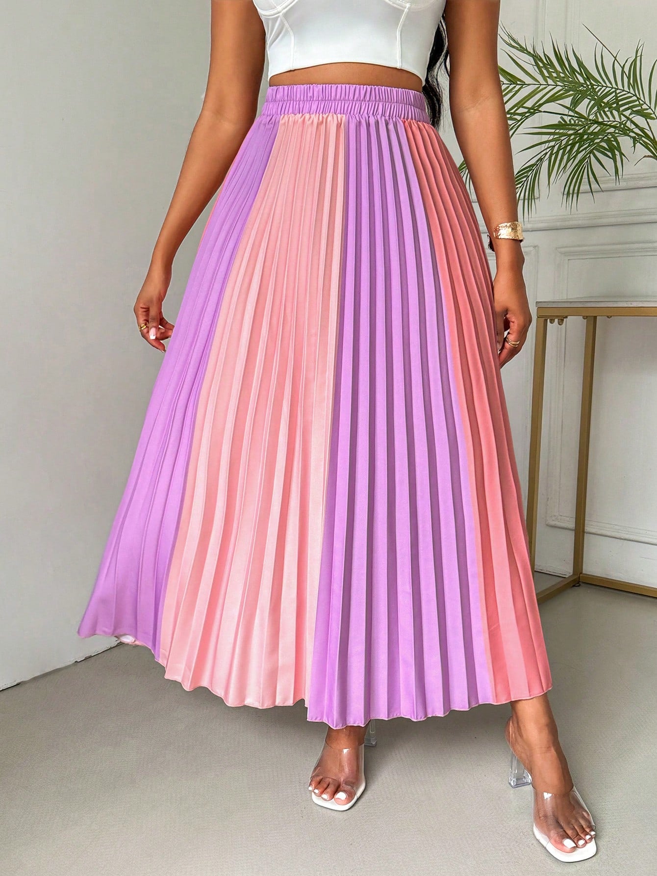 VaVaLuxe Women's Elastic Waist Colorblock Pleated Long Elegant Skirt Maxi Women Outfit