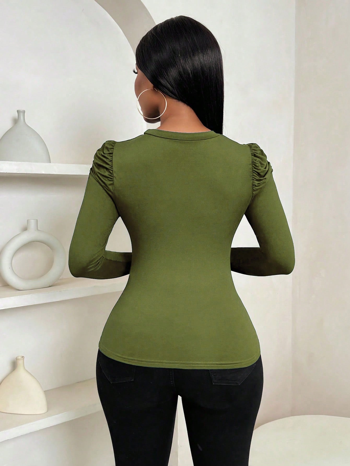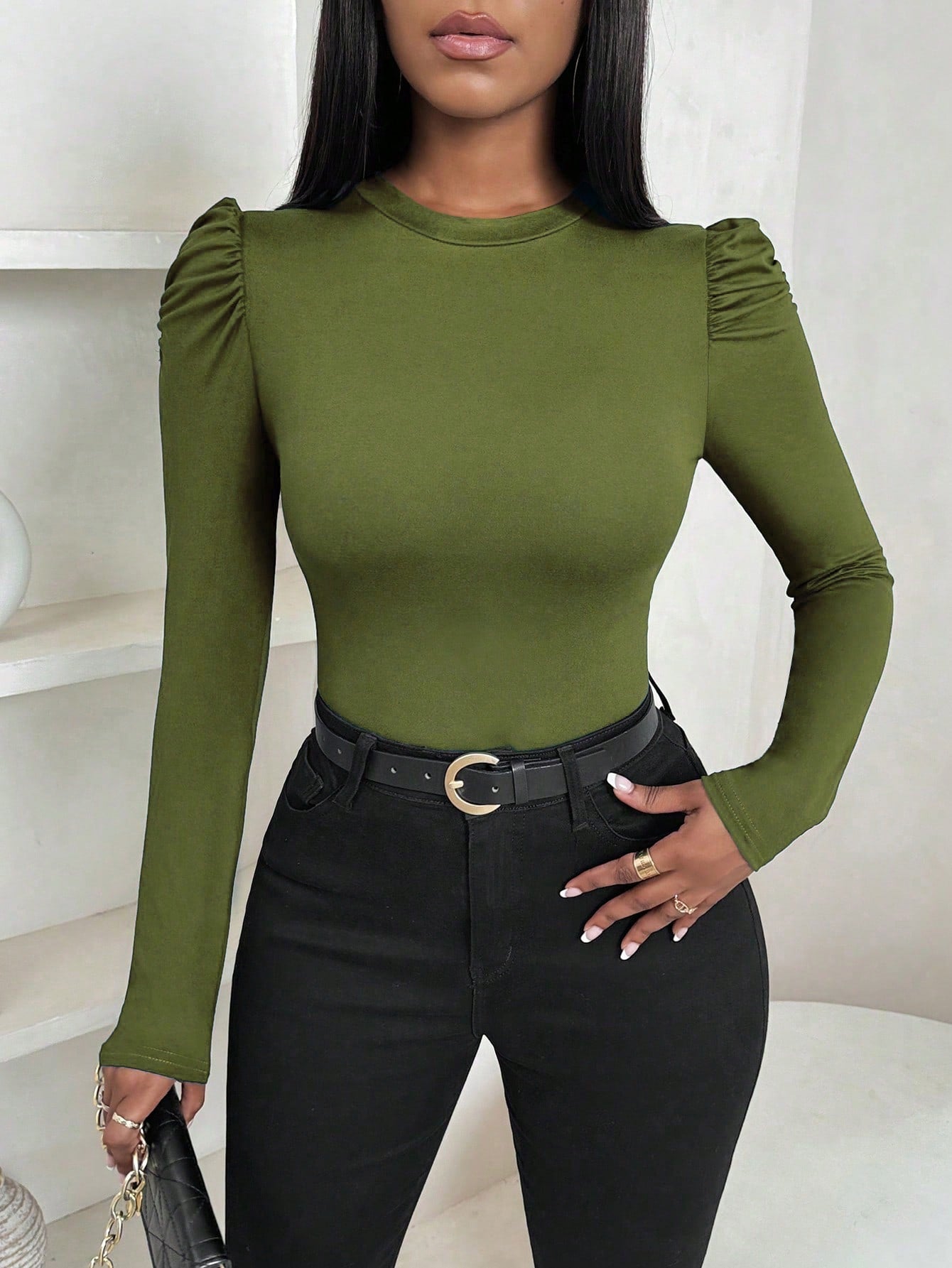 VaVaLuxe Women's Round-Neck Puff Sleeve Women's Elegant Slim Long-Sleeved T-Shirt, Autumn And Winter Women's Clothing, Bottom T-Shirt