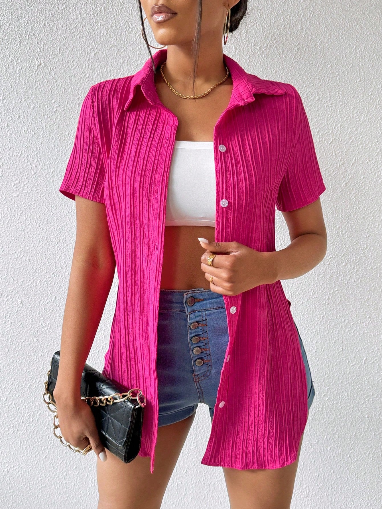 VaVaLuxe Women'S Solid Button Front Textured Shirt,Short Sleeve Tops