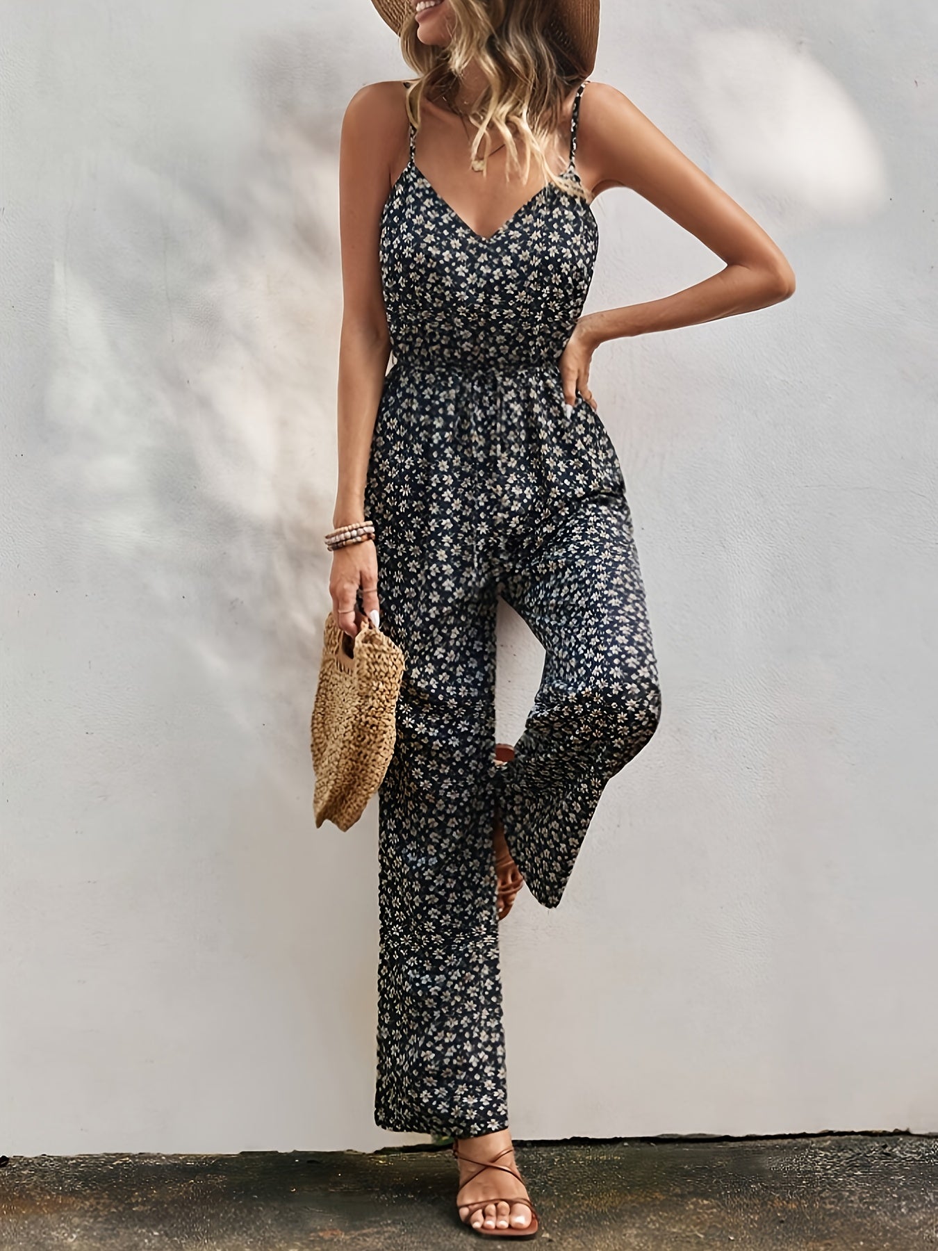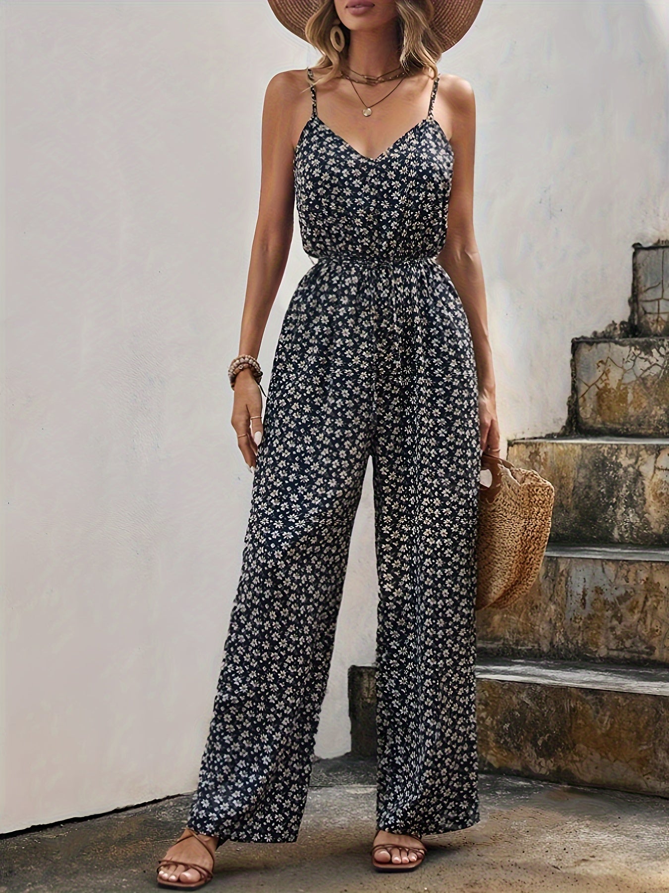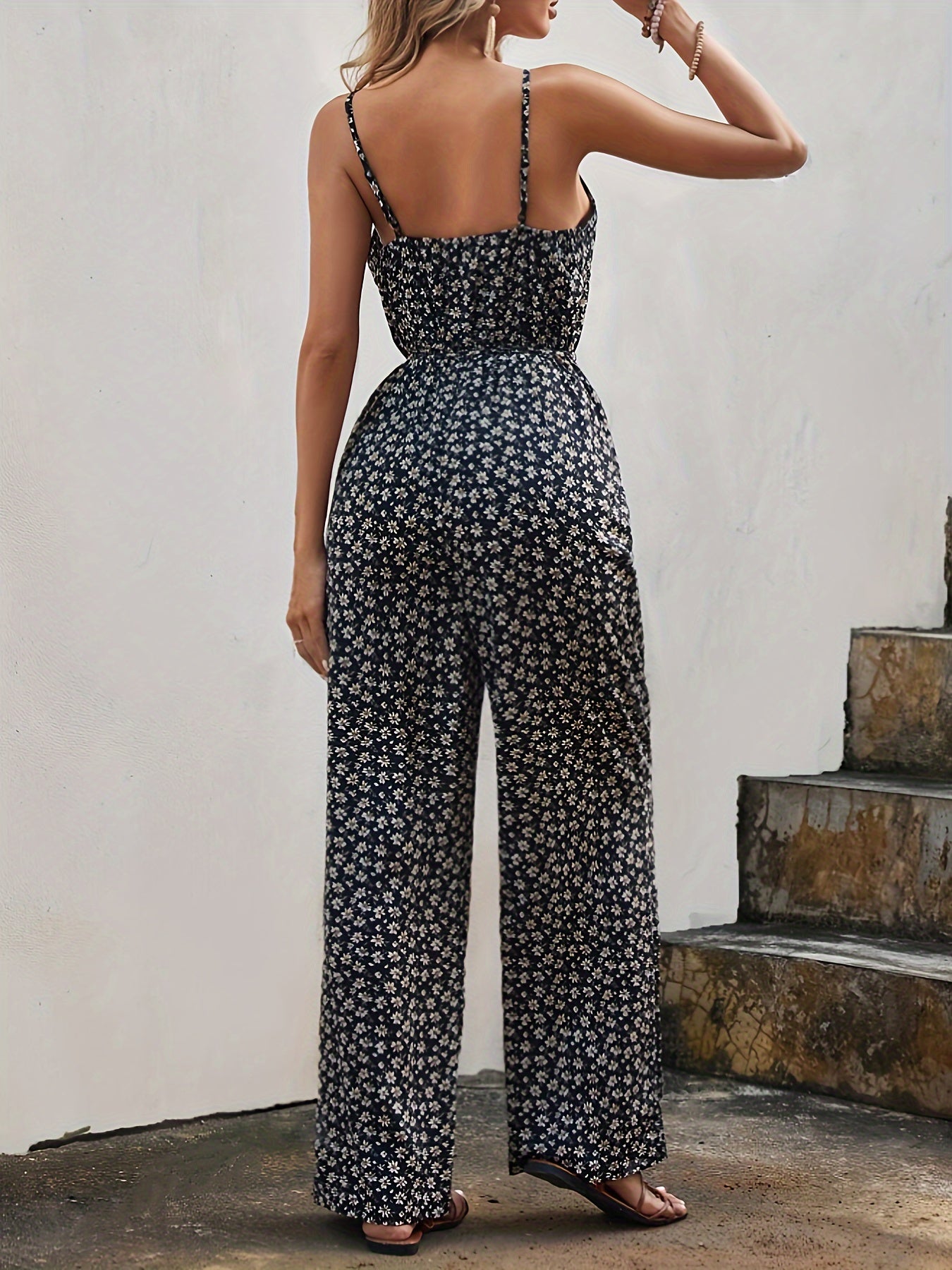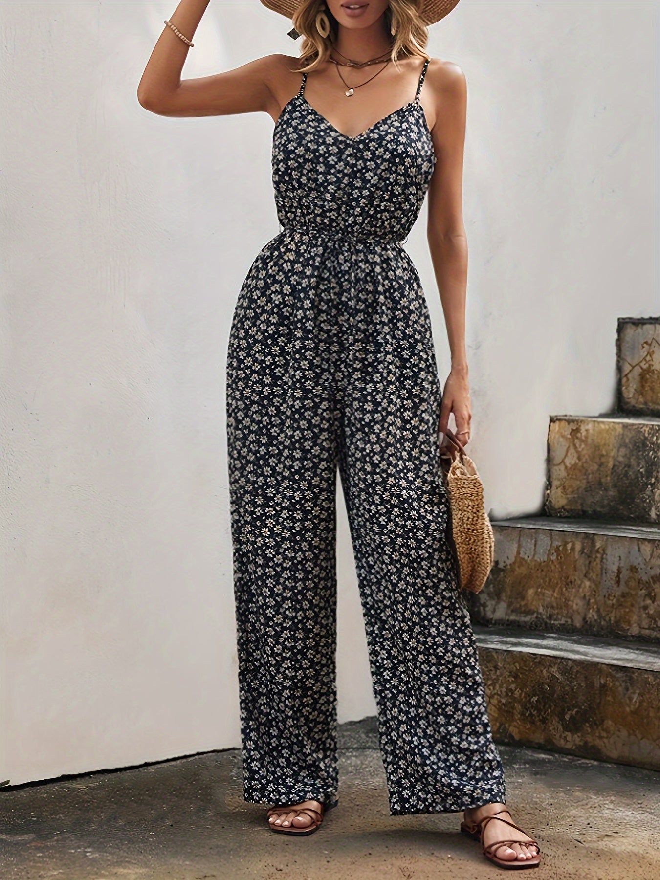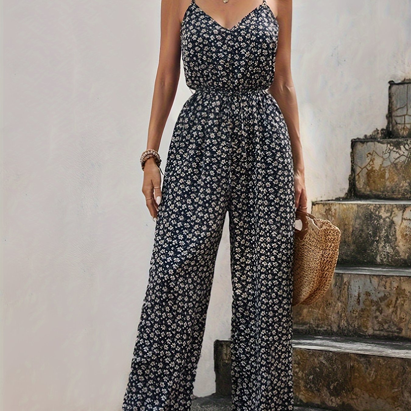 Vibrant Floral Print Wide Leg Jumpsuit - Backless, Spaghetti Strap, V Neck, Elegant Design for Spring & Summer - Women's Stylish Clothing for Outdoor Activities