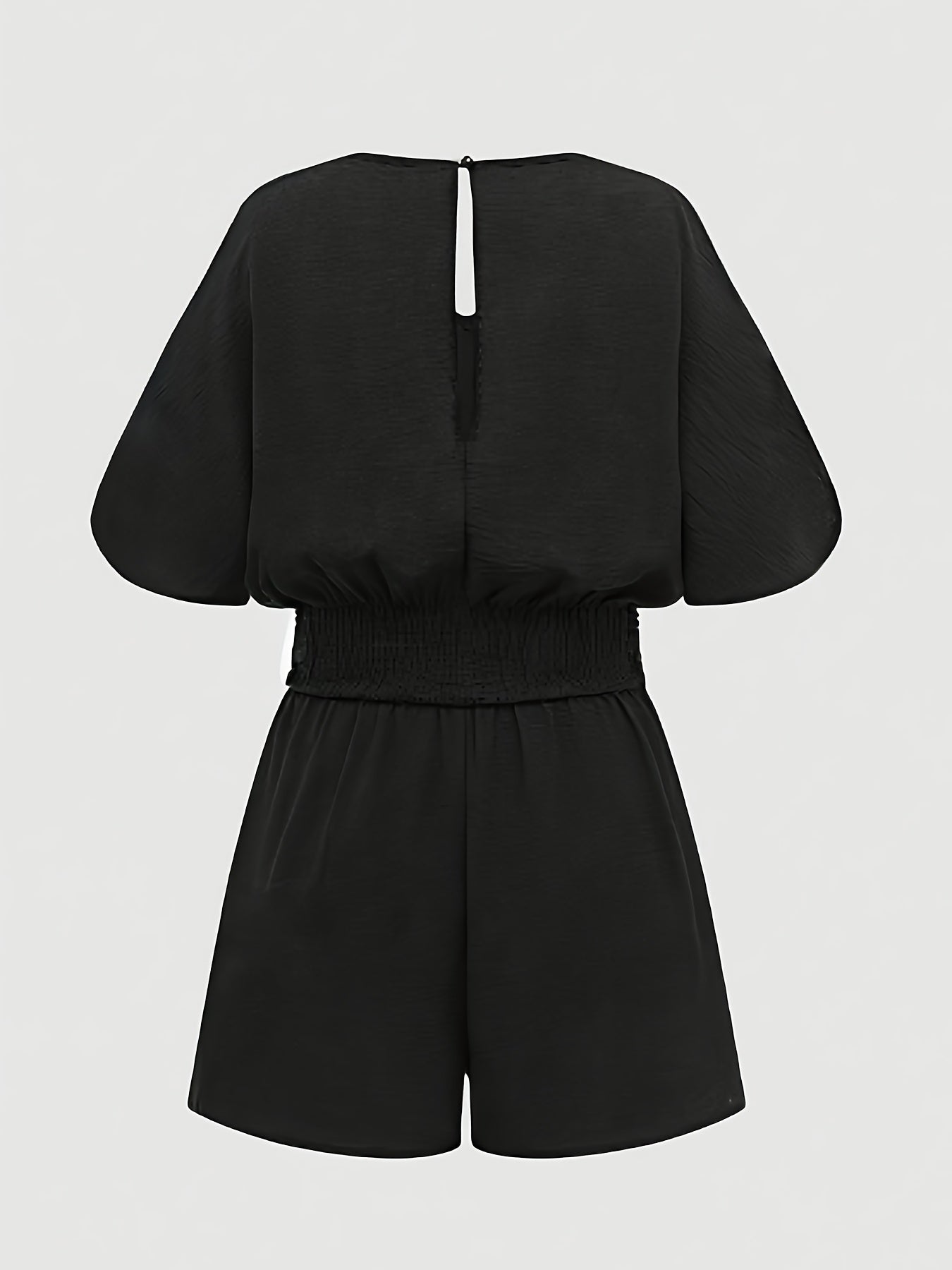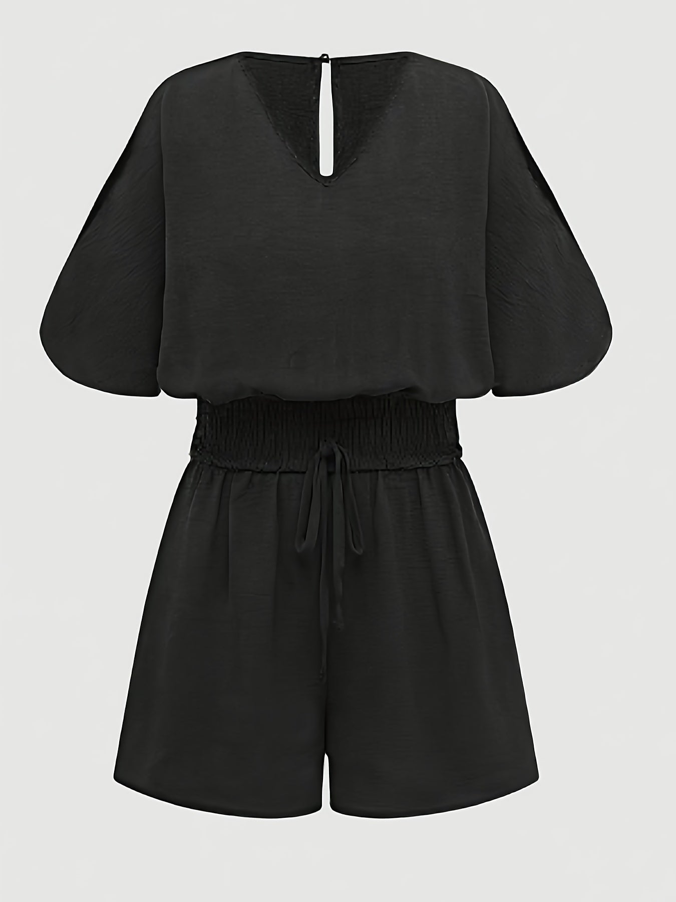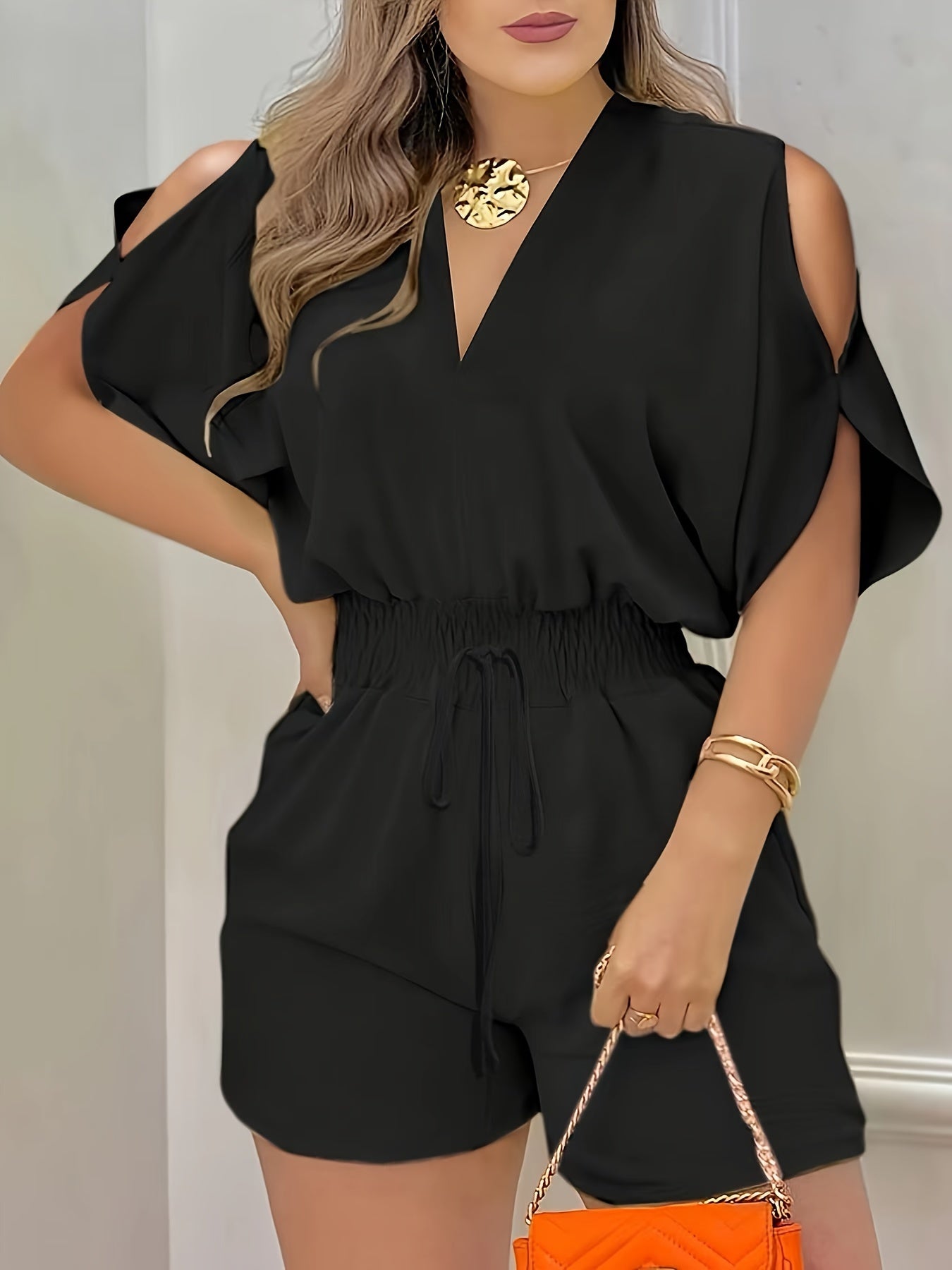 Vibrant V-Neck Romper Jumpsuit - Elegant Cold Shoulder, Cinched Waist, Short Sleeves, Comfortable Fabric - Perfect for Spring & Summer, Women's Fashion Clothing