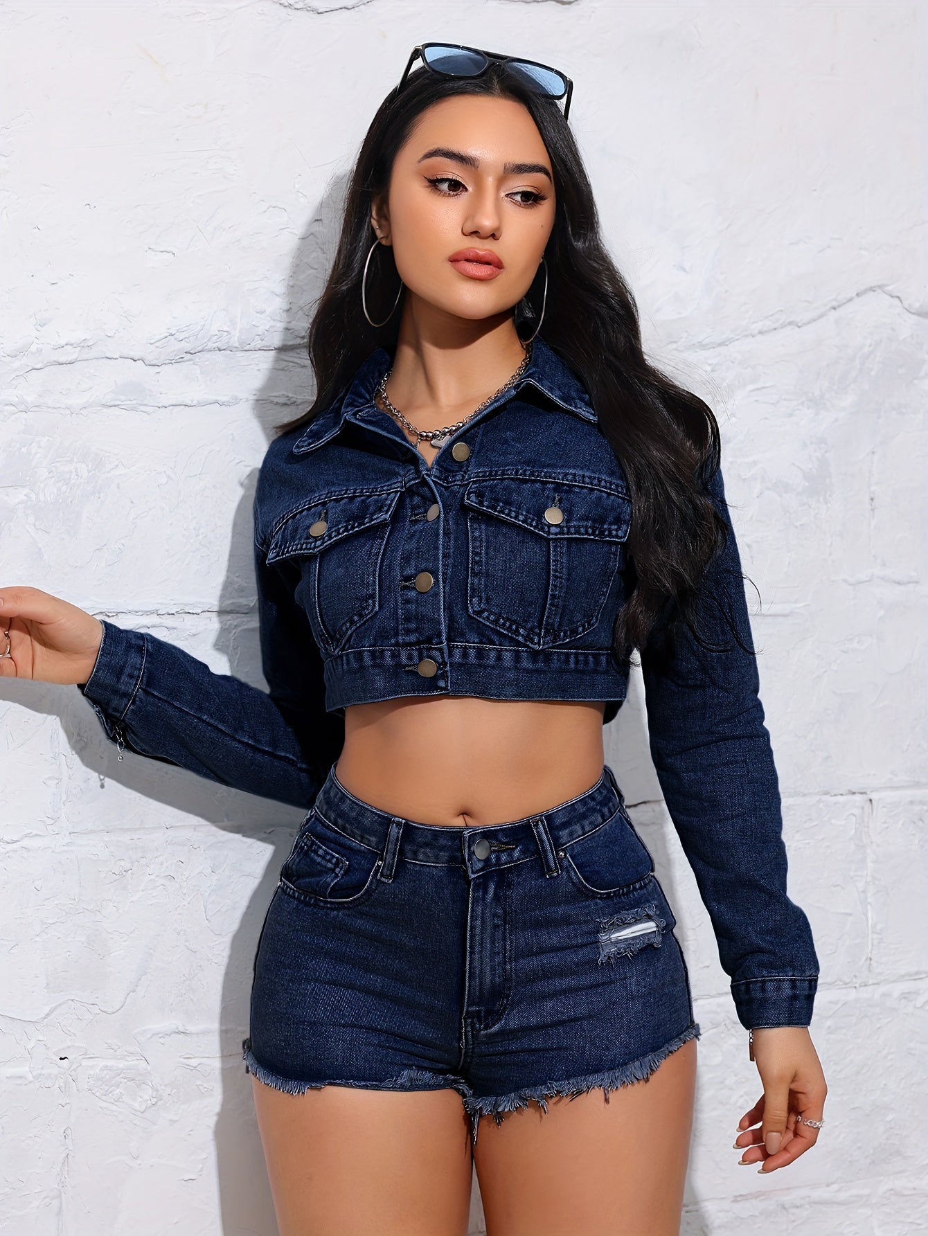 [Vintage Blue Denim Jacket] Vintage-Inspired Blue Denim Jacket - Chic Women's Short Style with Raw Hem & Distressed Details - Long Sleeves, Button Closure, Non-Stretch Fabric