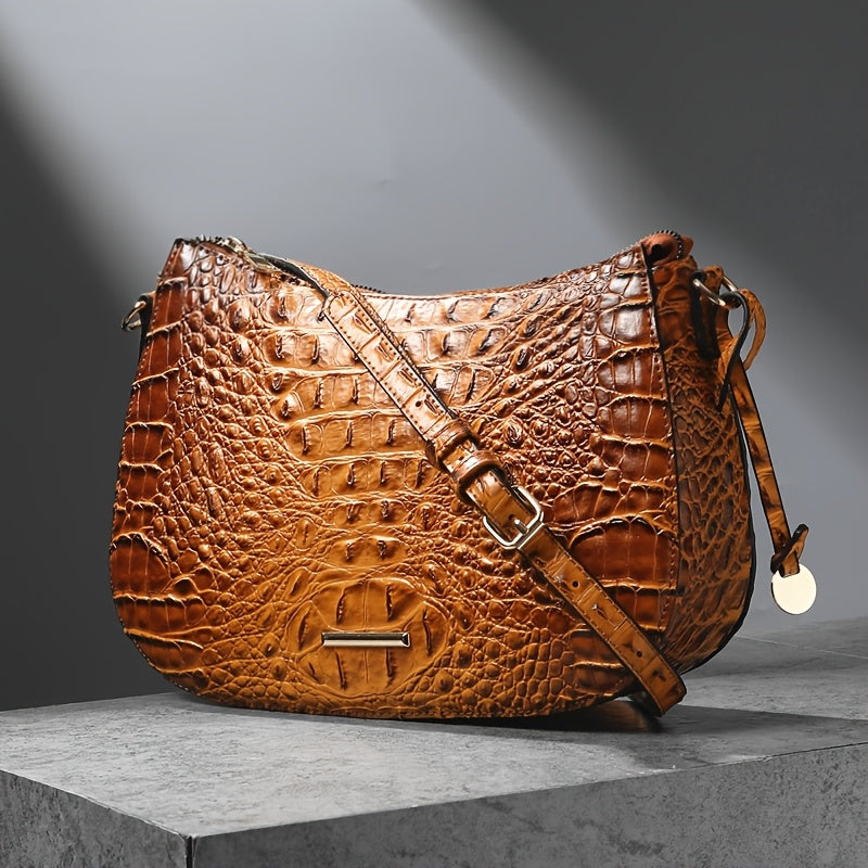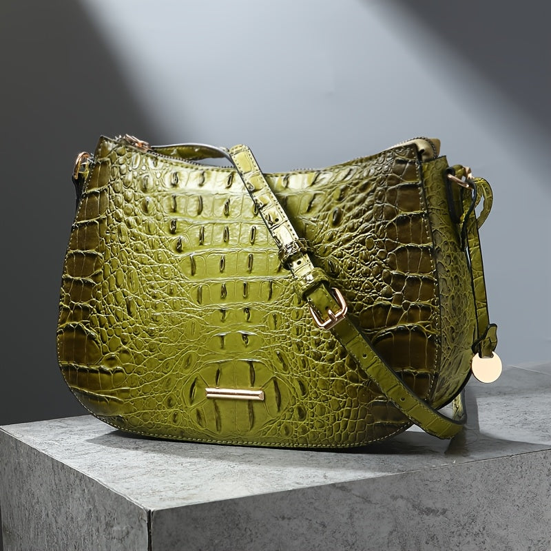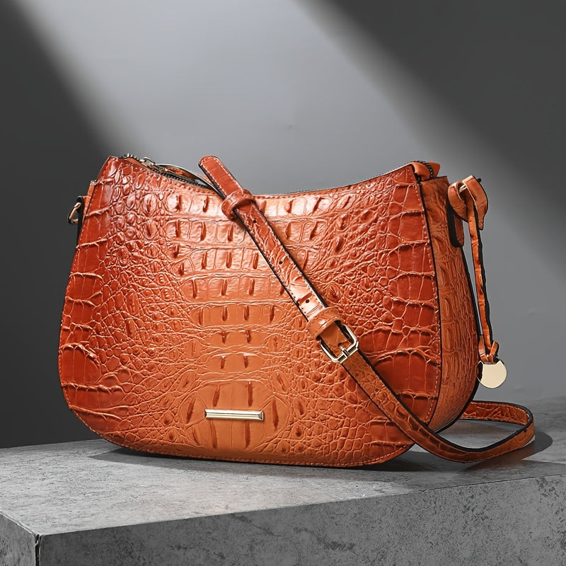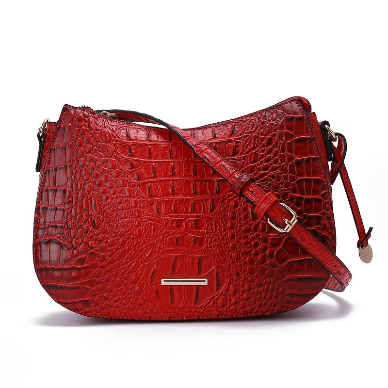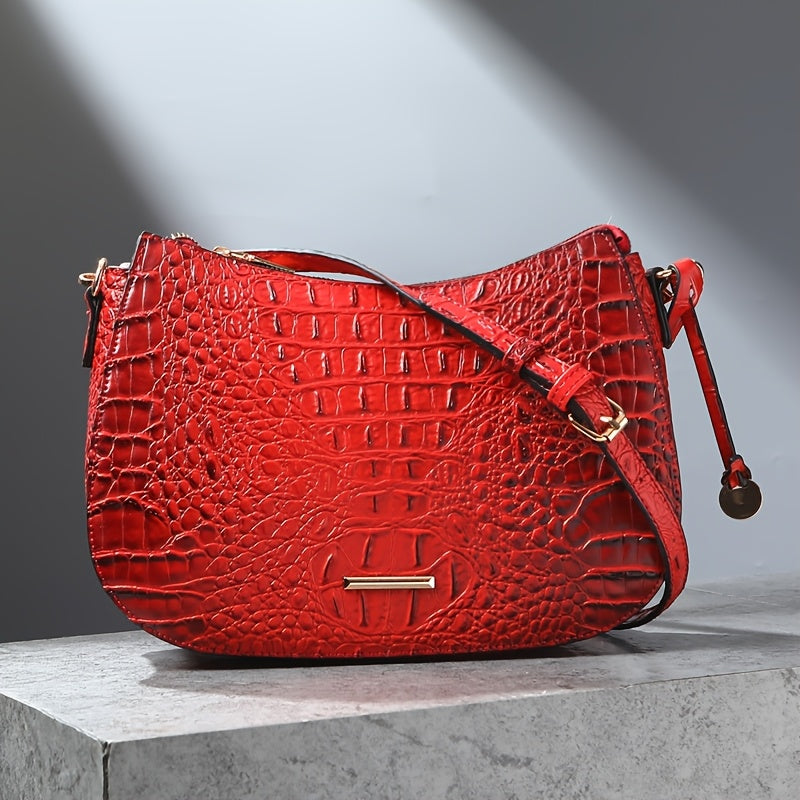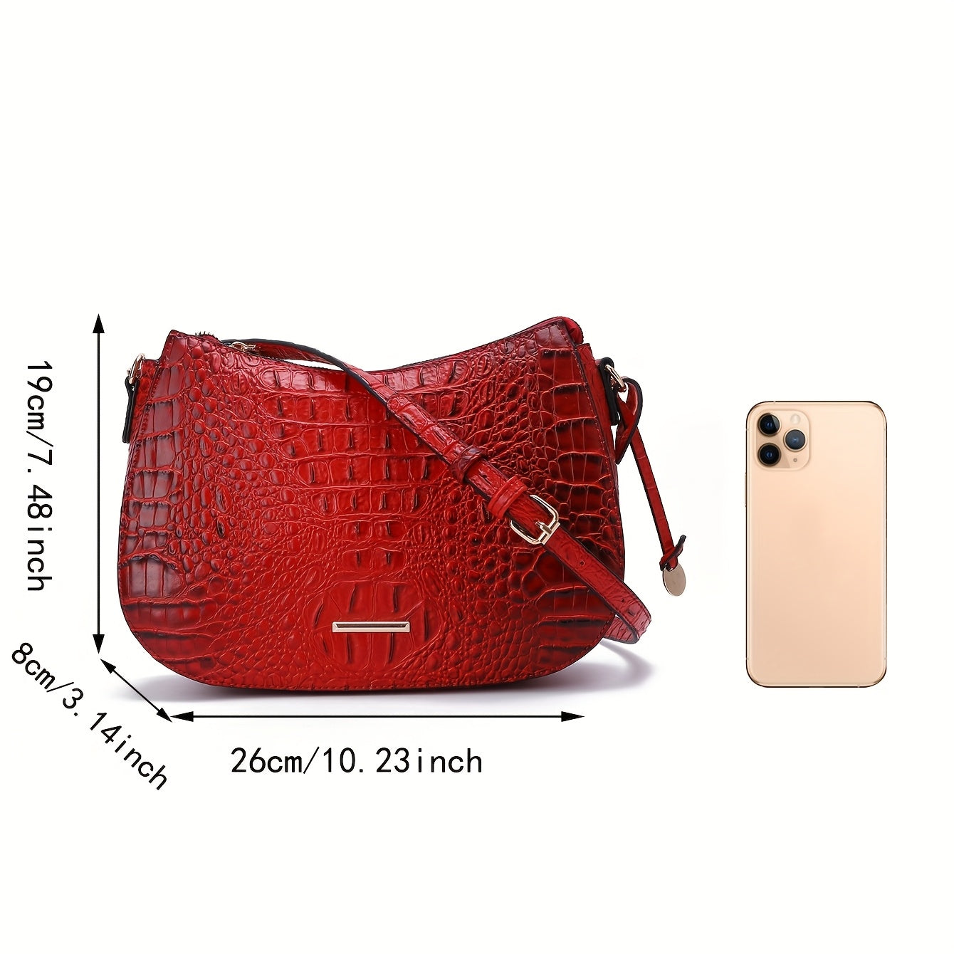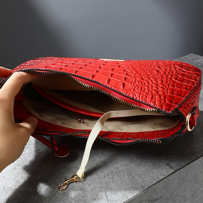 [Vintage Crossbody Bag] Vintage-Inspired Red Crossbody Bag for Women - Glossy Finish, Adjustable Strap, Spacious Shoulder Purse with Metallic Clasp and Zipper Closure, Crocodile Pattern