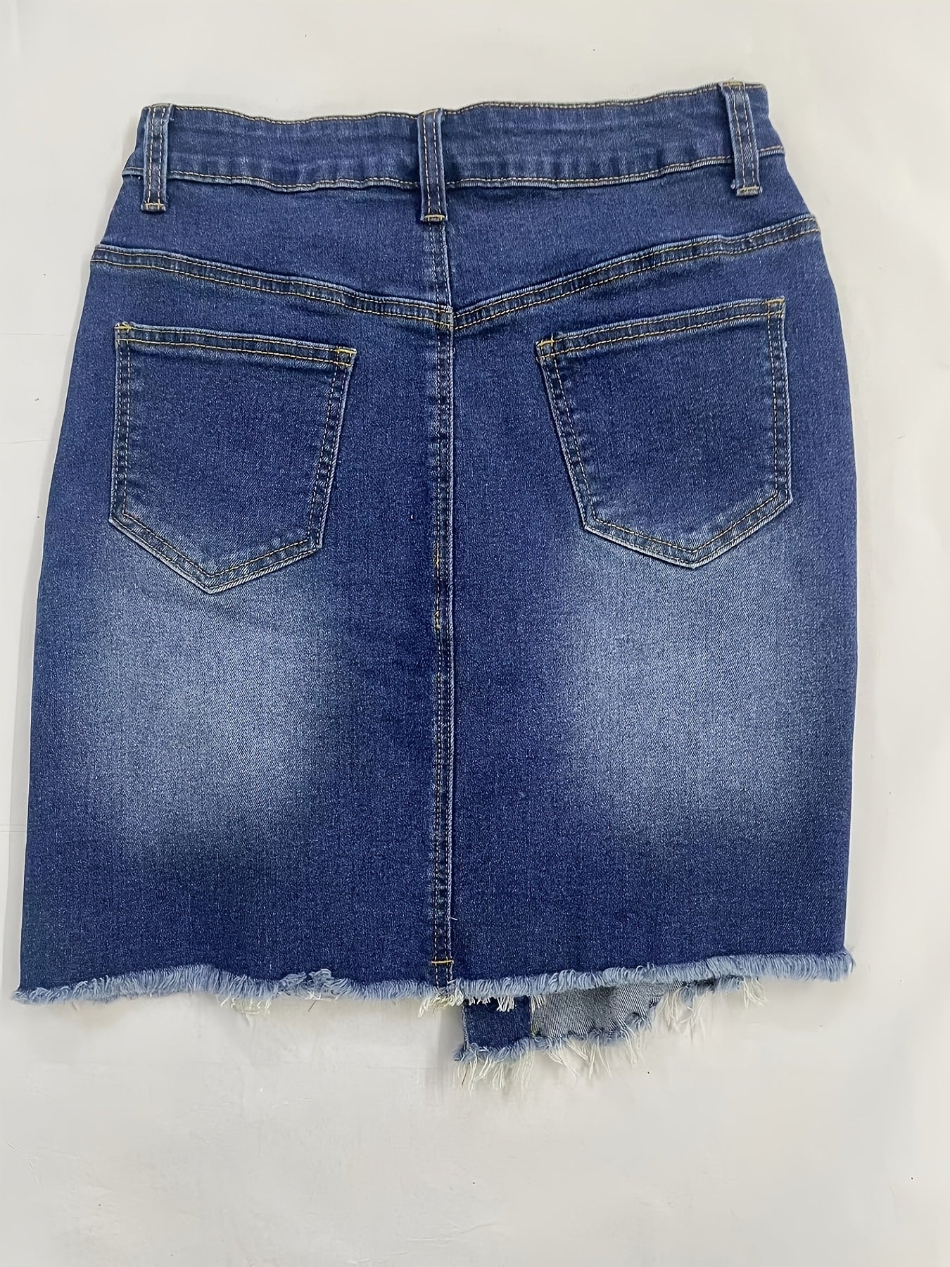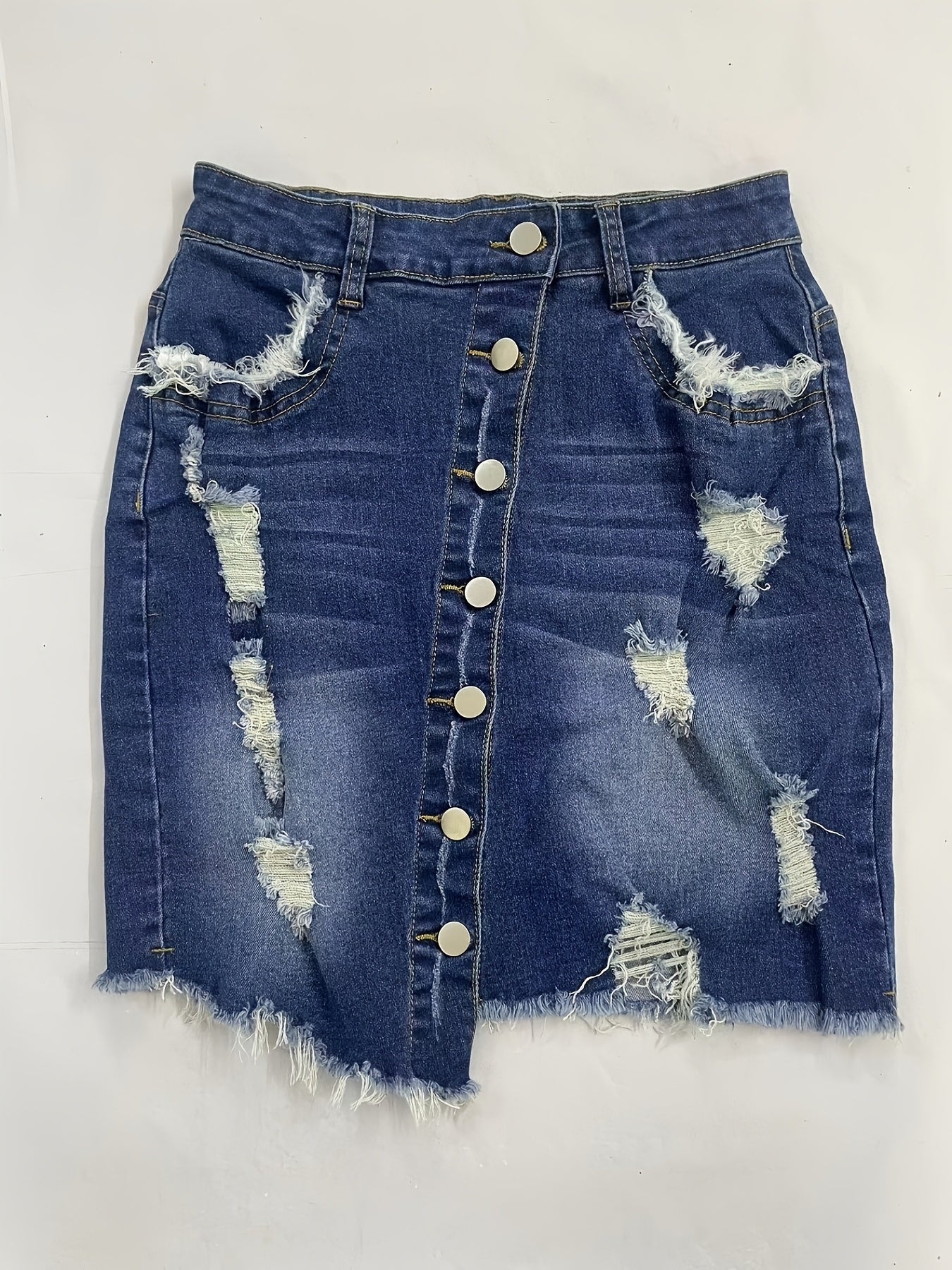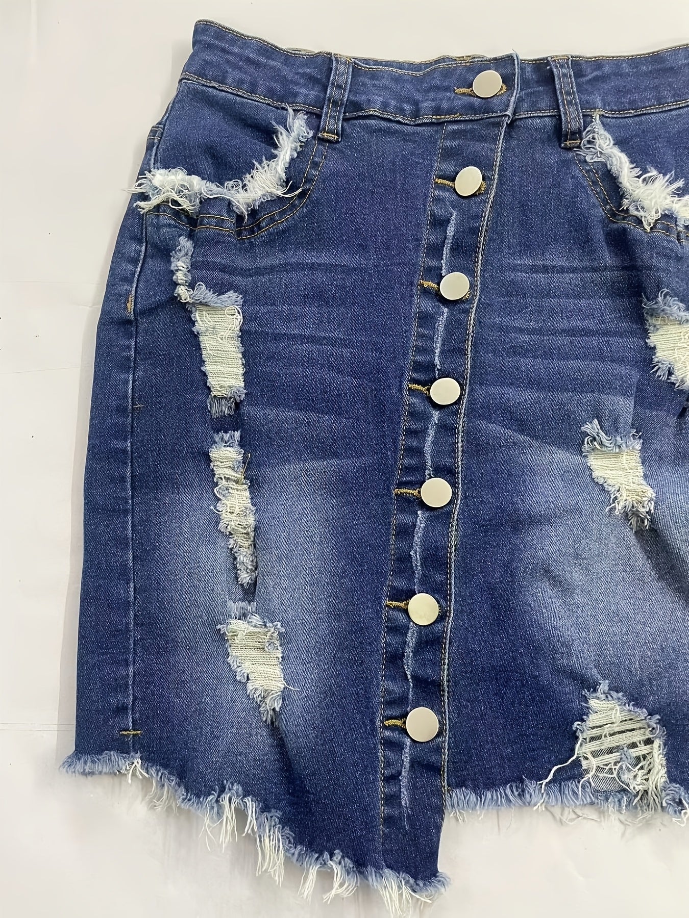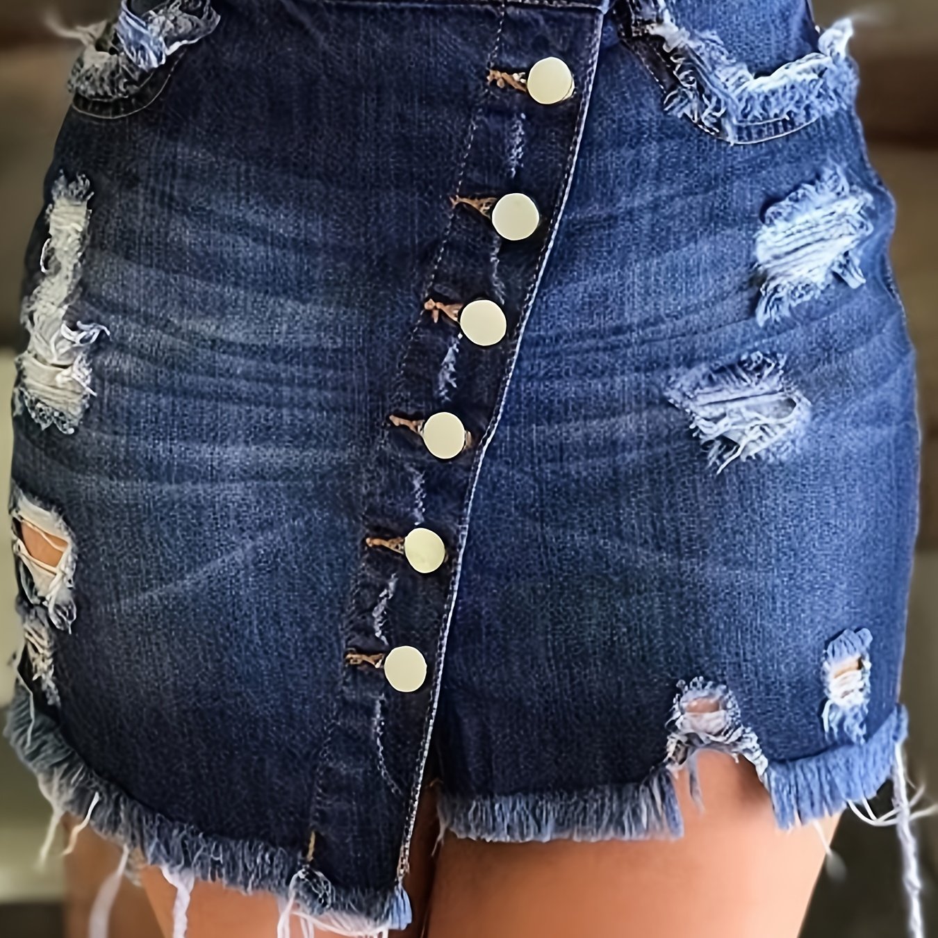 [Vintage Denim Mini Skirt] Vintage-Style Stretchy Denim Mini Skirt - Distressed Details, Raw Hem, Button-Fly Closure, Frayed Edges, Ideal for Spring/Summer/Fall