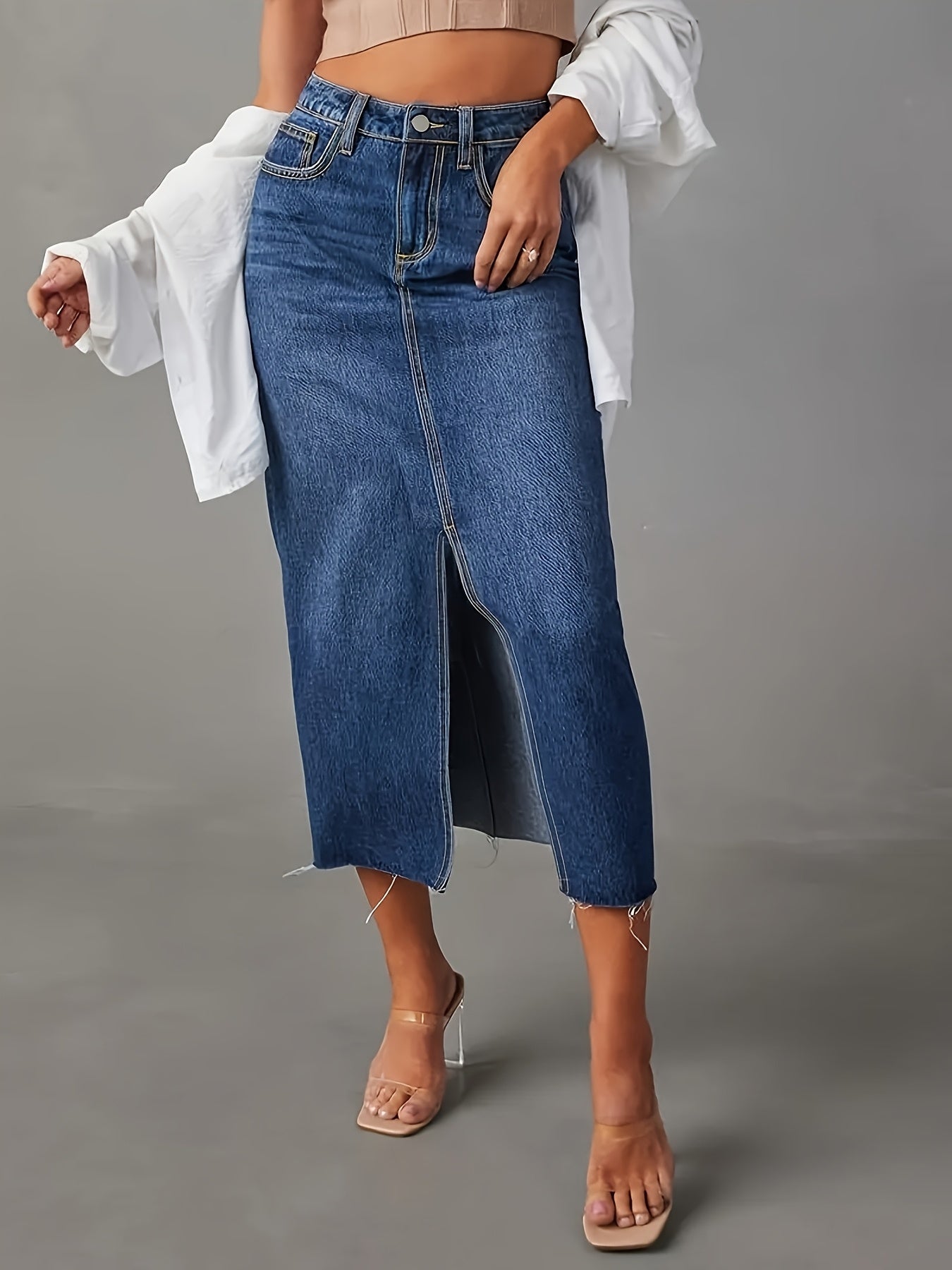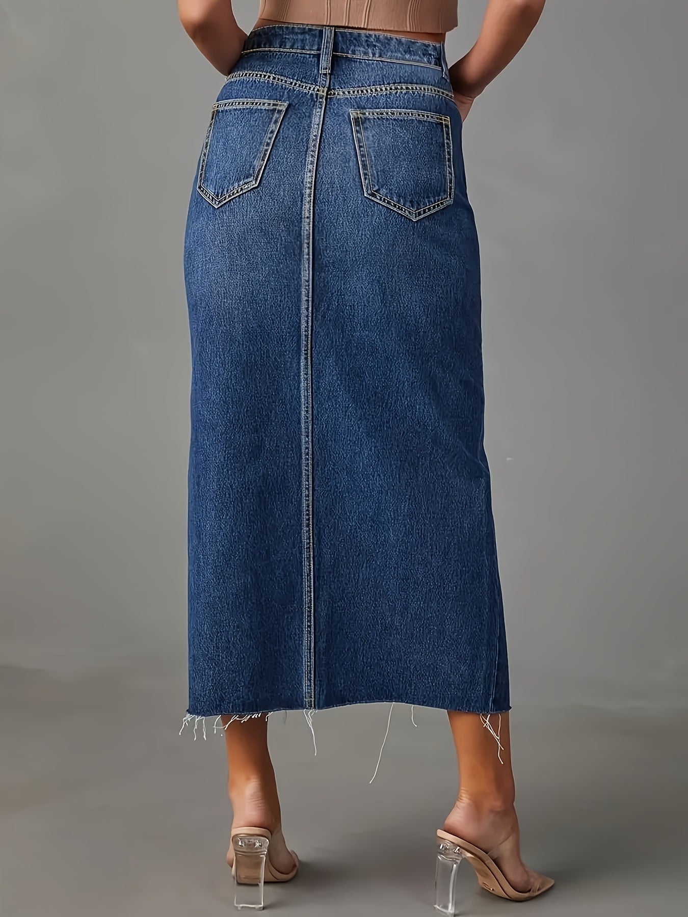 Vintage-Inspired Women's Denim Midi Skirt - Stretchy Rayon Blend, Slant Pockets, Versatile for Spring/Summer/Fall, Machine Washable, Denim Skirt