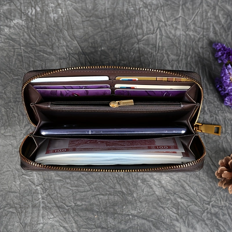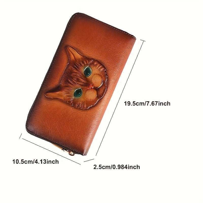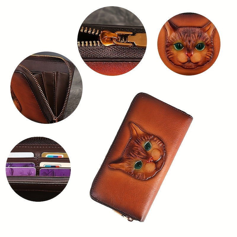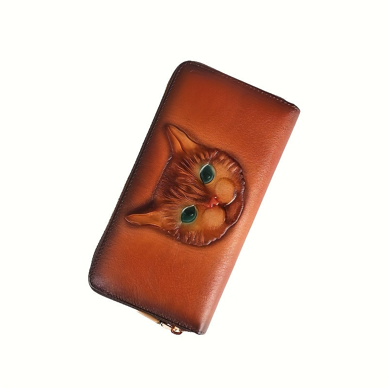 Vintage-Inspired Women's Genuine Genuine Leather Wallet with Classic Cat Pattern, Multi-Card Slots, Zippered Coin Pocket, Polyester Lining, Double Fold Design - Easy to Clean, Guangzhou Crafted, Cute Wallet