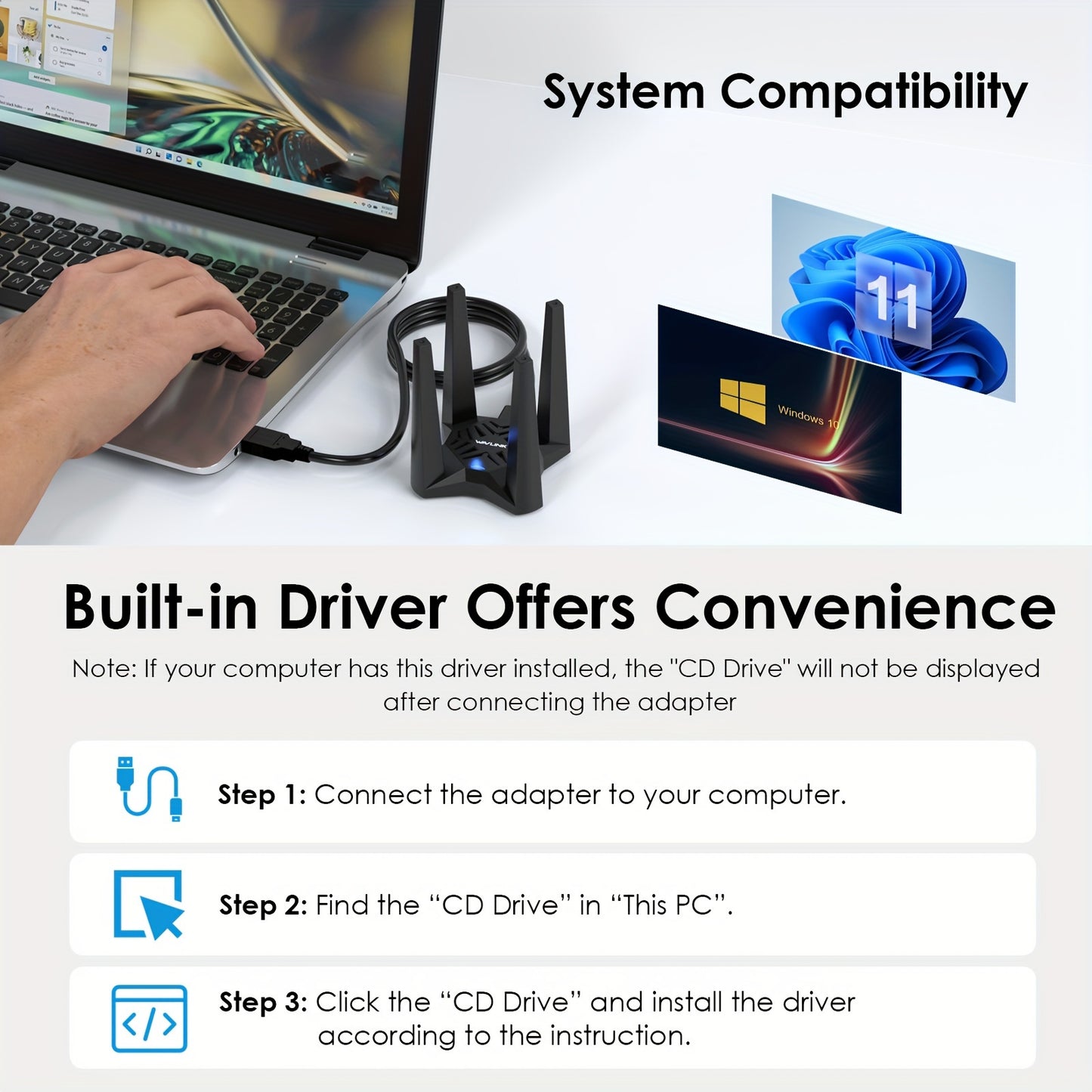 WAVLINK Adaptateur Wi-Fi 6 pour PC USB AX1800 - Double bande 5 GHz + 2,4 GHz, MU-MIMO, Chiffrement WPA3, Antennes 4x3 dBi, Pilote intégré, Compatible Windows 11/10, Câble USB-A et Guide de démarrage rapide inclus, Finition noire élégante | Fonction pilote