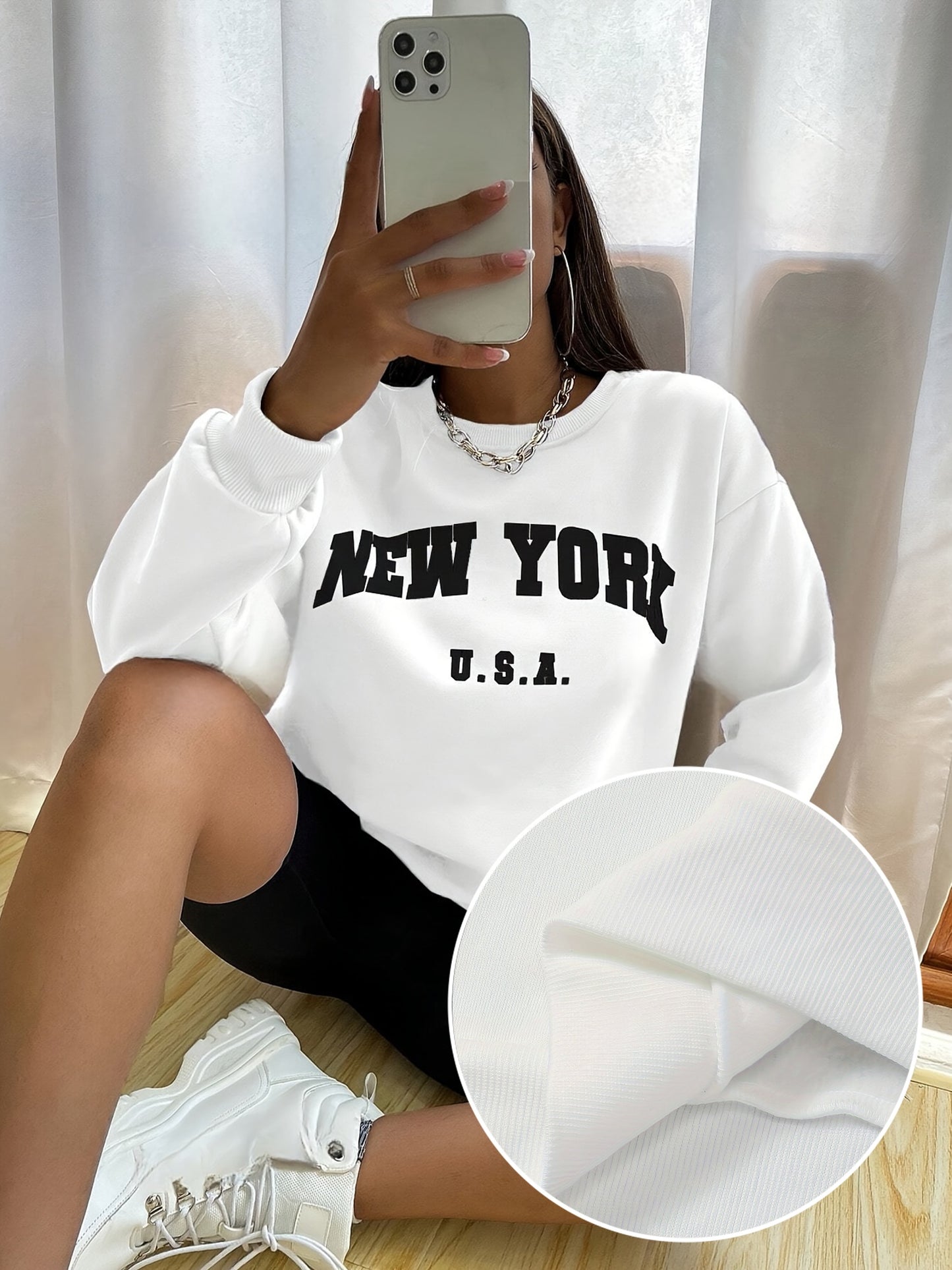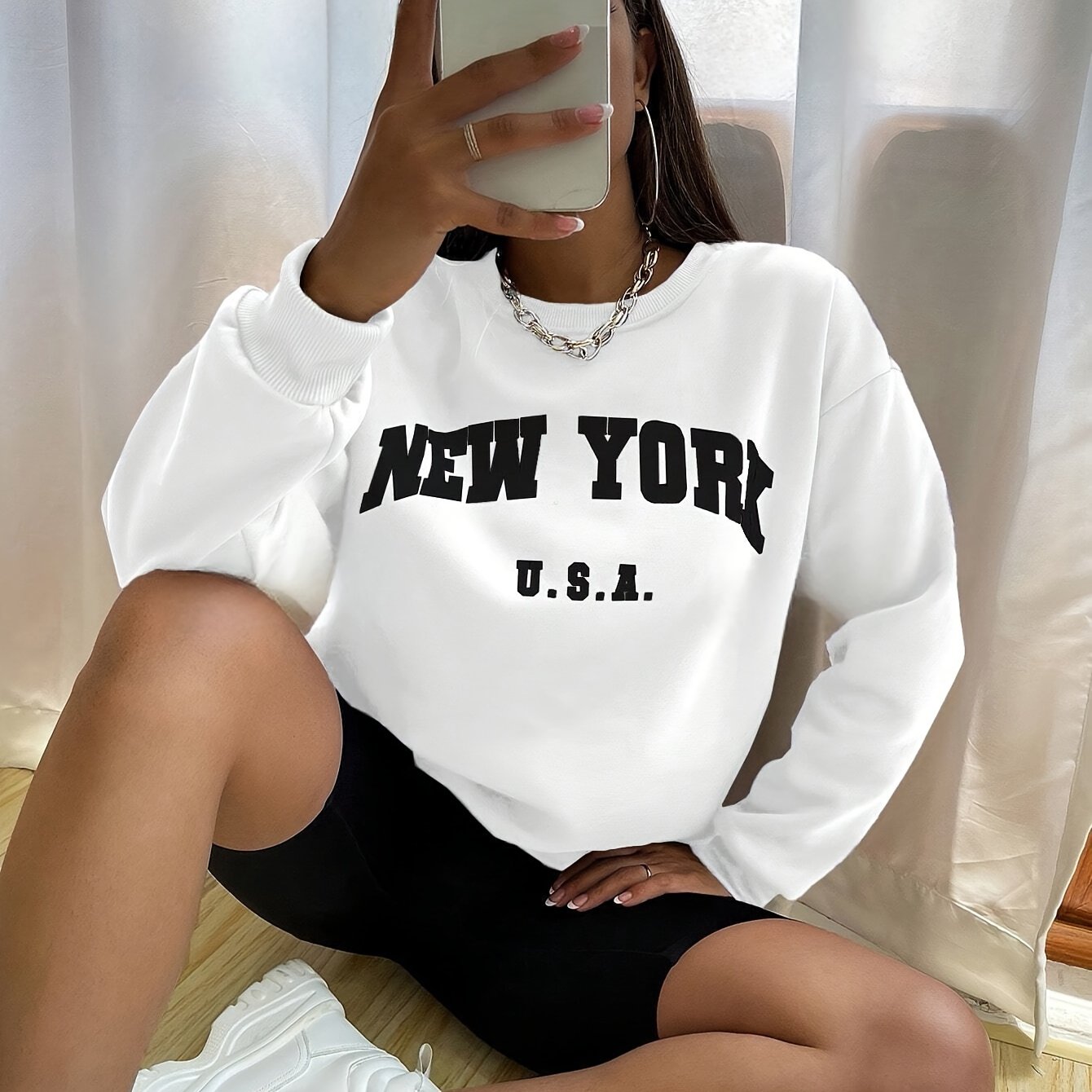 Winter & Fall Crew Neck New York Letter Print Sweatshirt, Casual Women's Clothing