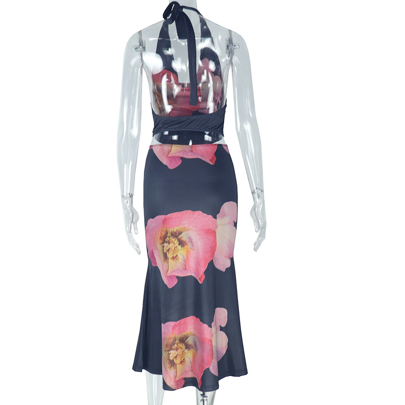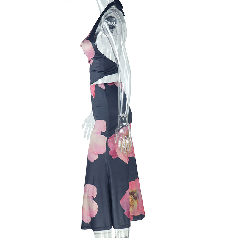 Women Clothing Fashionable Elegant Slim Fit Printed Skirt Set Mid Length Sleeveless Halter V neck Two Piece Set