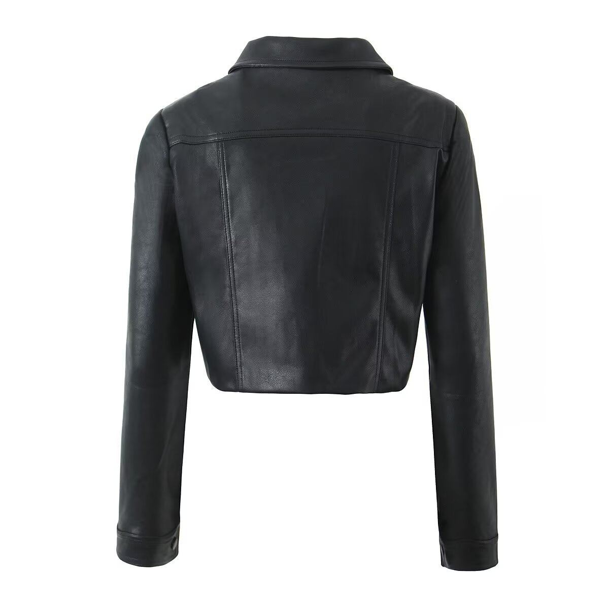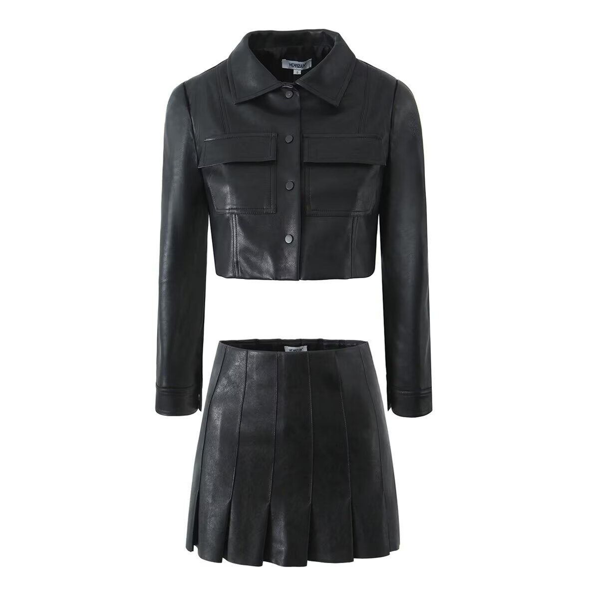Women Clothing Locomotive Cropped Leather Coat Pleated Leather Skirt Two Piece Set