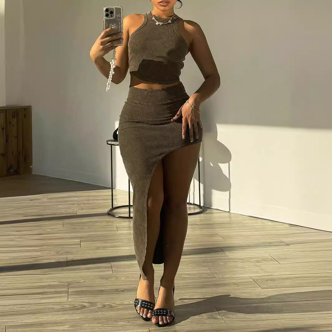 Women Clothing Summer Vest Sheath Suit Thread Fitted Irregular Asymmetric Maxi Dress Two Piece Set