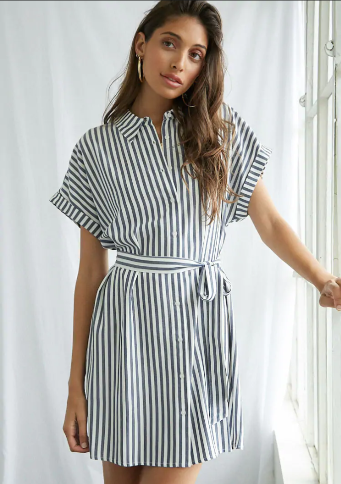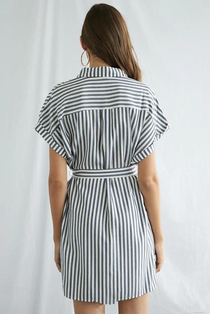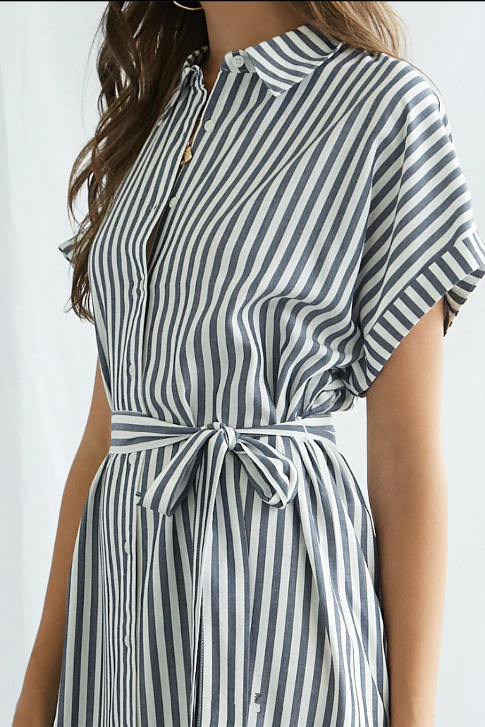 Women Summer Elegant Striped Lapel Belt Dress