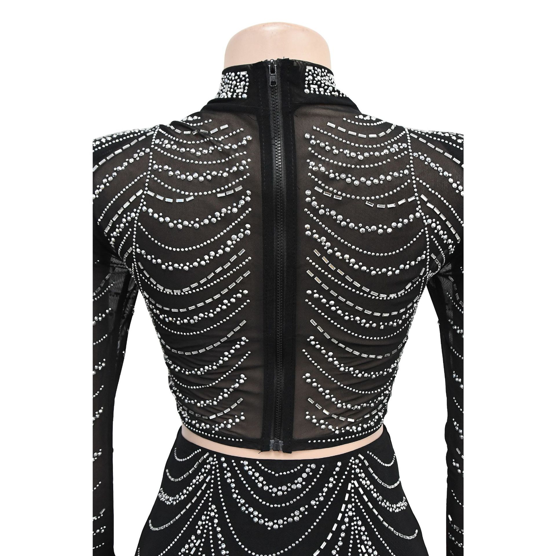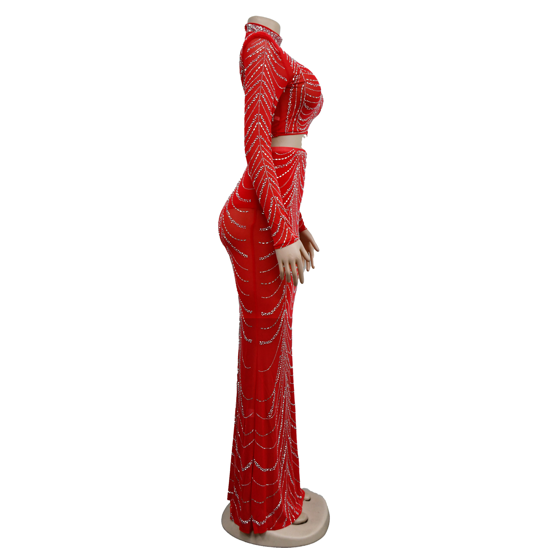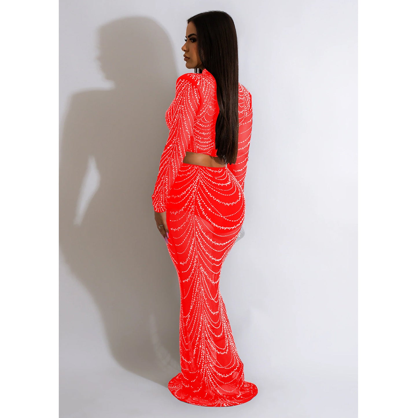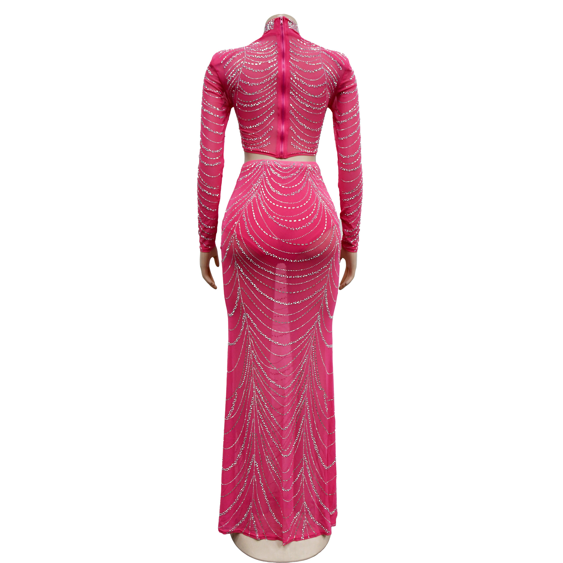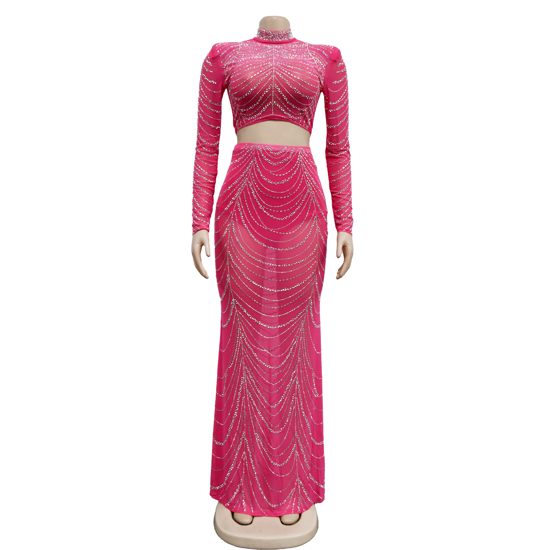 Women Wear Solid Color Mesh Drilling Long Sleeve Dress Two Piece Set