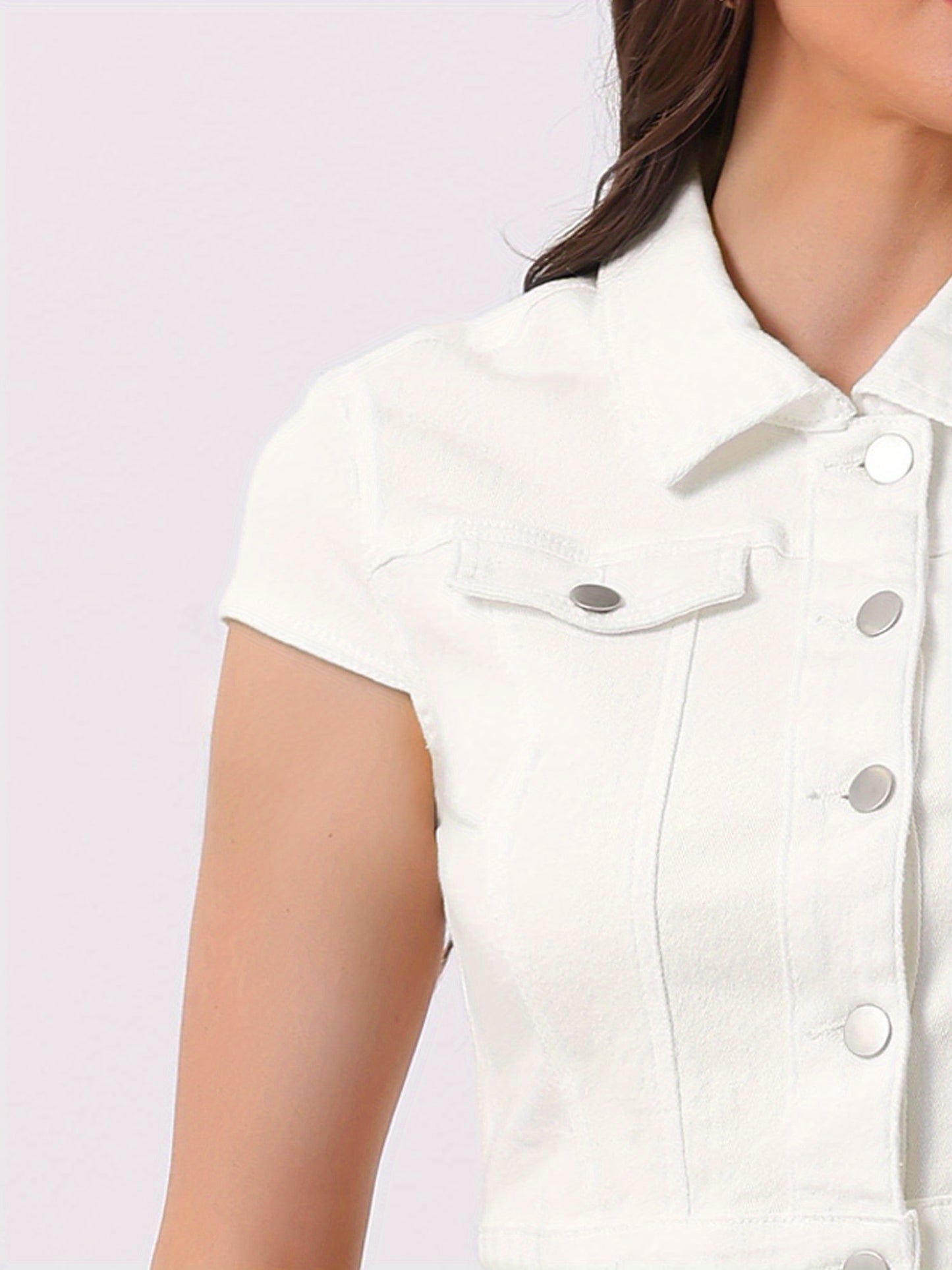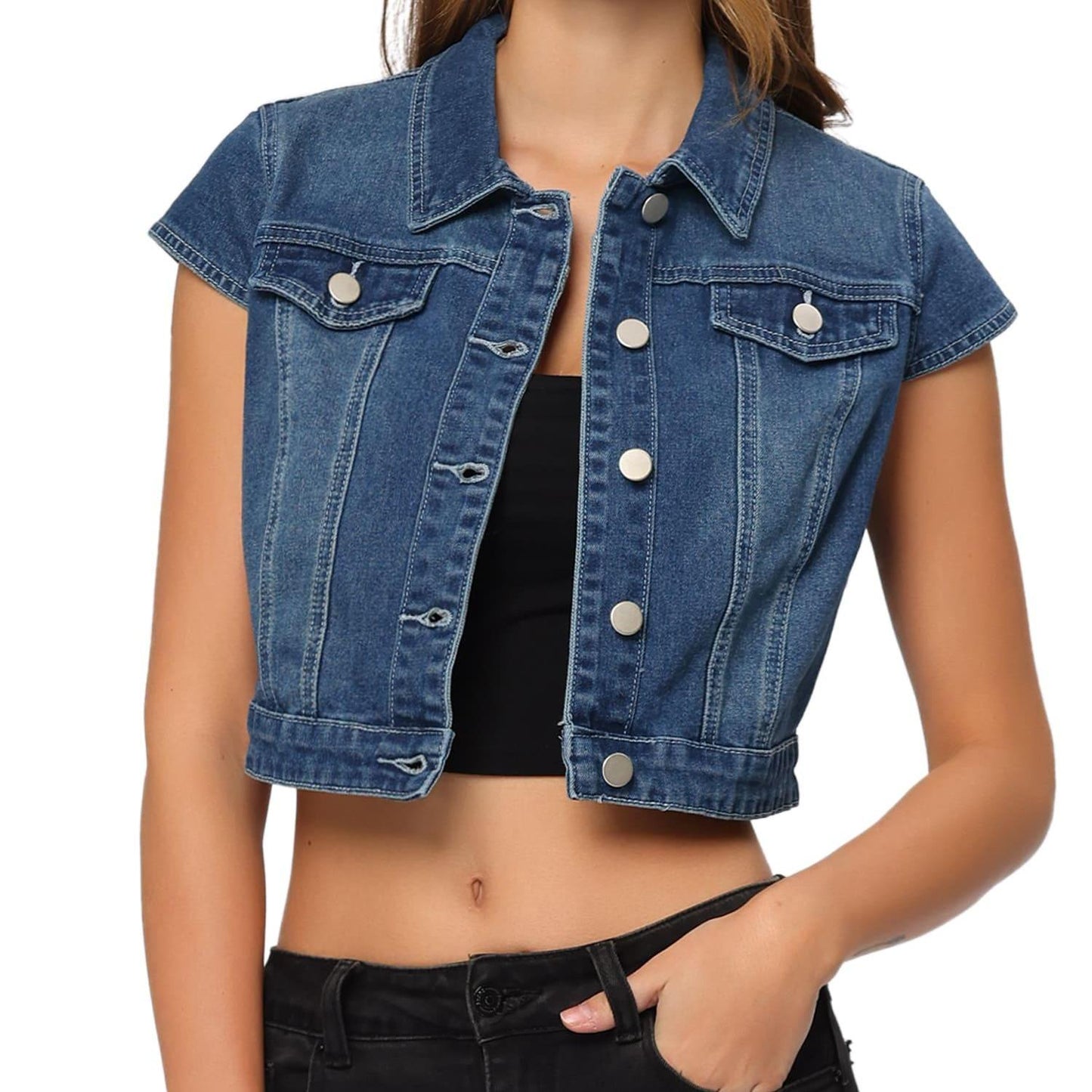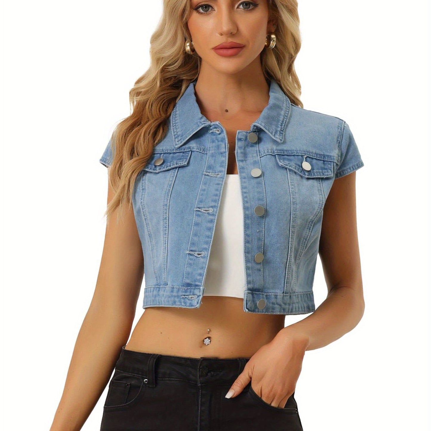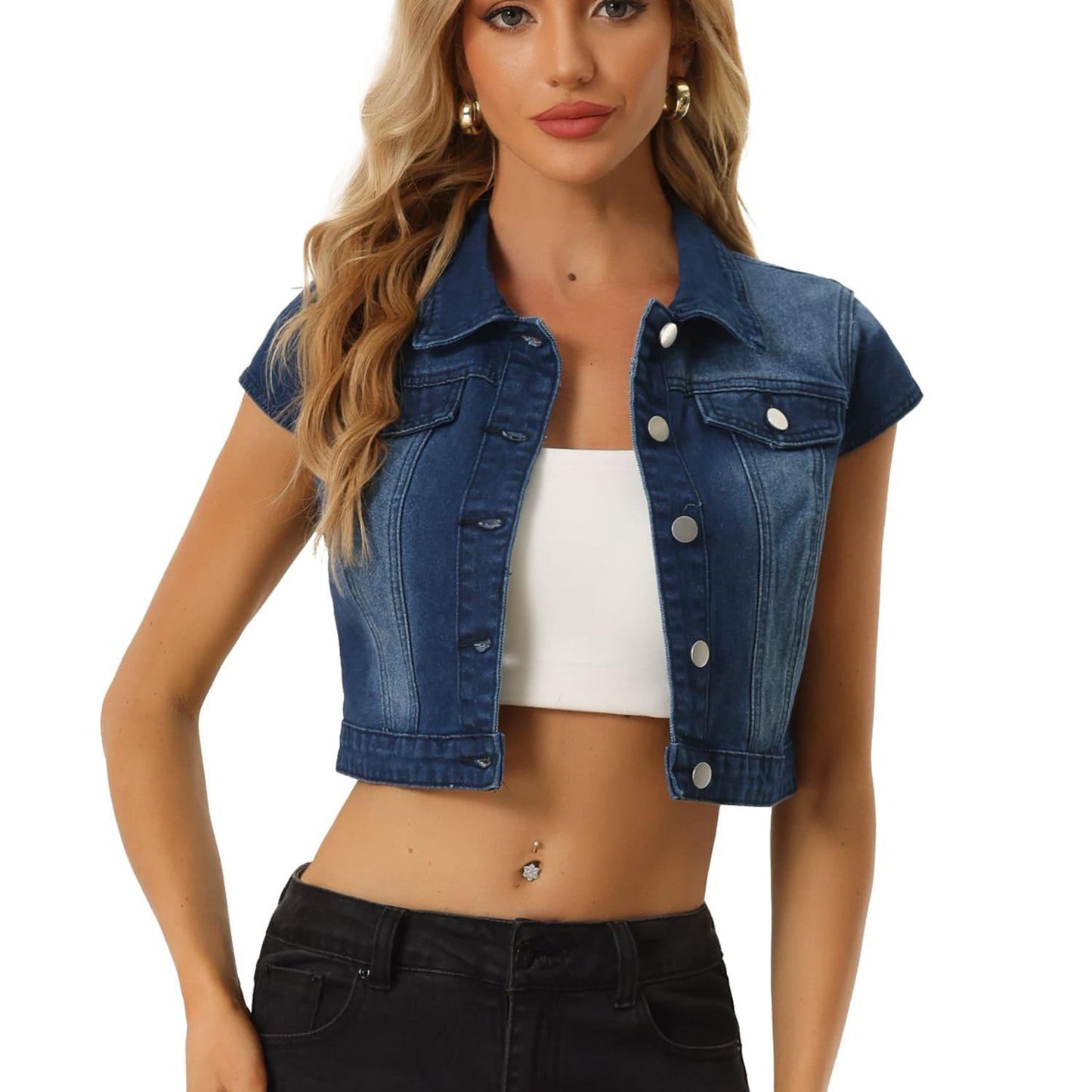 Women'S 2024 Summer Button Cap Short Sleeve Cropped Jean Denim Jacket