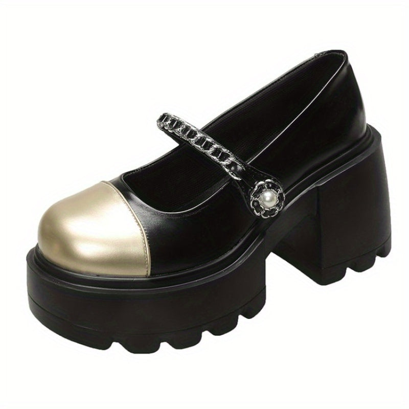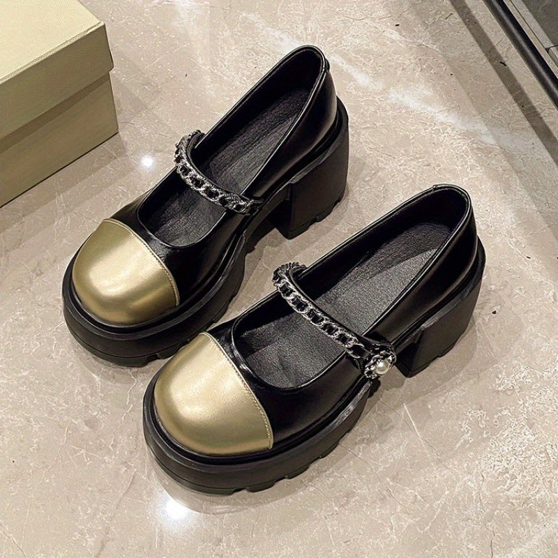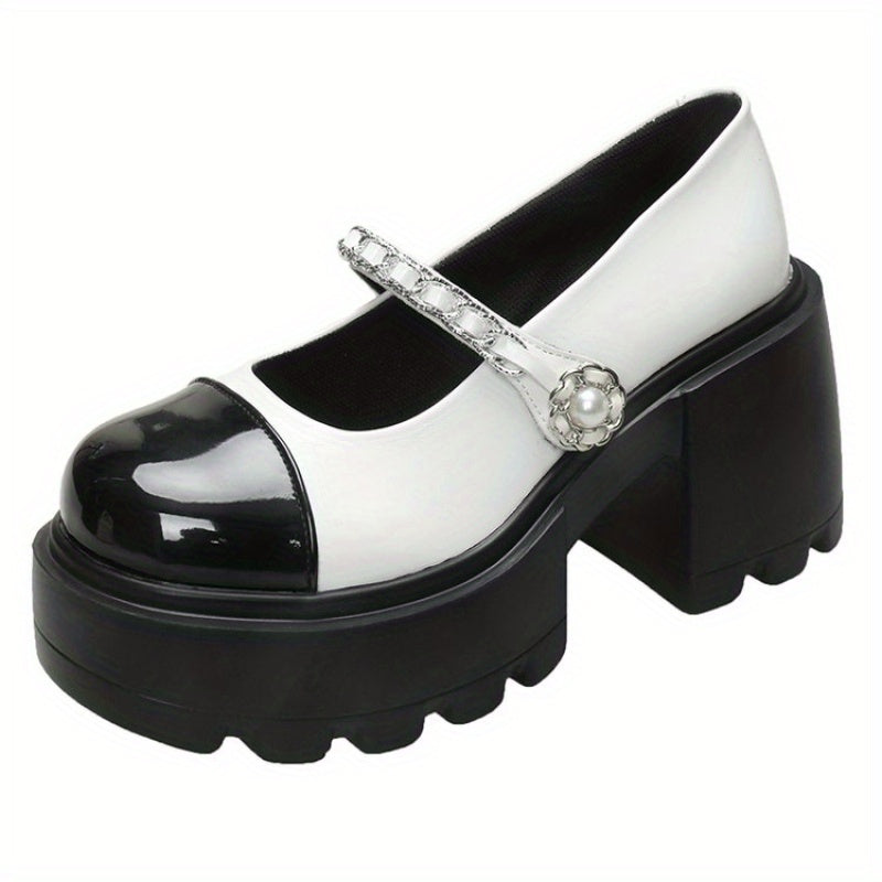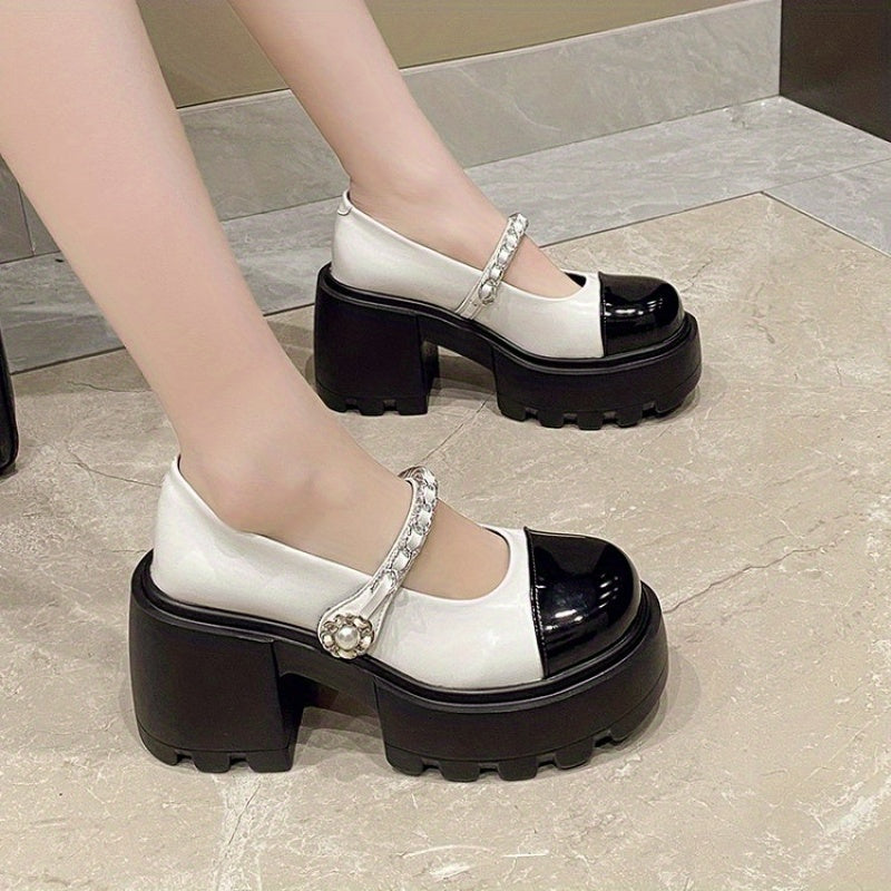 Women'S 2025 New French-Inspired Mary Jane Shoes - Black & White Color Block Chunky Heel Pumps with Round Toe, Synthetic Cover & Rubber Sole for Summer, Casual & Formal Occasions, High Heel Shoes, Formal Footwear, Round Toe Design, Durable Traction Footwe