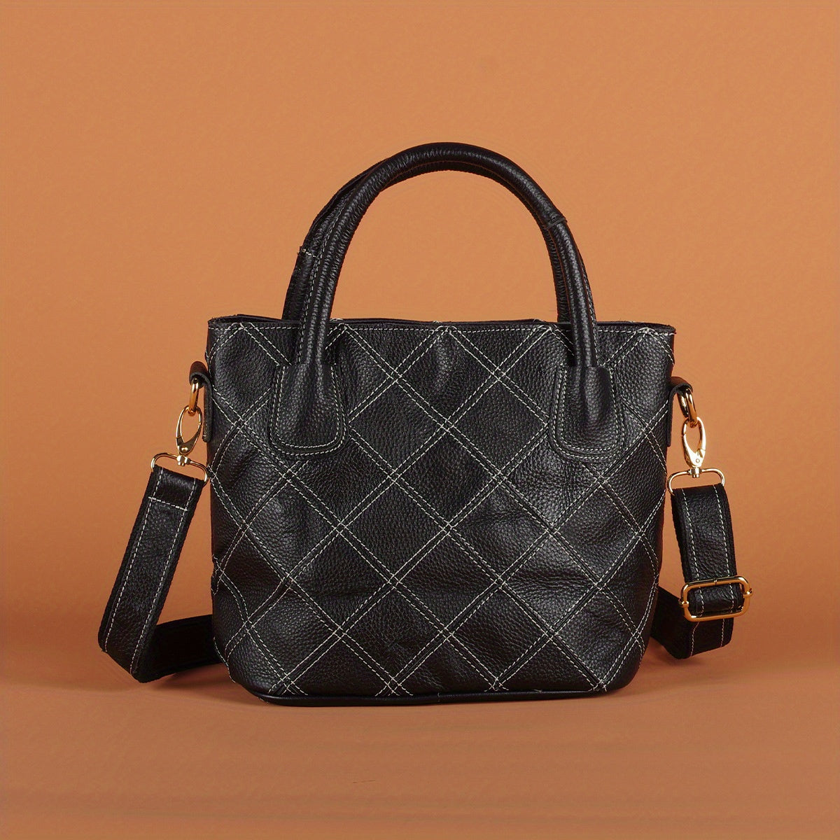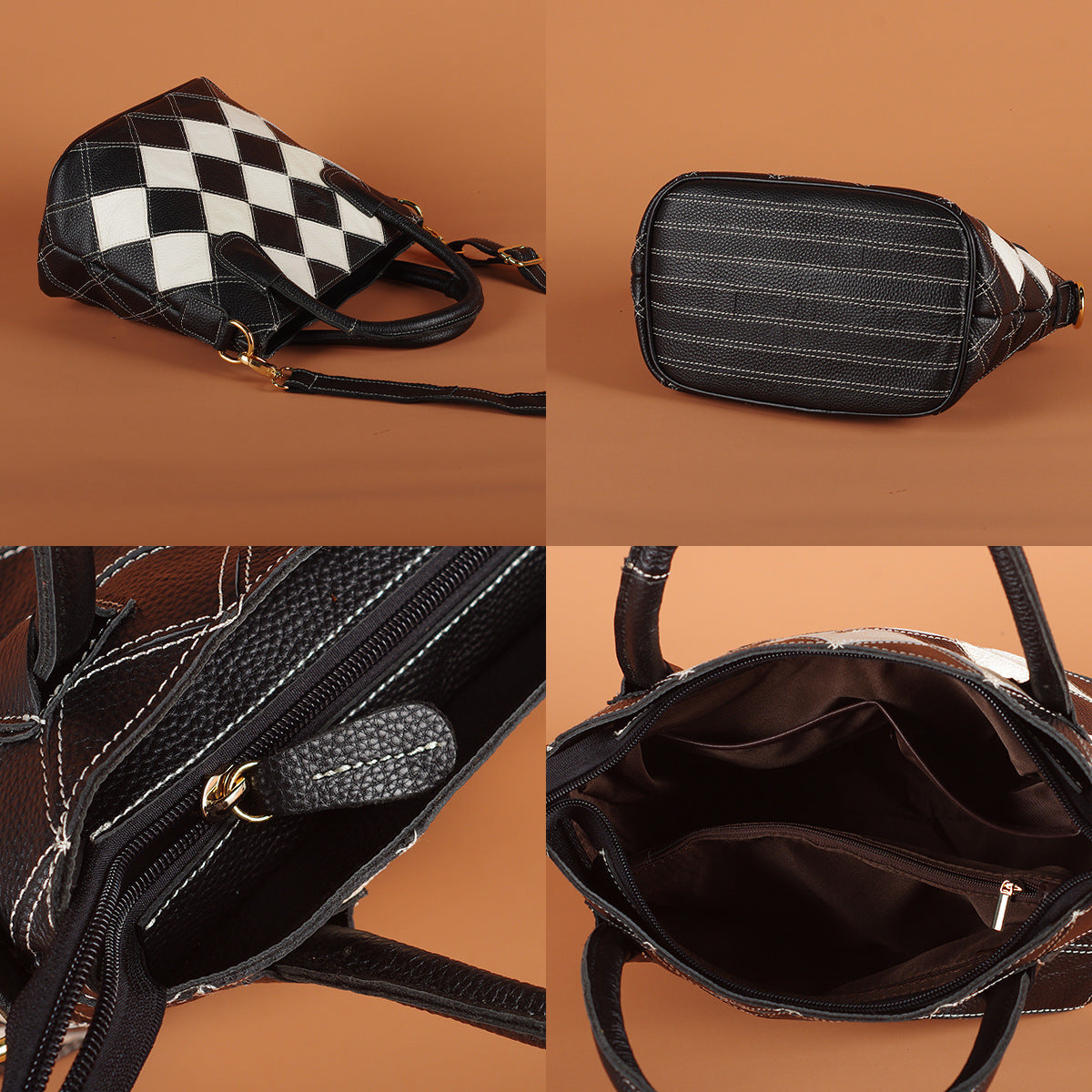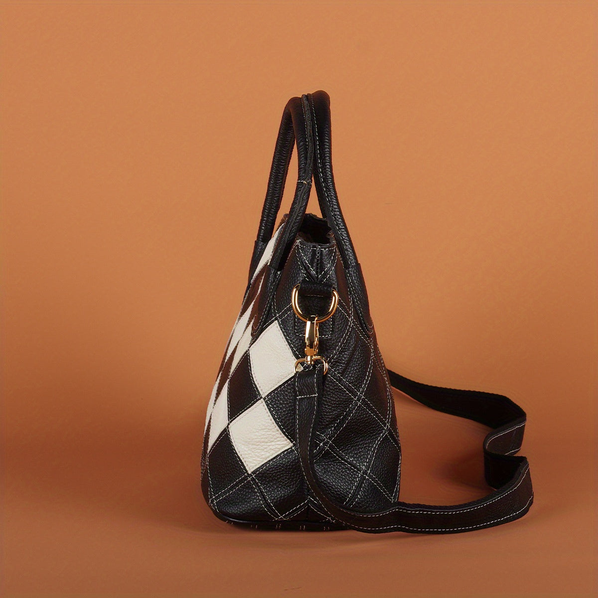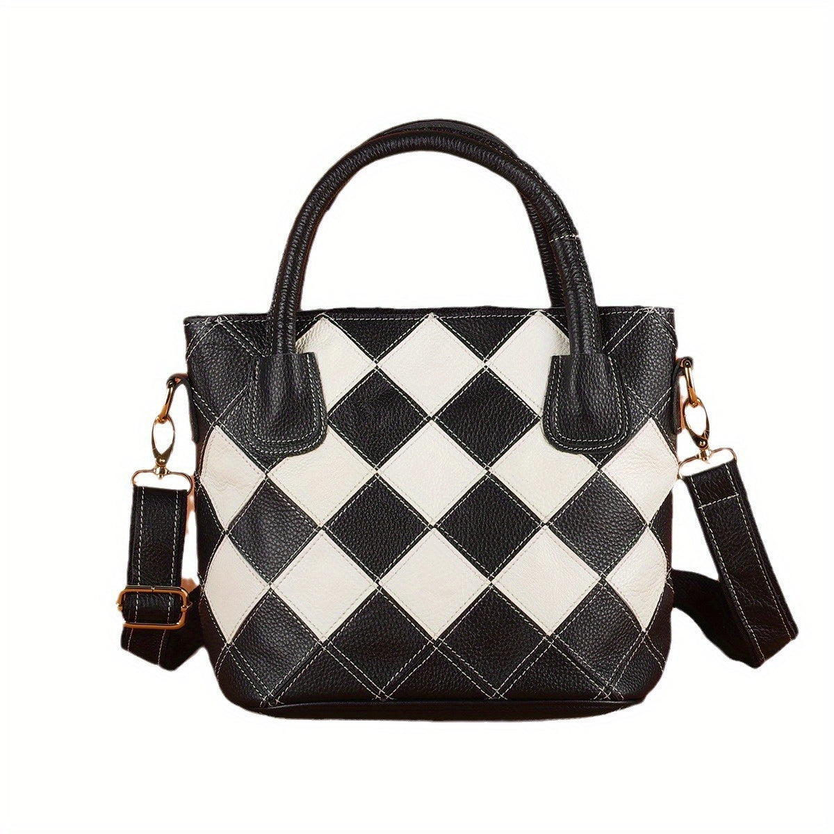 Women'S Black and White Checkered Genuine Leather Tote Bag - Stylish Shoulder Crossbody with Golden-Tone Hardware, Zipper Closure, and Detachable Strap for Casual or Formal Occasions, Versatile Carryall, Elegant Accessory, Durable Construction