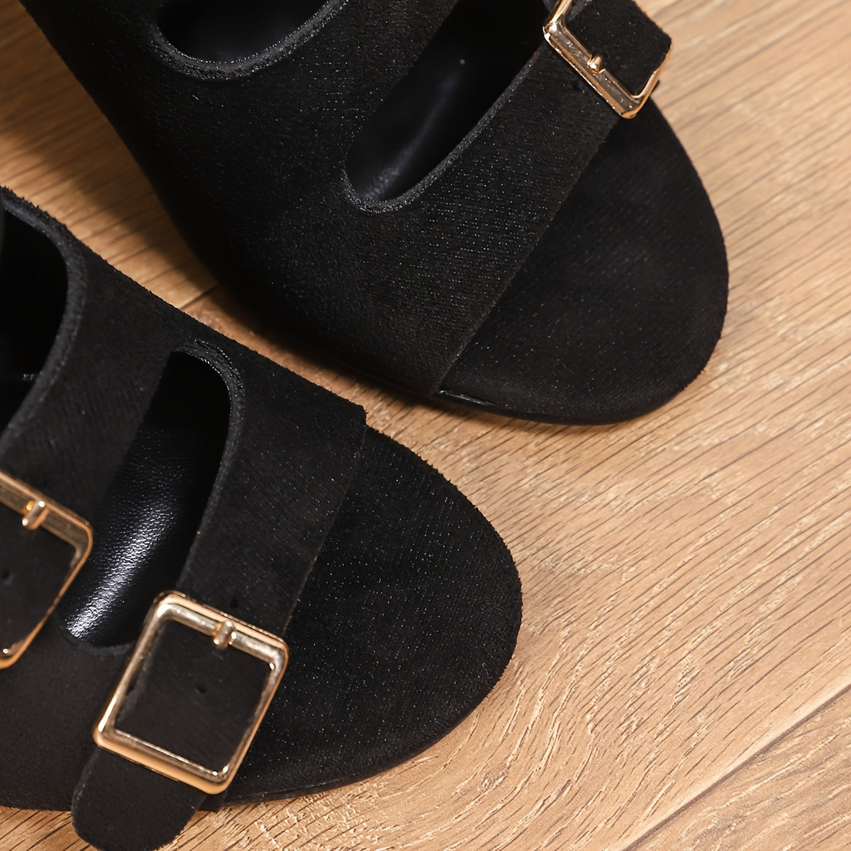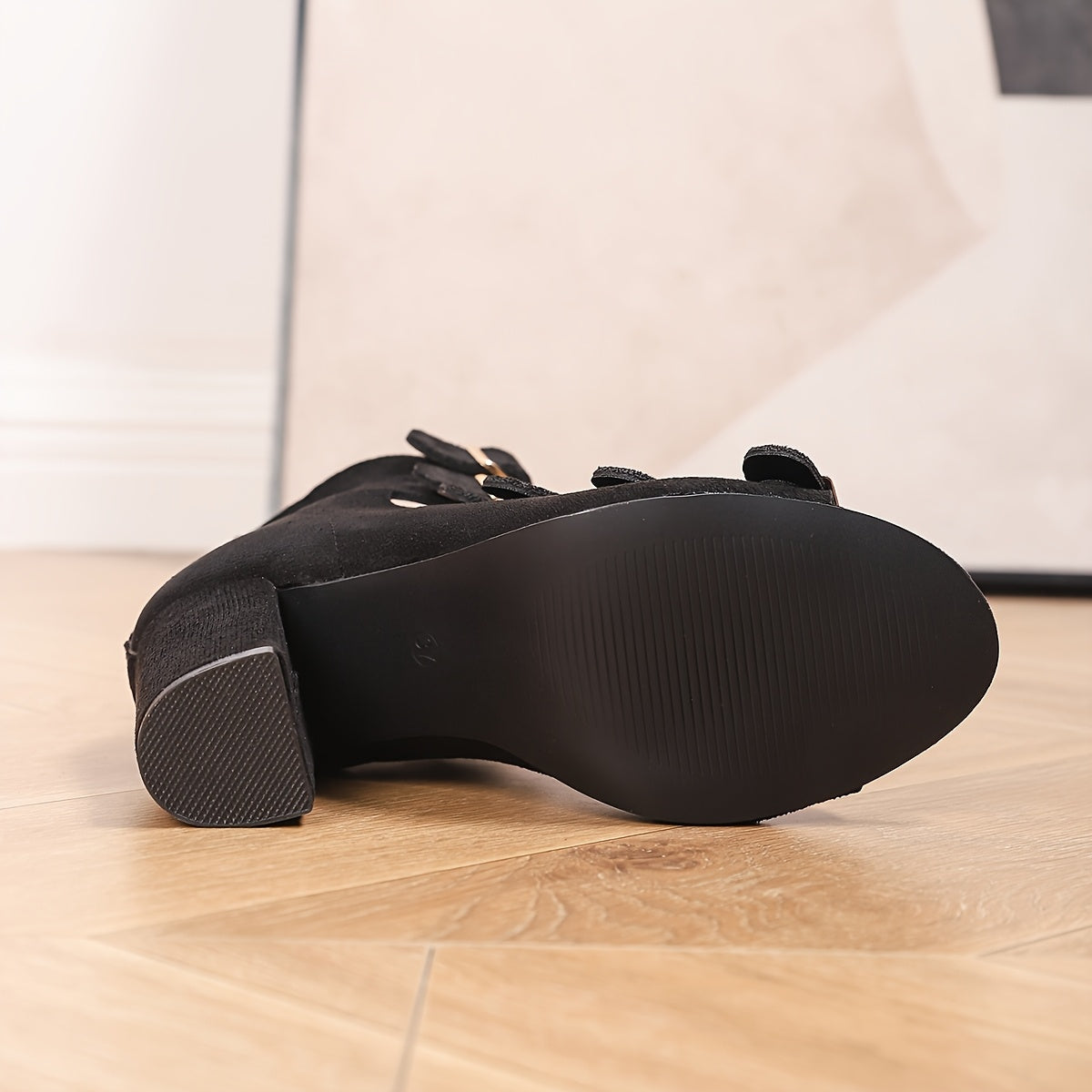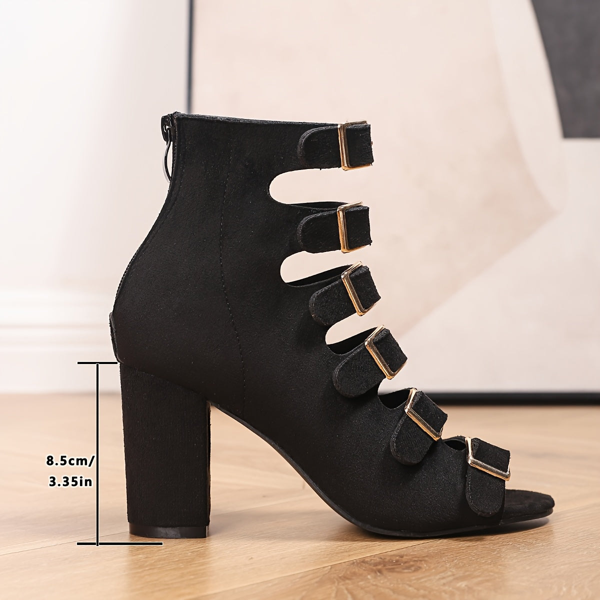 Women's Black Block Heel Sandal Boots - Fashionable Open Toe, High-Zip Back, Breathable Cut-Out Design with Golden Buckles, Versatile for All Seasons, PU Cover Upper & Rubber Sole, Versatile Heels | Gladiator Style Boots | Elegant Golden Accents