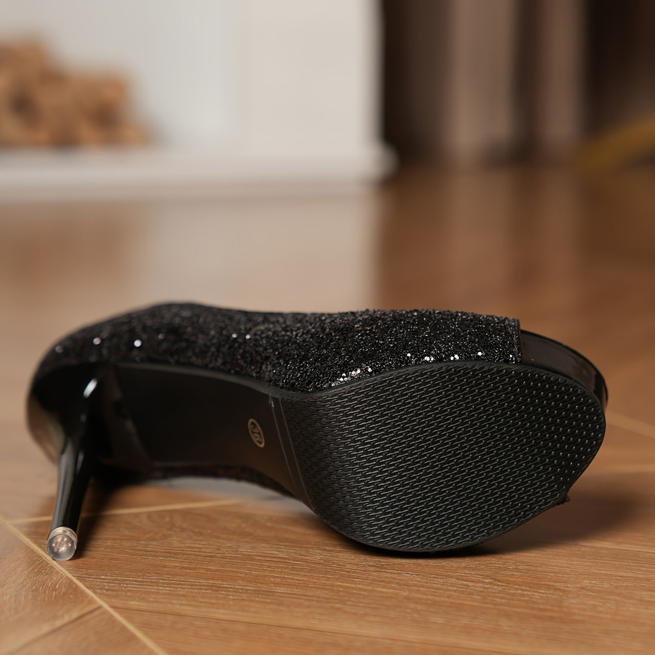 Women's Black Glitter Stiletto Heels - Open-Toe Ultra-High Stiletto Heels with Sparkling PU Synthetic Cover & Non-Slip Rubber Sole for Nightclub, Party, Formal Events, Nightclub Footwear, Elegant Shoe Design